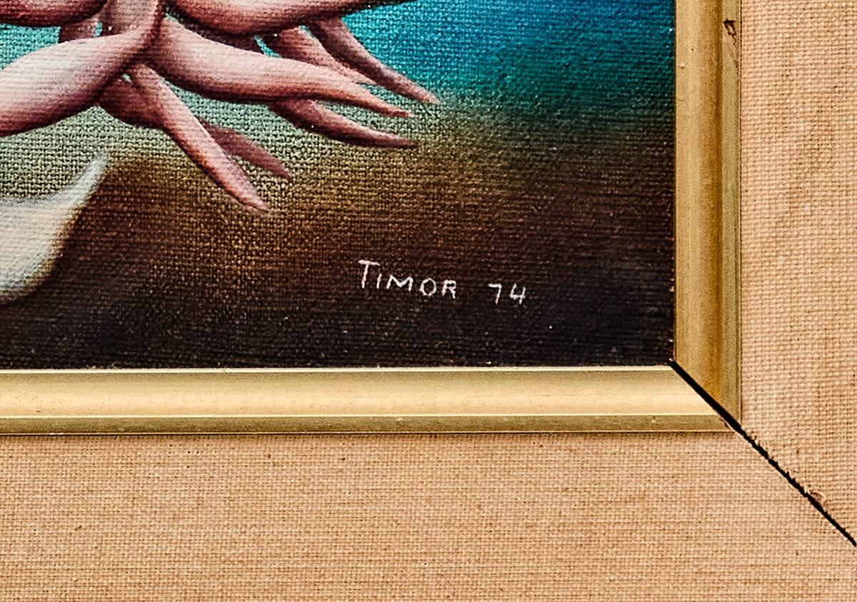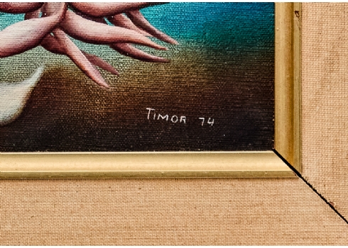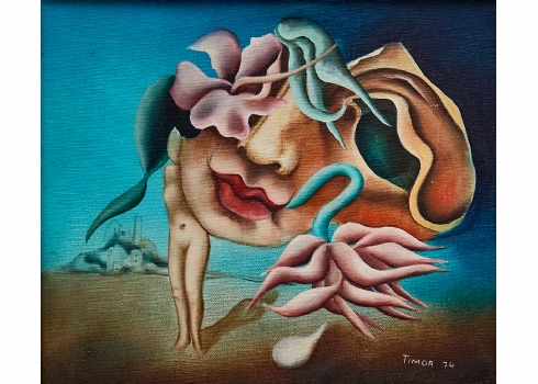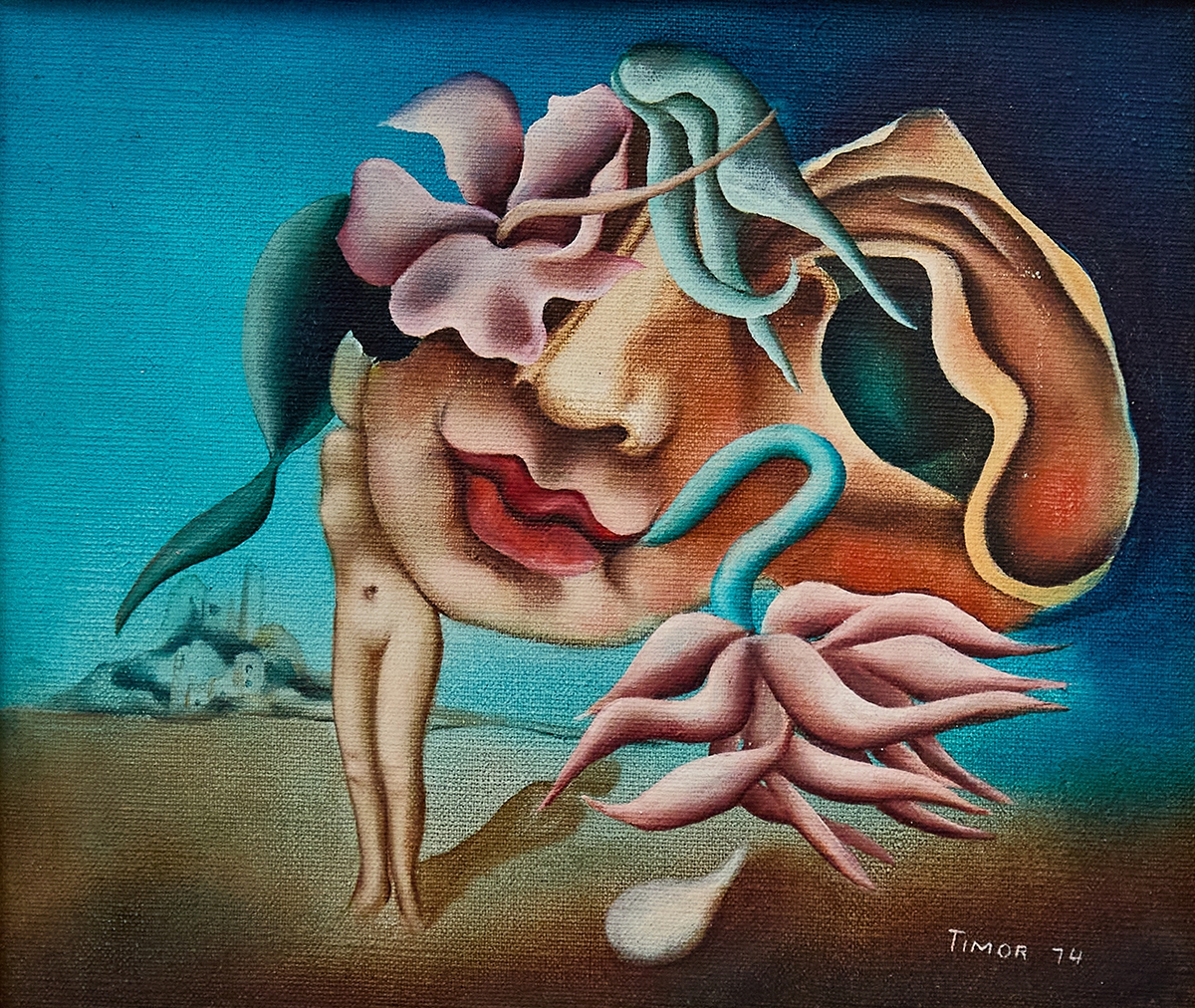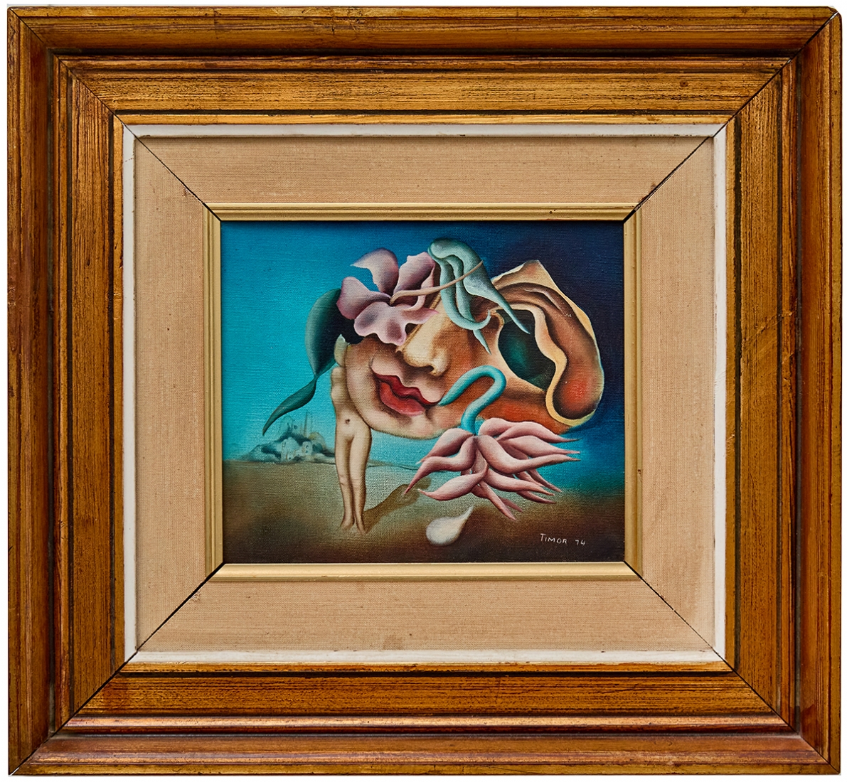 רחל טימור - 'אישה בנוף סוריאליסטי', שמן על בד צרפתי חתום ומתוארך 1974
