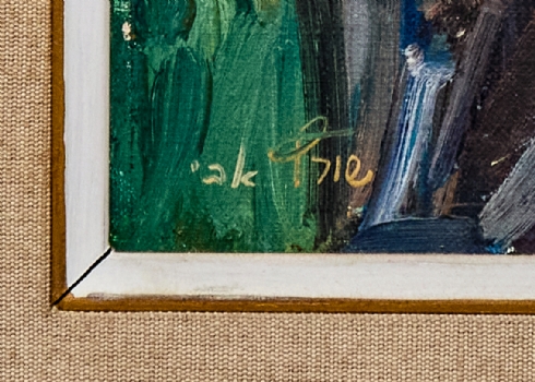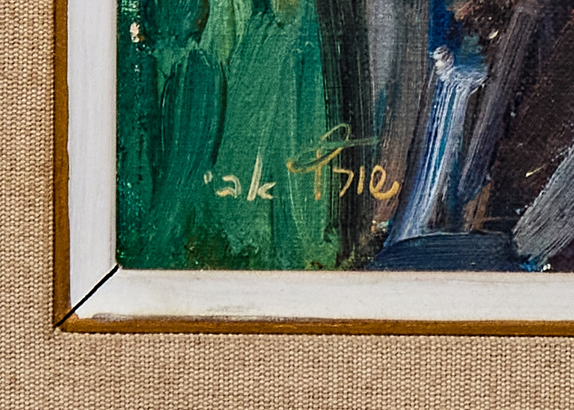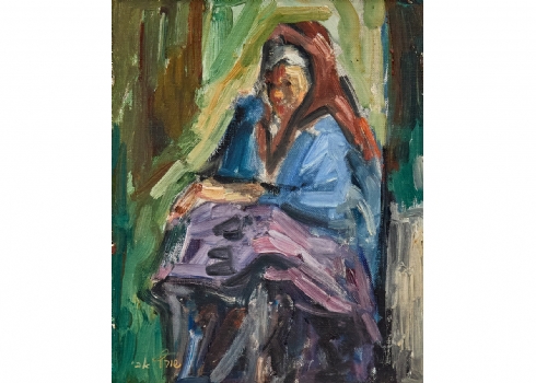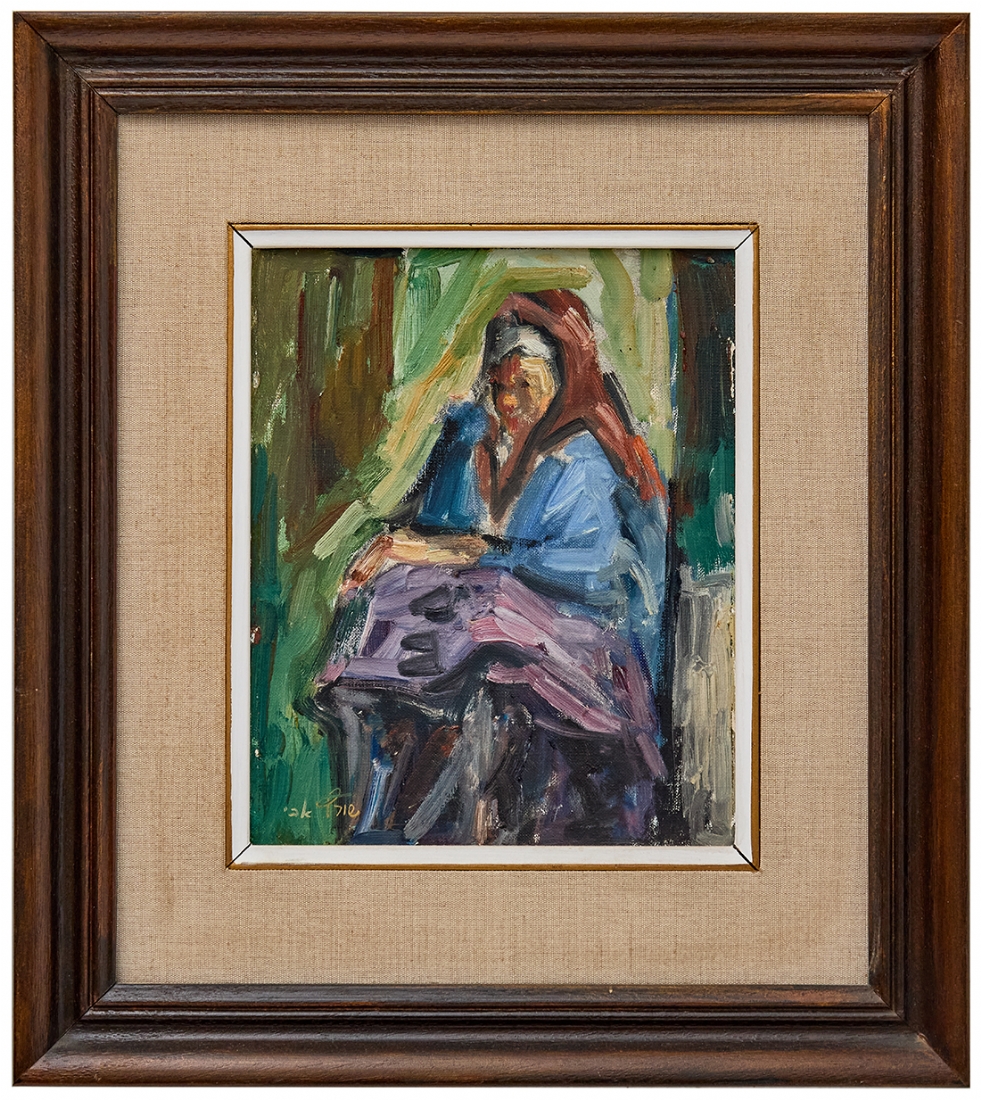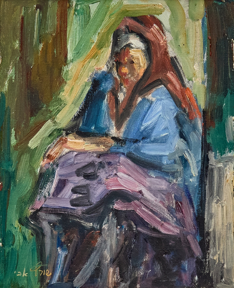 אבי שוורץ, אישה זקנה מכוסה שמיכה סגולה, שמן על בד צרפתי חתום