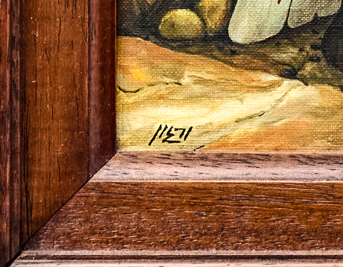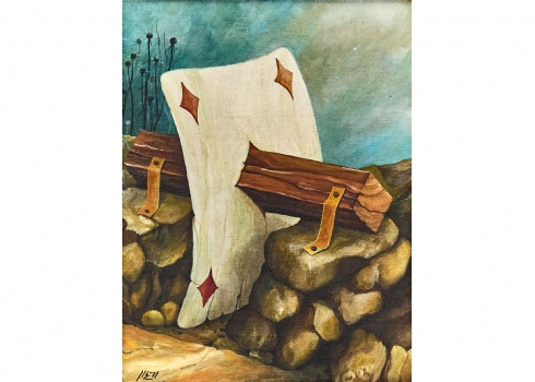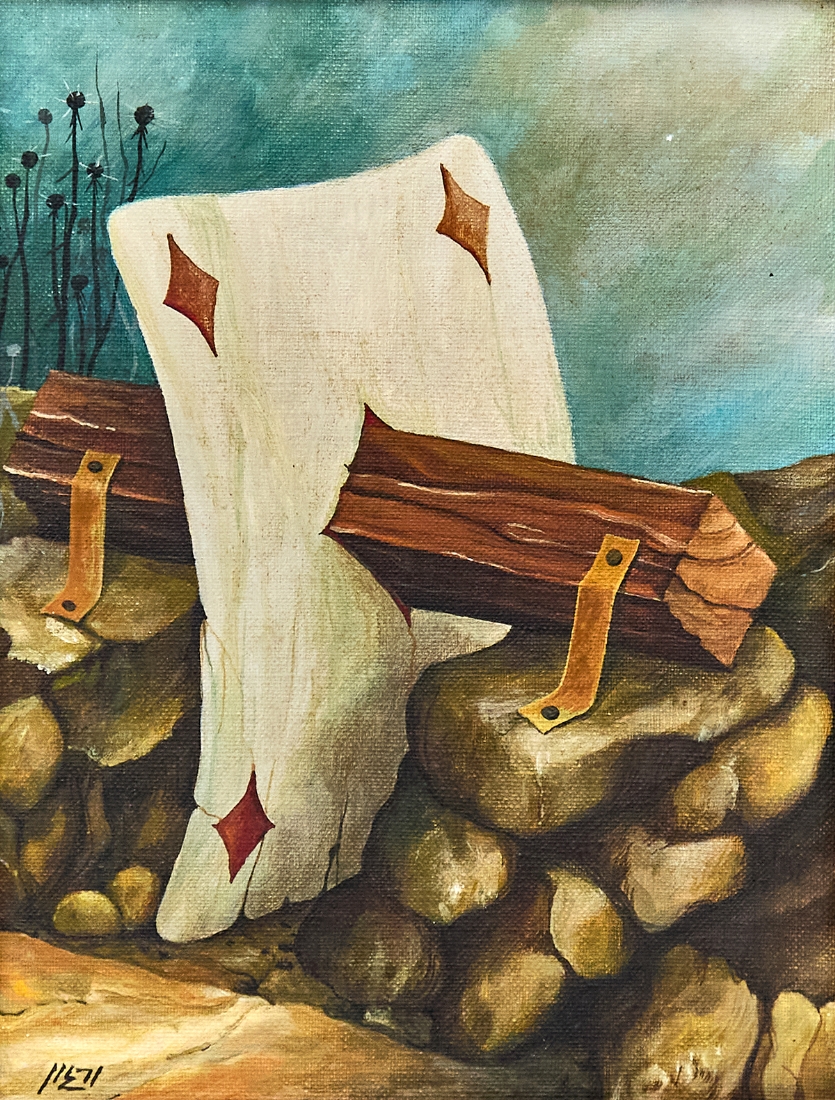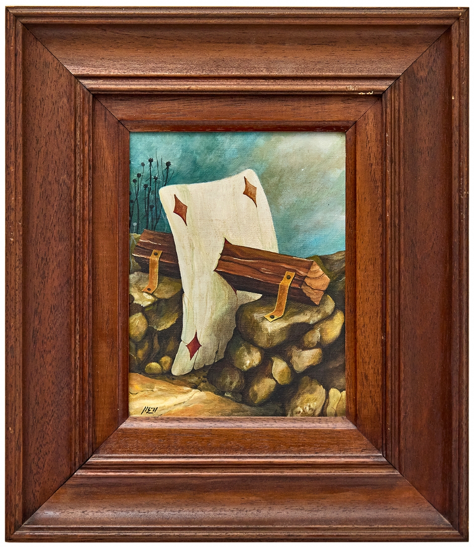 ורגון (Vargon) - 'קלף משופד על קורת עץ בנוף סוריאליסטי', שמן על בד צרפתי, חתום