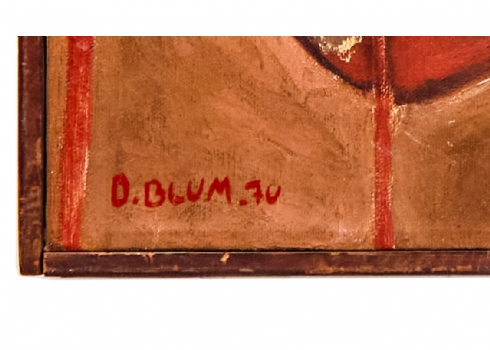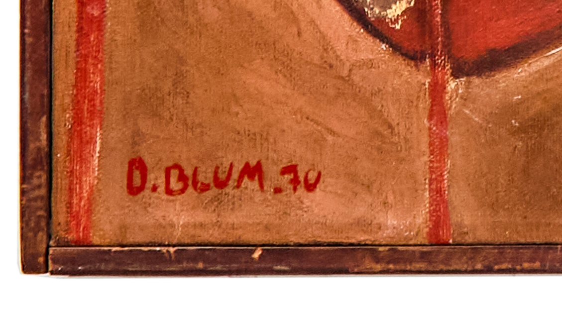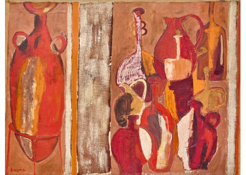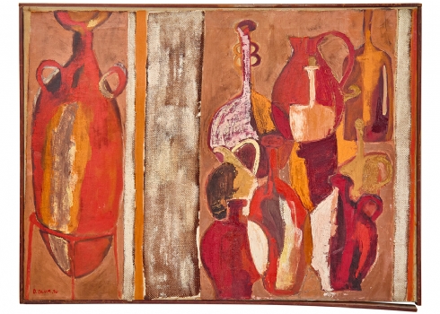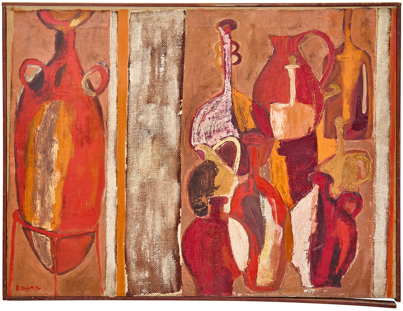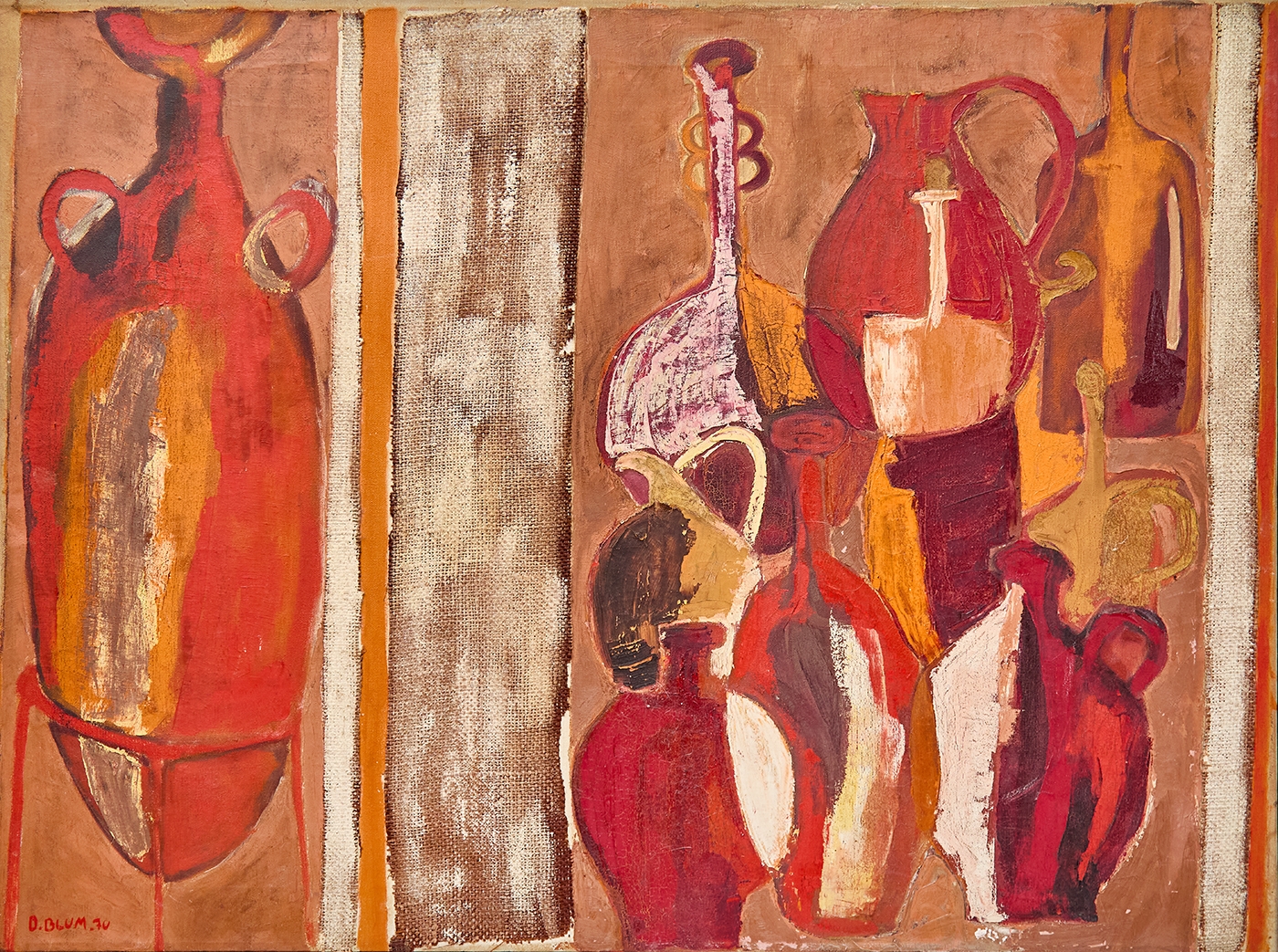 דבורה בלום (Dvora Blum) – 'טבע דומם עם כדים' – שמן על בד בשילוב פסי בד (קולאז')