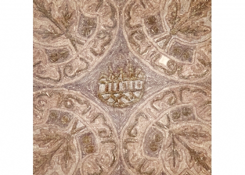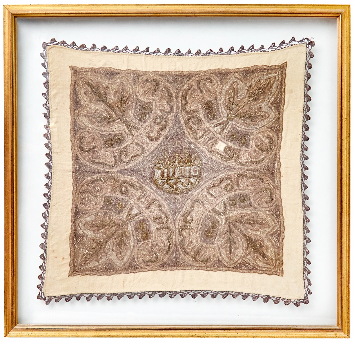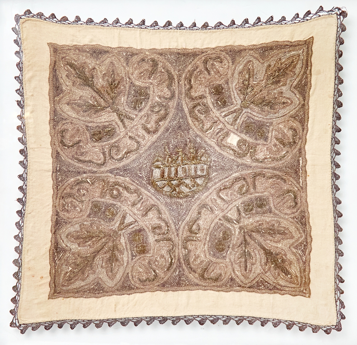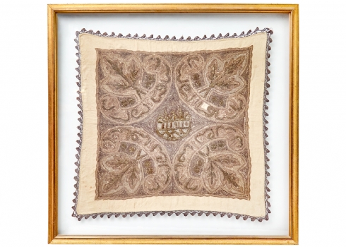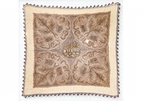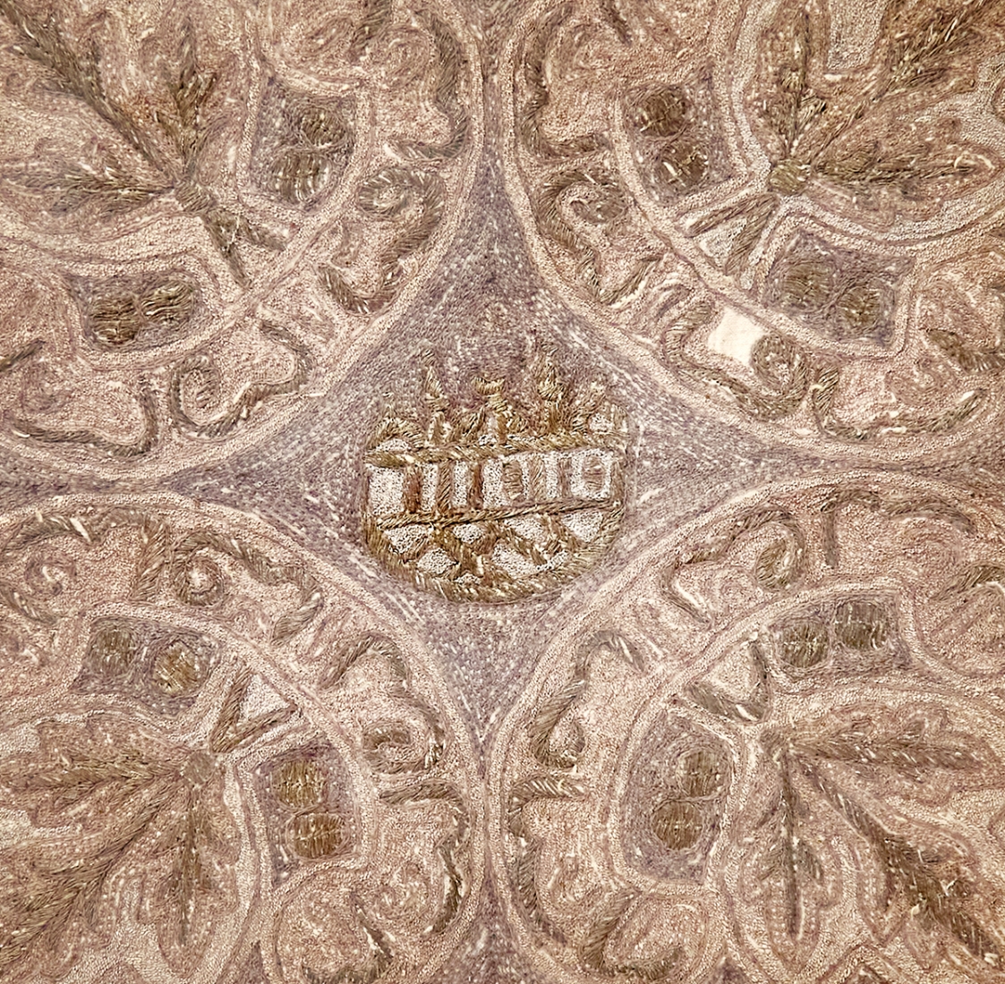 מהתקופה העות'מאנית, עשויה מבד פשתן ועליו רקמה עדינה בחוטי מתכת בצבע זהב וכסף, ככל הנראה בטכניקת רקמת טמבור Tambour Embroidery - tambour chain stitch crewel needlework)