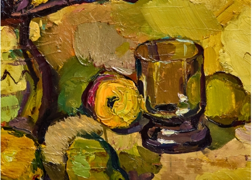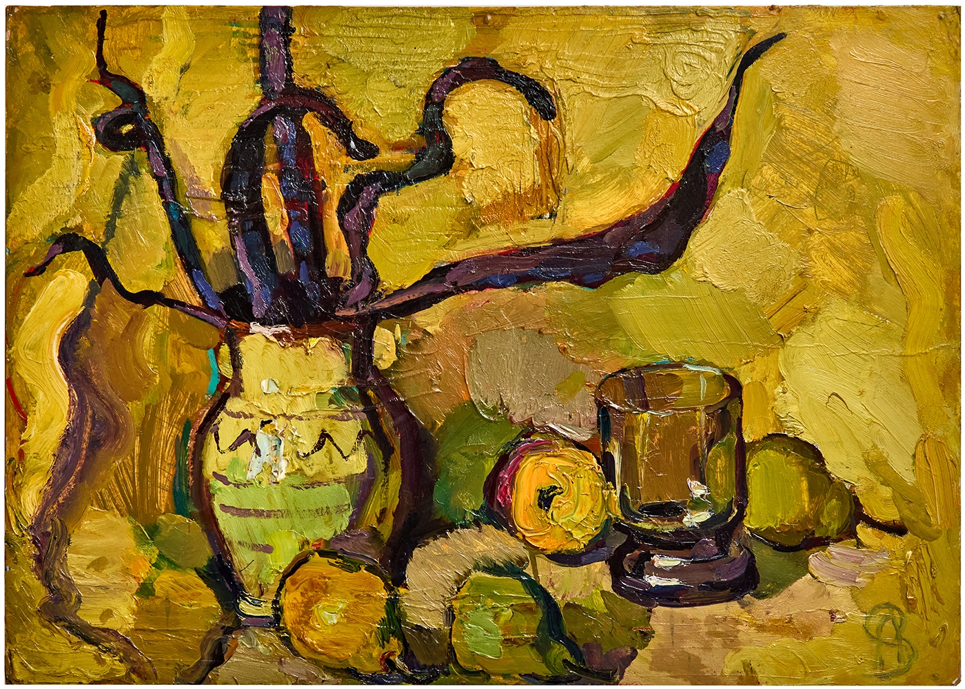 אנה זילברמן (Anna Zilberman, 1935-2000) 'טבע דומם עם כד ותפוחים צהובים׳