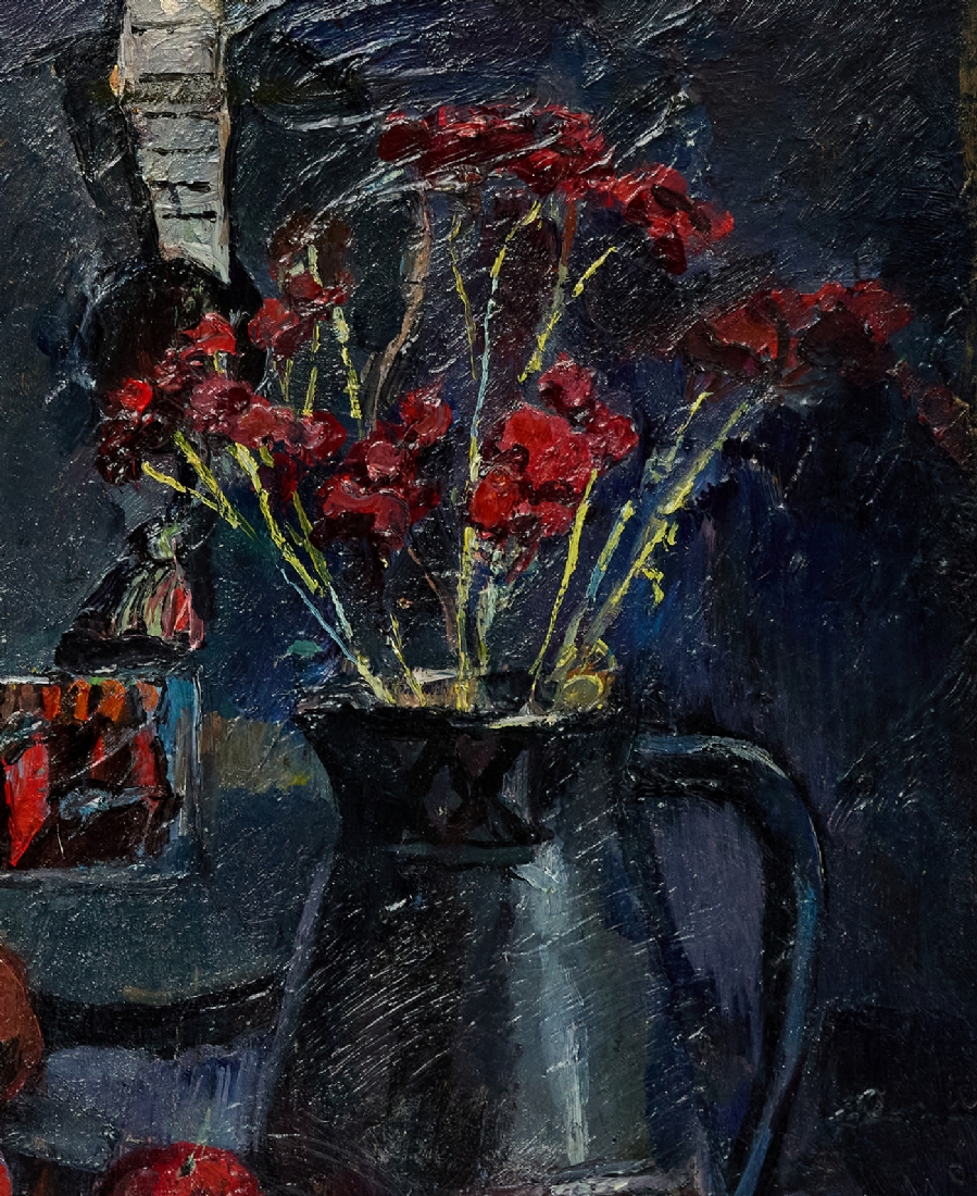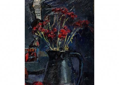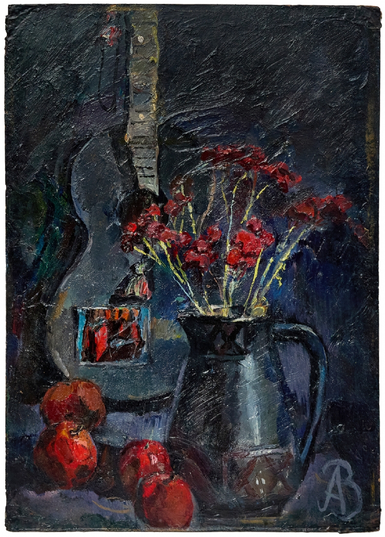 אנה זילברמן (Anna Zilberman, 1935-2000) 'טבע דומם עם גיטרה ופרחי ציפורן׳