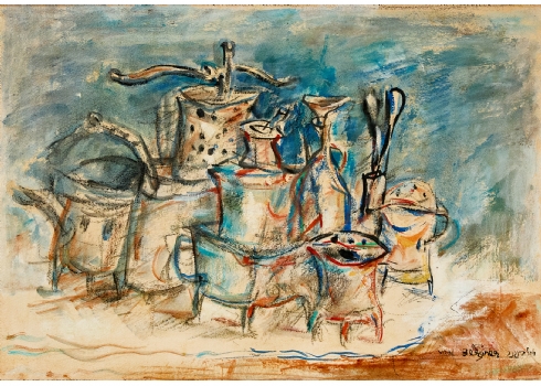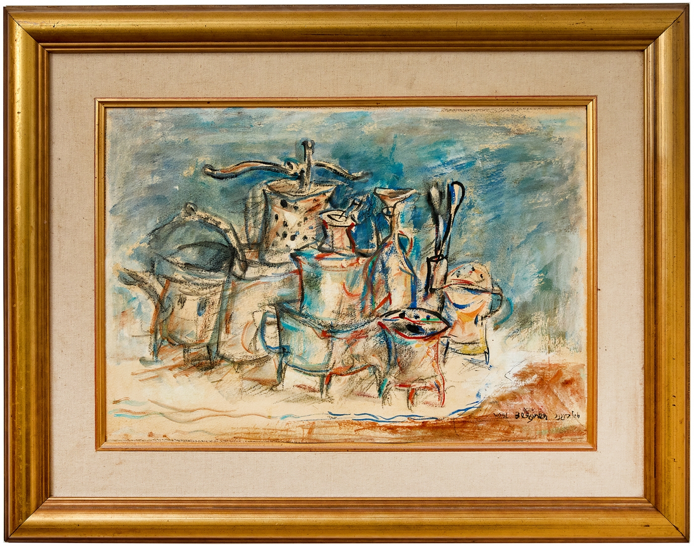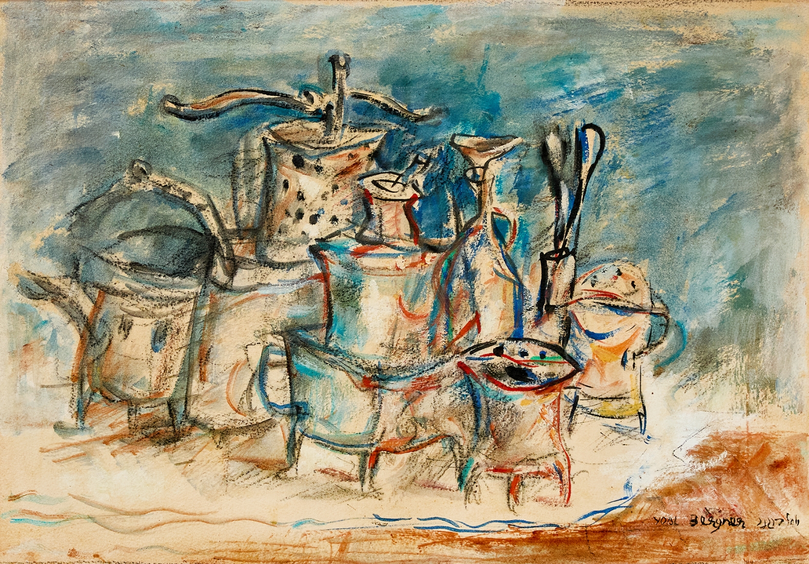 יוסל ברגנר (Yosl Bergner) - 'כלים' - אקוורל על קרטון מוצמד לבד חתום