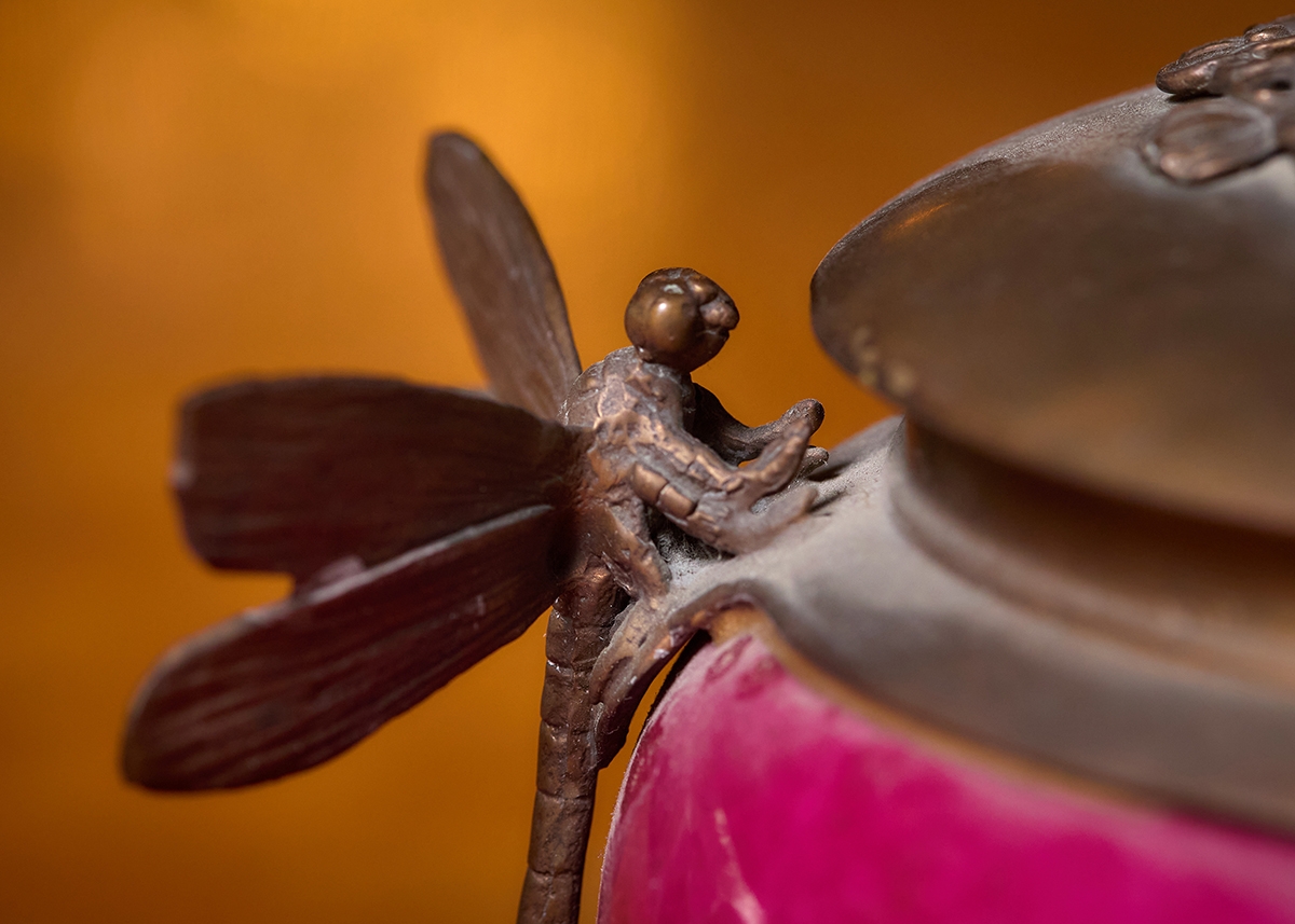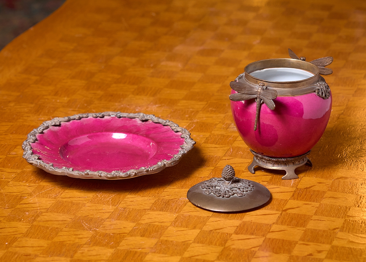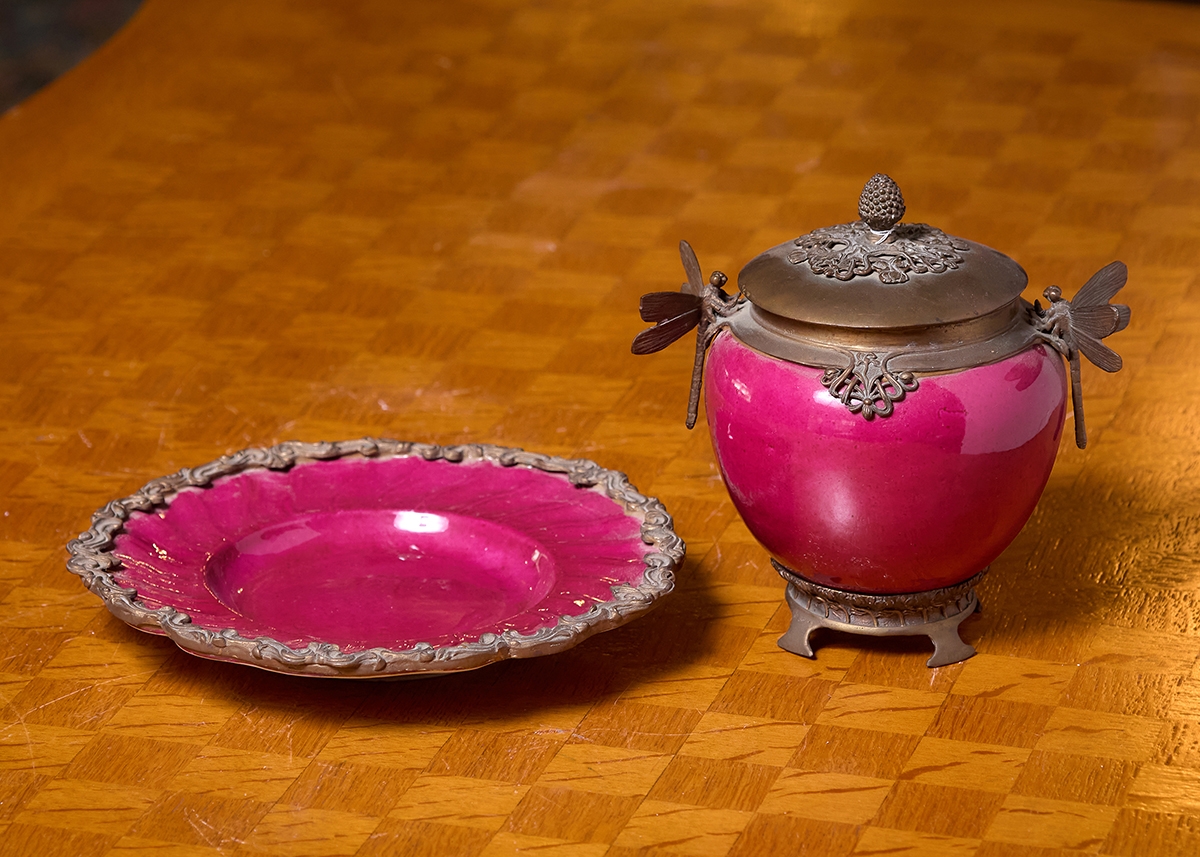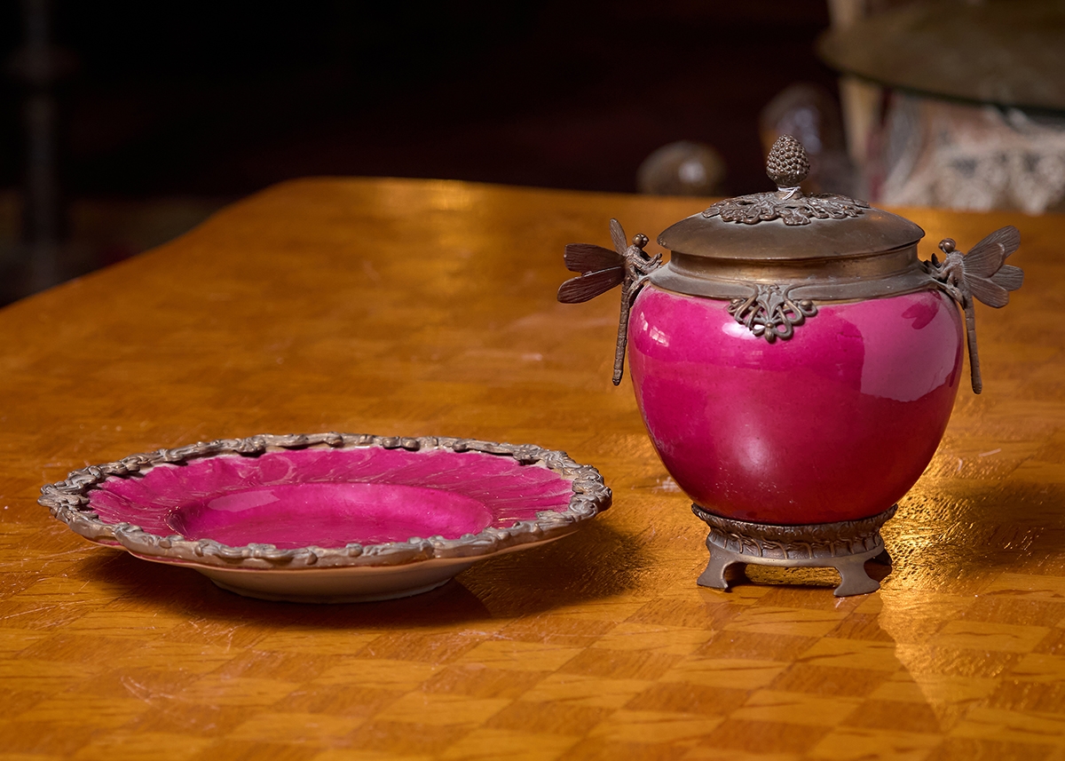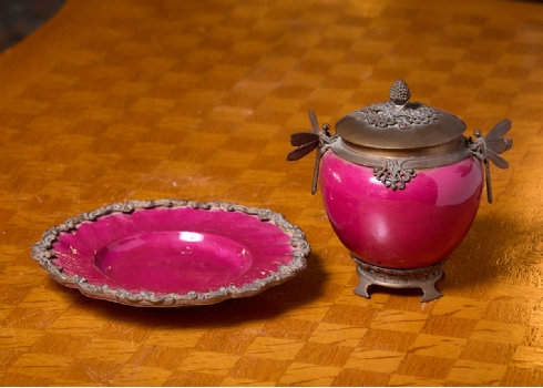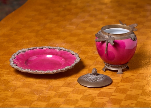 זוג כלי נוי עשויים חרסינה מעוטרים אמייל בגוון ורוד והתקני מתכת
