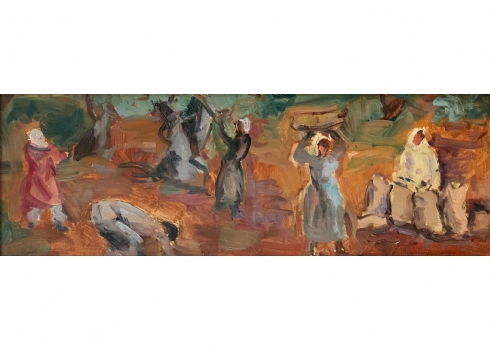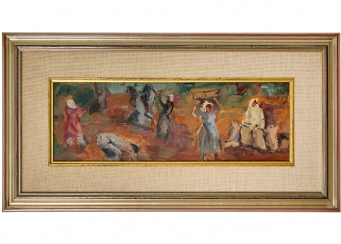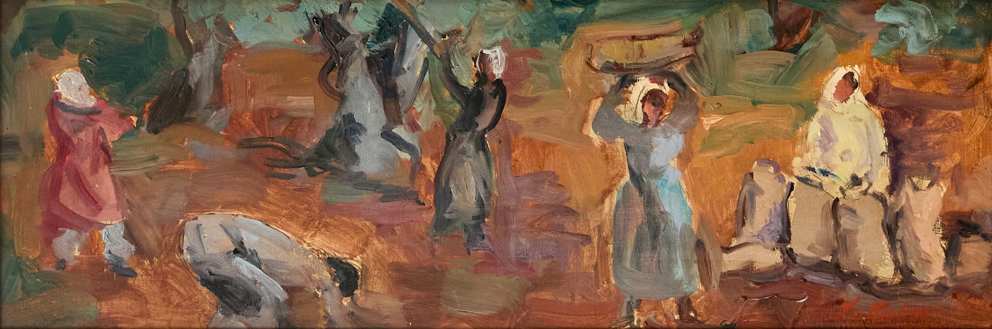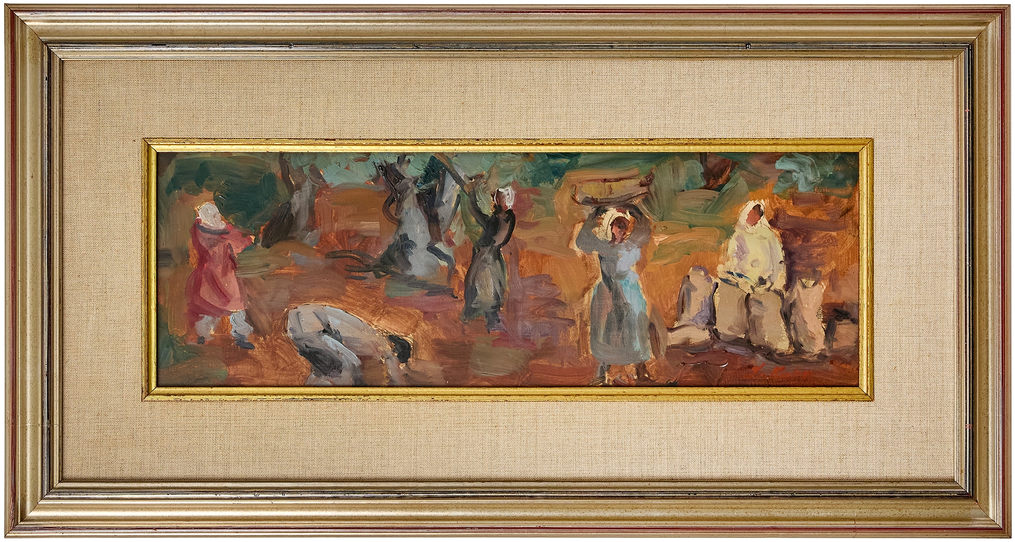 ליאו קאהן - 'נשים ערביות במסיק זיתים' שמן על לוח חתום