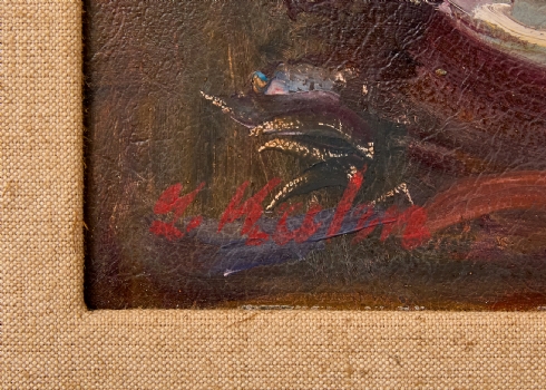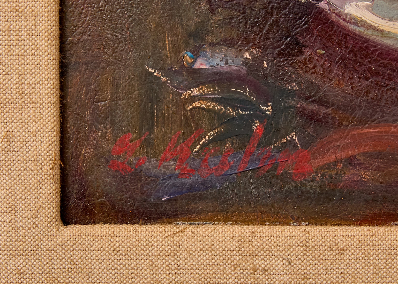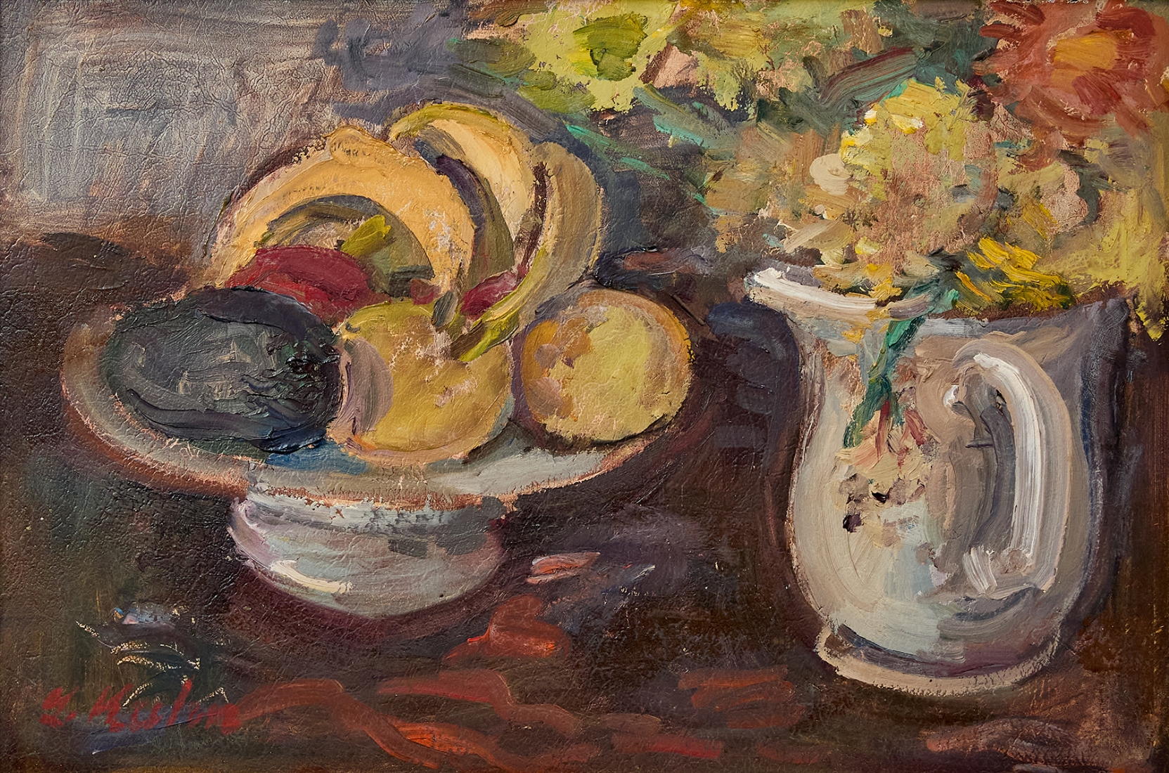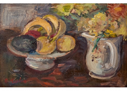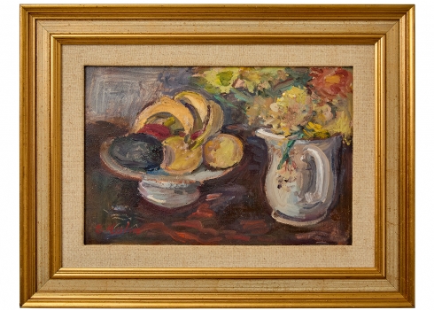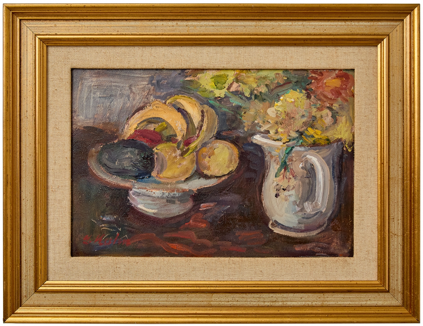 ליאו קאהן - 'כד פרחים וטאזת פירות', שמן על לוח חתום