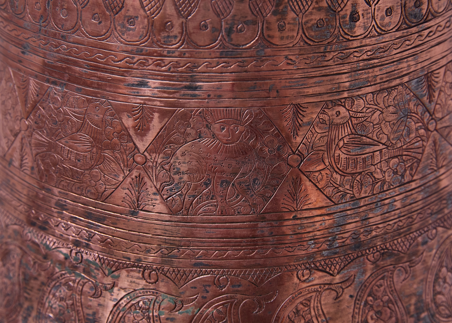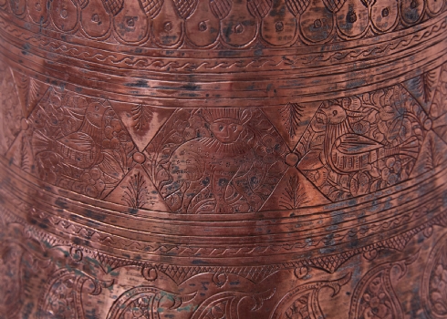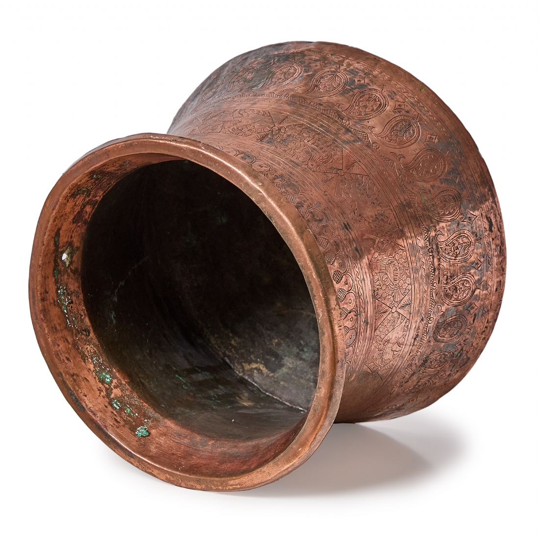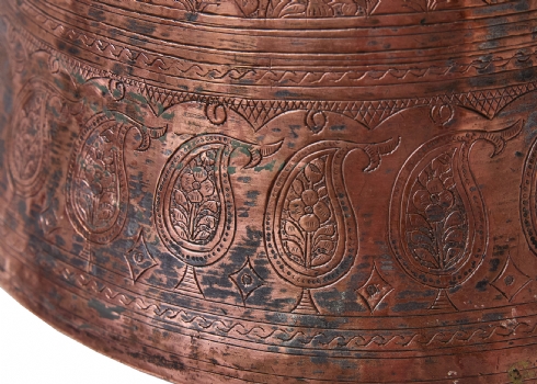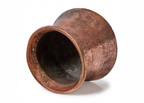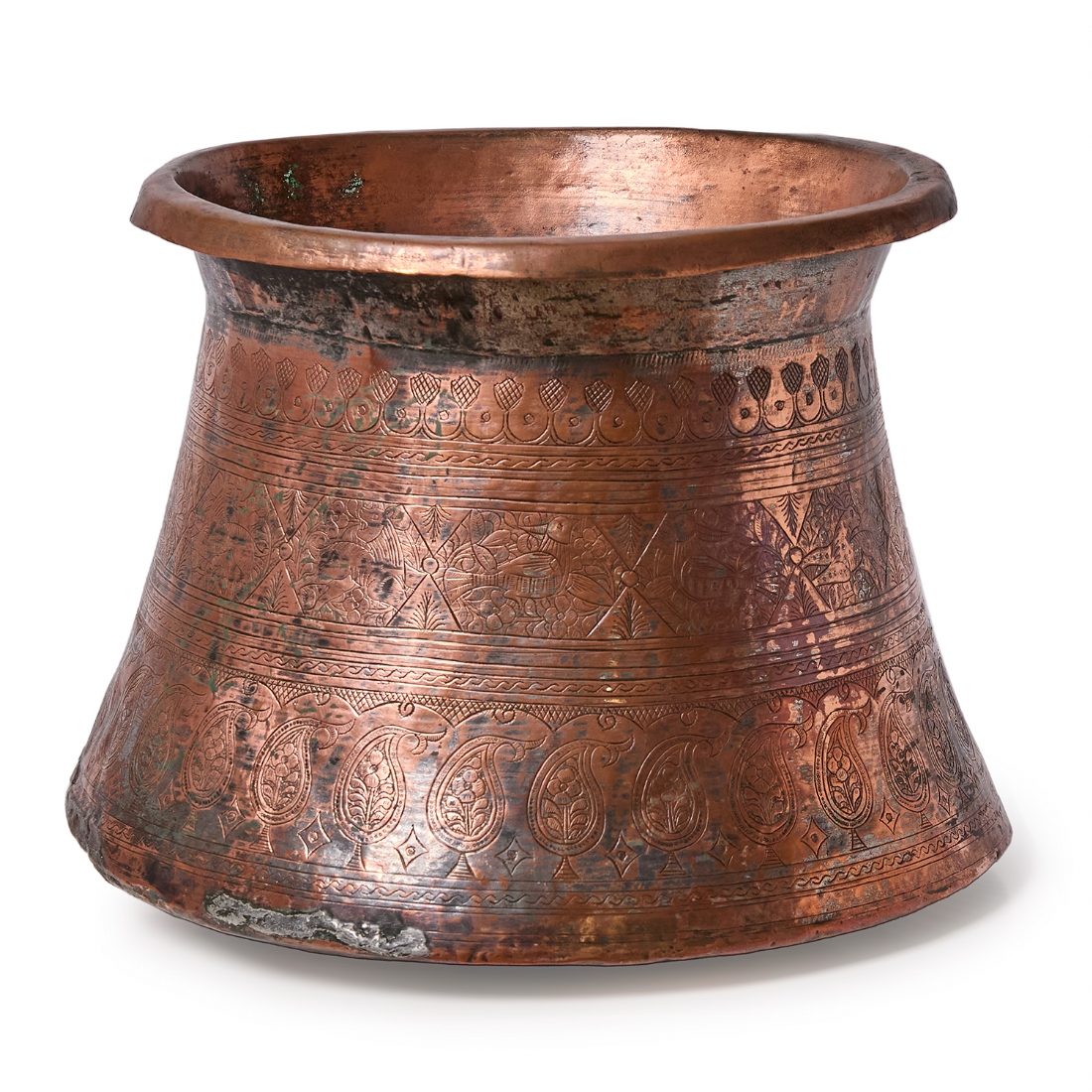 האמרה התחתונה מעוטרת בדגם פייזליבשפה העליונה שני חורים (מקום לידית שחסרה)קוטר 35 ס"מגובה 27 ס"מ