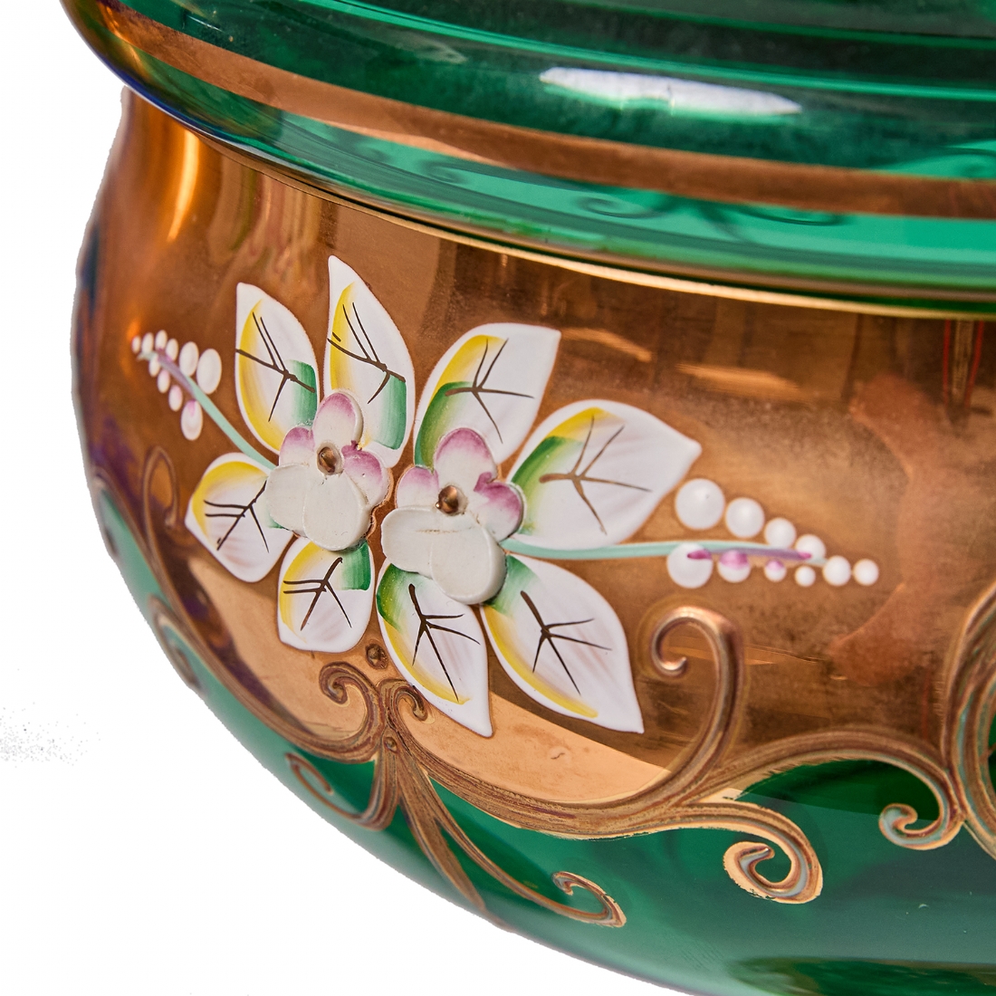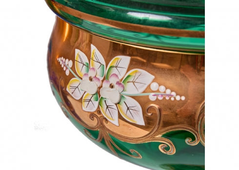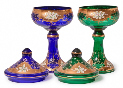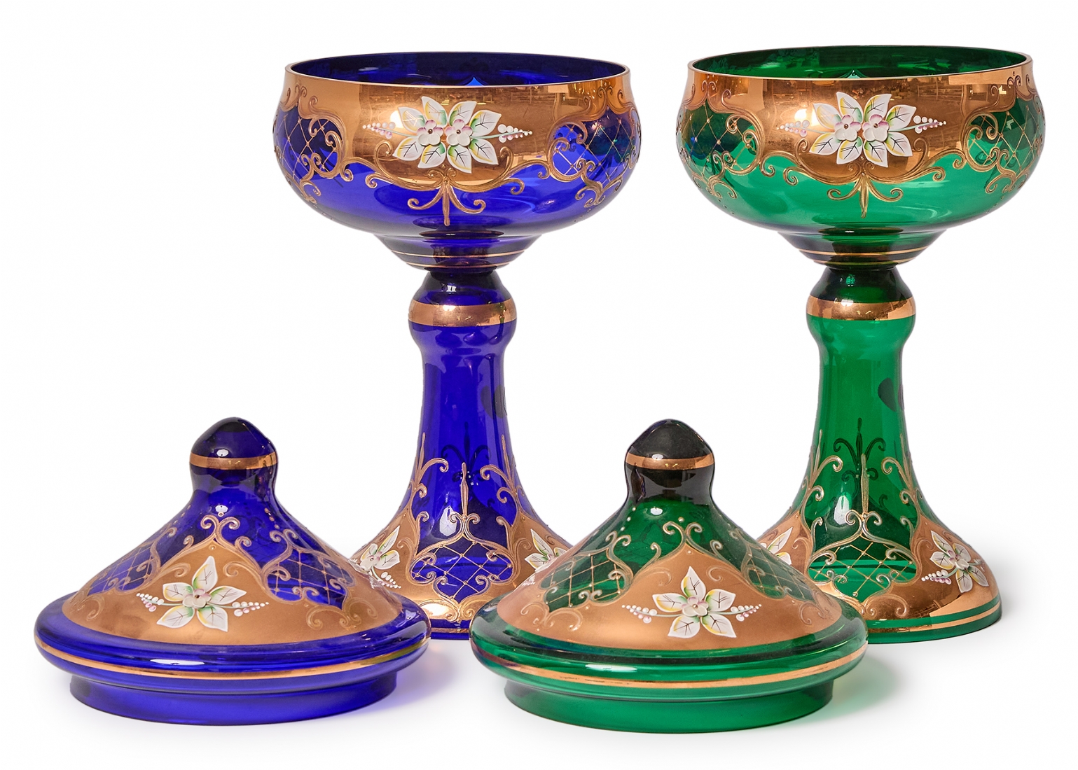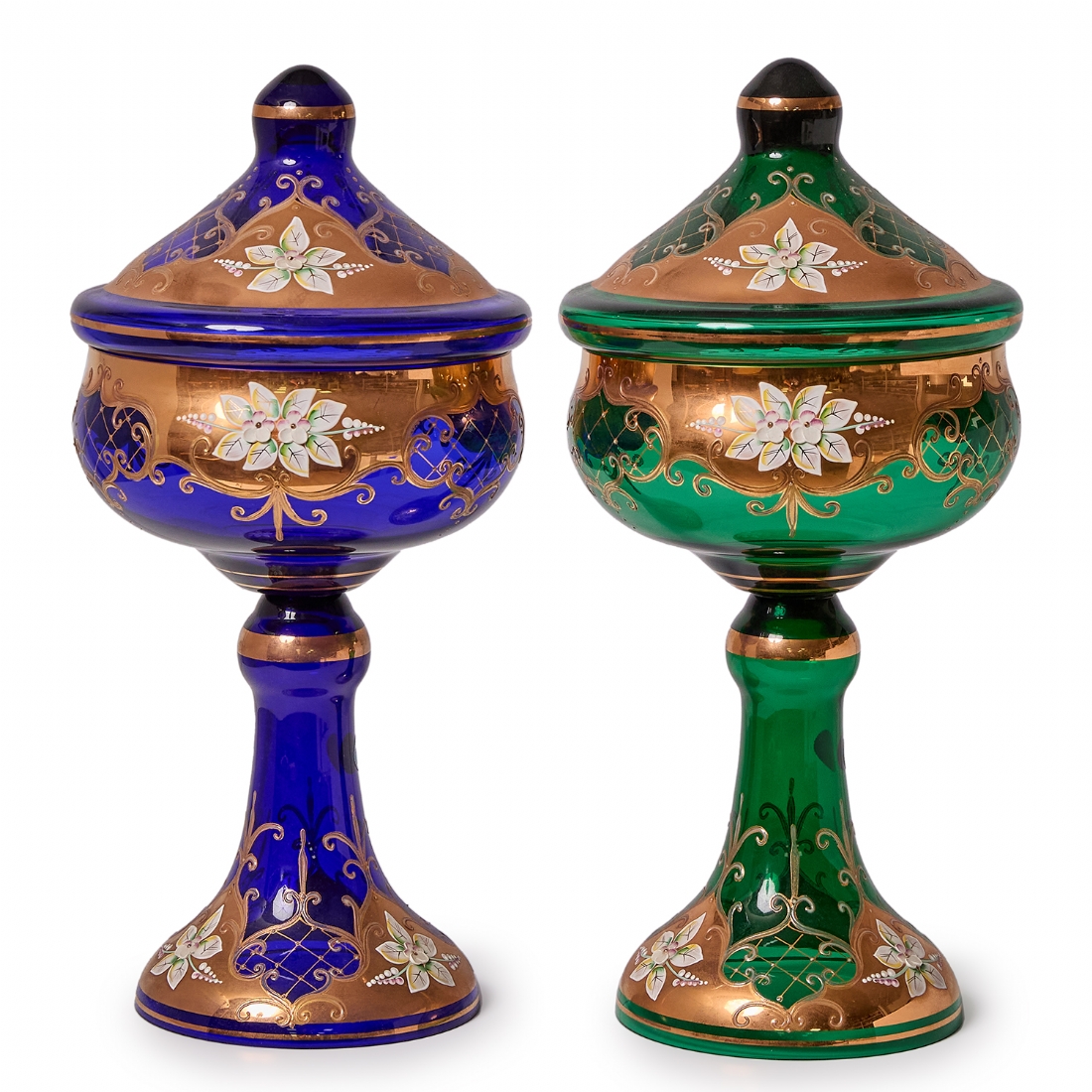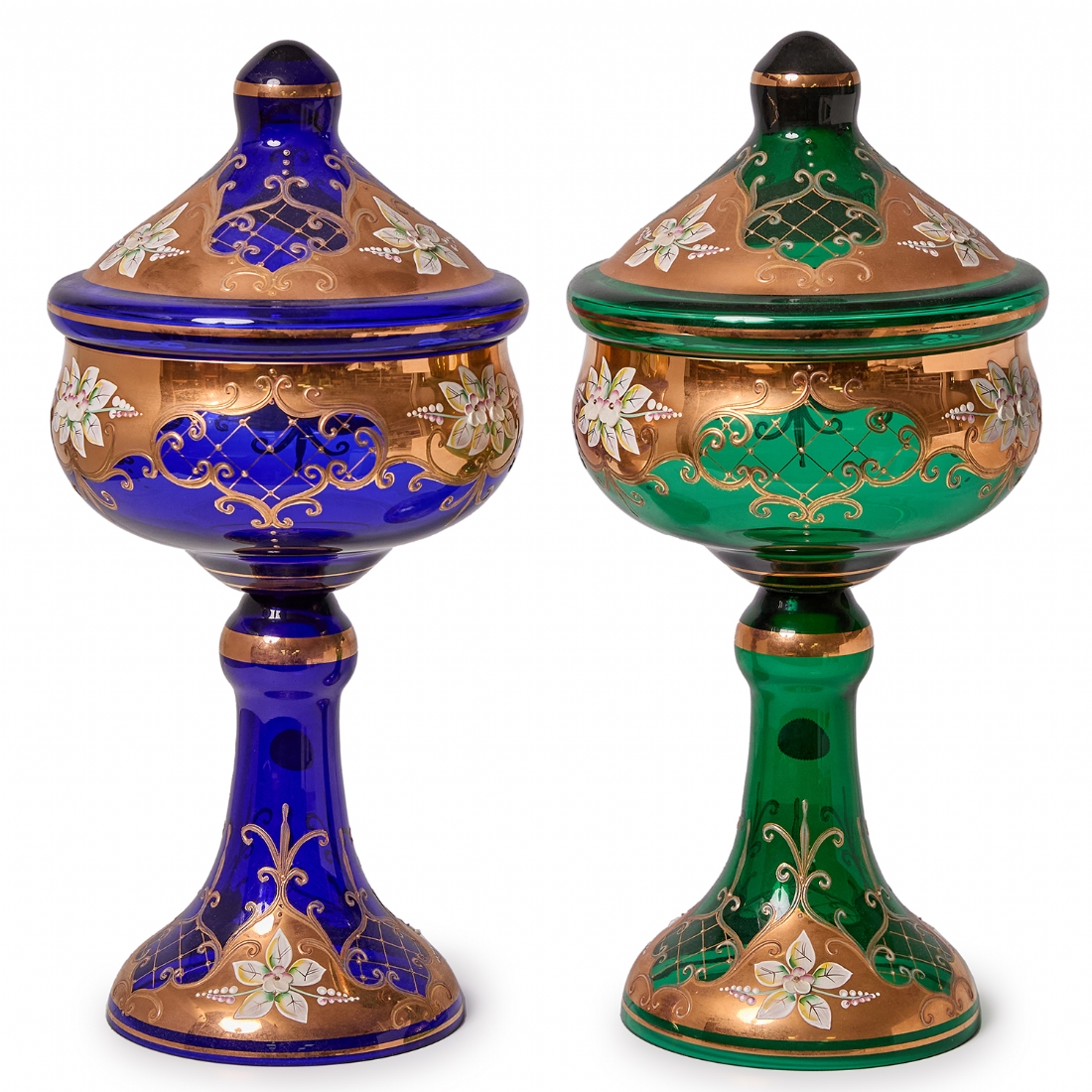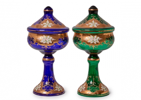 מעוטרים בפרחי אמייל ובזהב ברקע זכוכית אמרלד ירוקה וכחולה (אמרלד, וספיר) גובה כולל 39 ס"מ קוטר 19 ס"מ