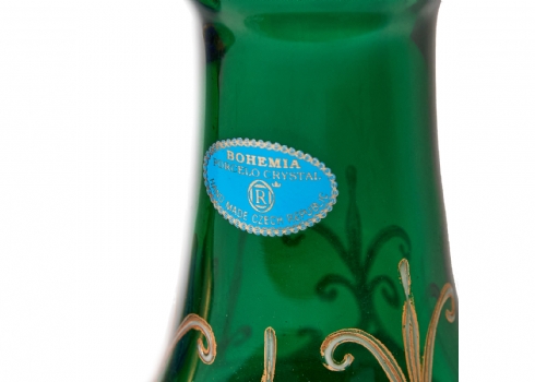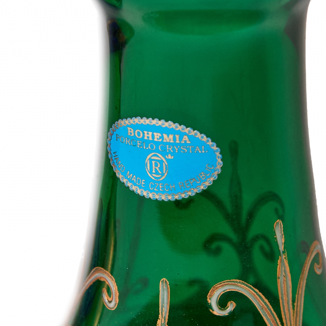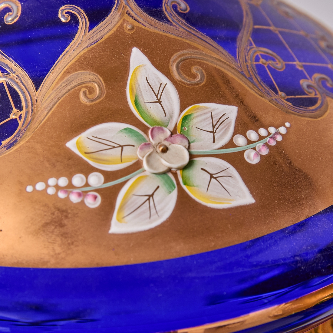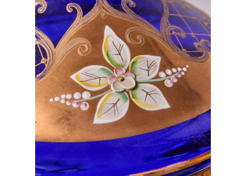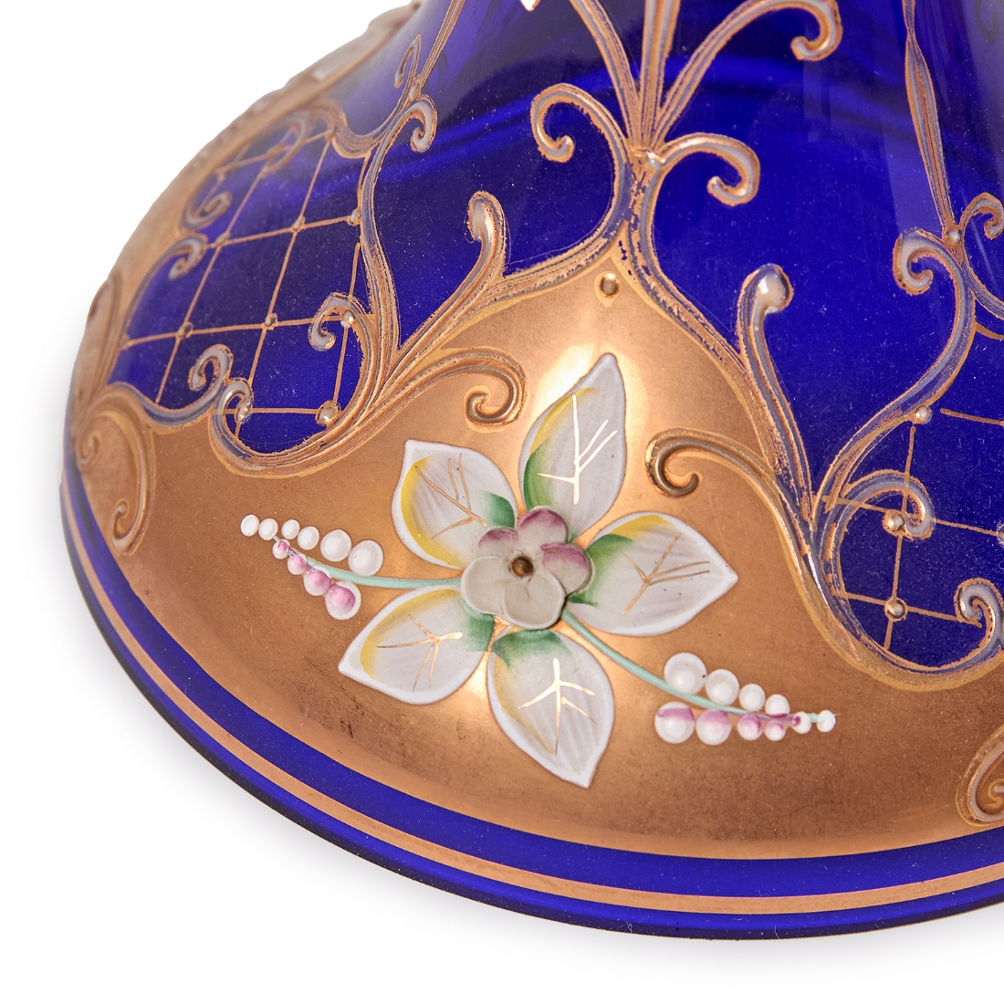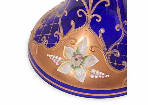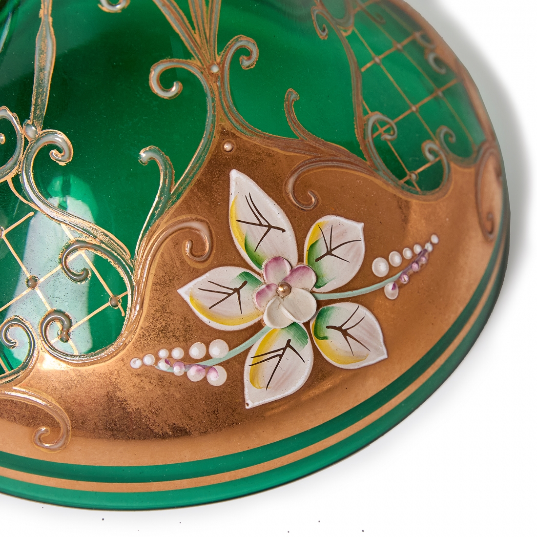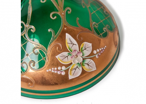 מעוטרים בפרחי אמייל ובזהב ברקע זכוכית אמרלד ירוקה וכחולה (אמרלד, וספיר) גובה כולל 39 ס"מ קוטר 19 ס"מ