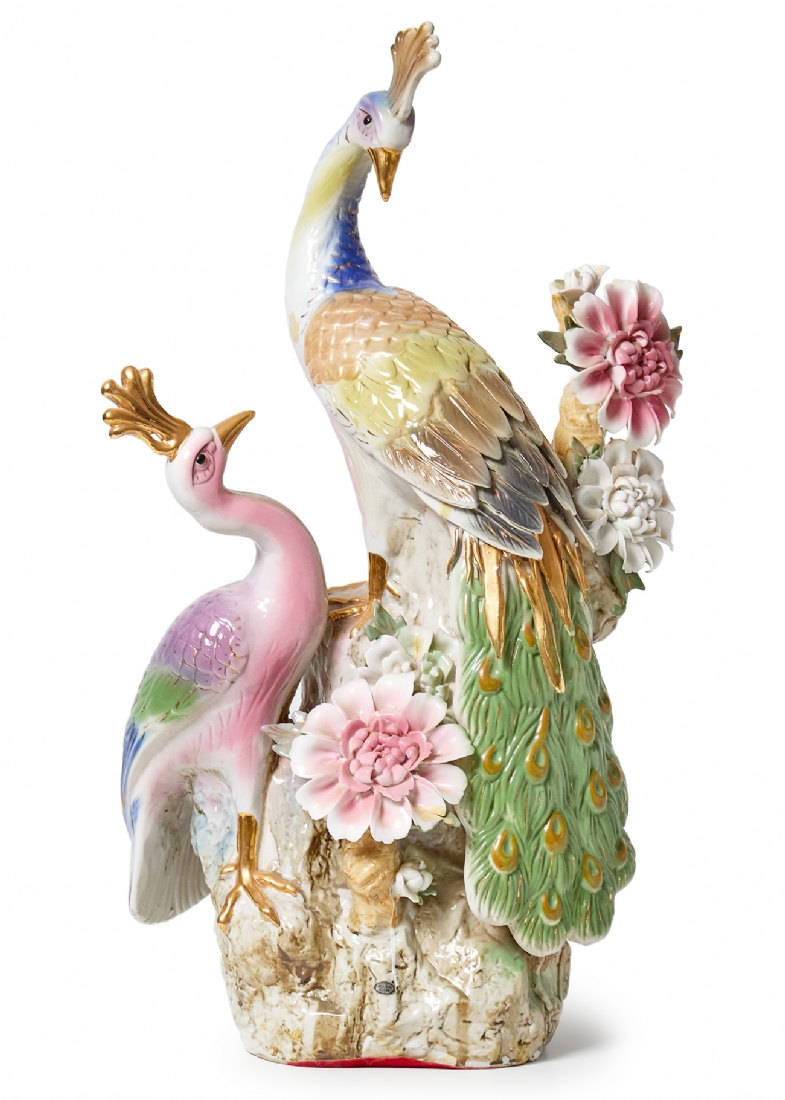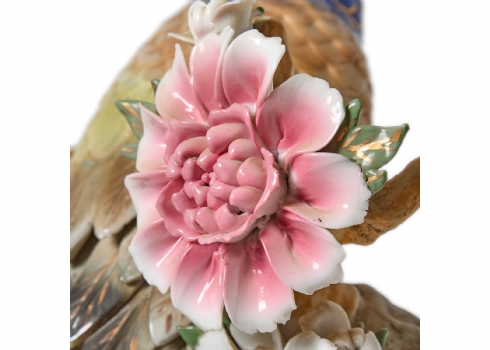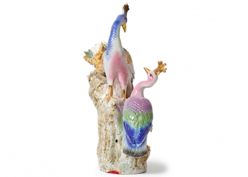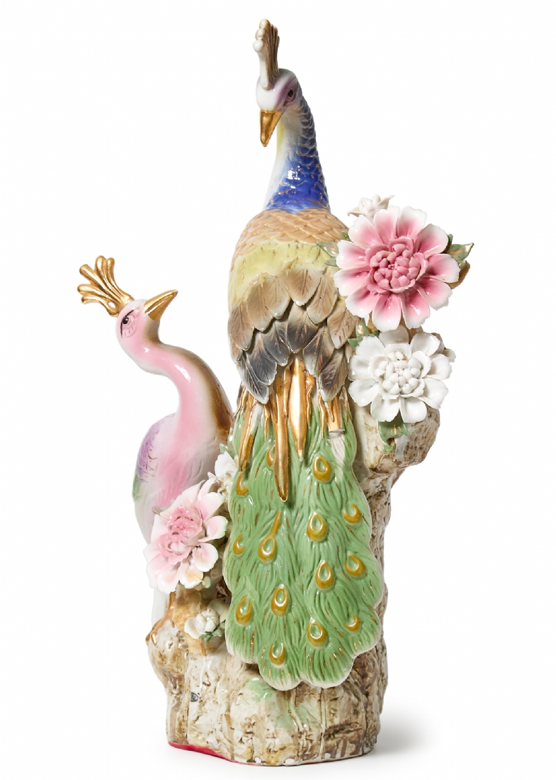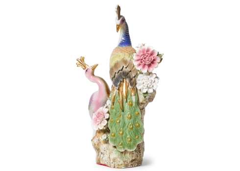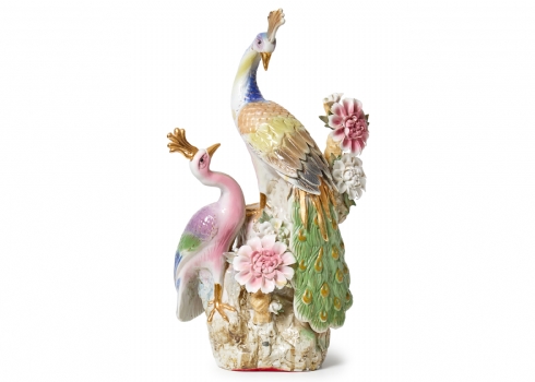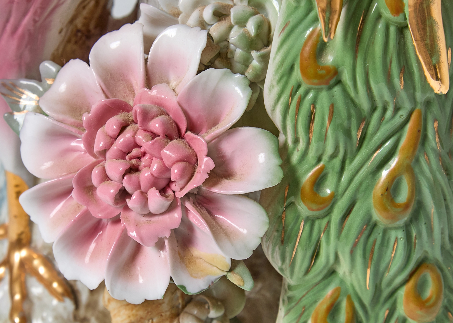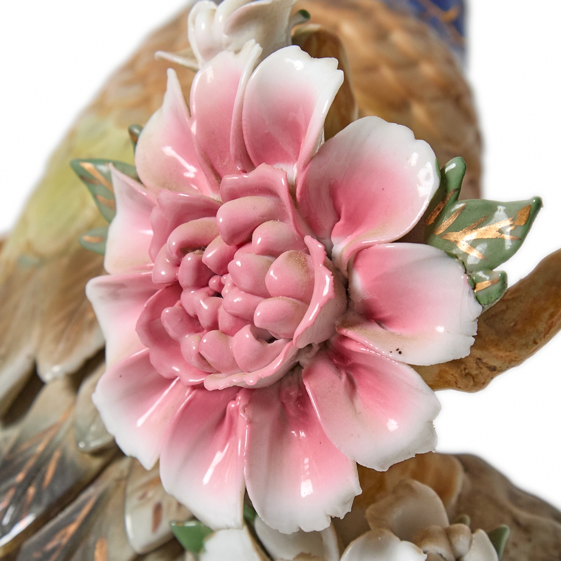 פסל פורצלן גדול בדמות טווסים על ענף פורח צביעת יד, לא חתום