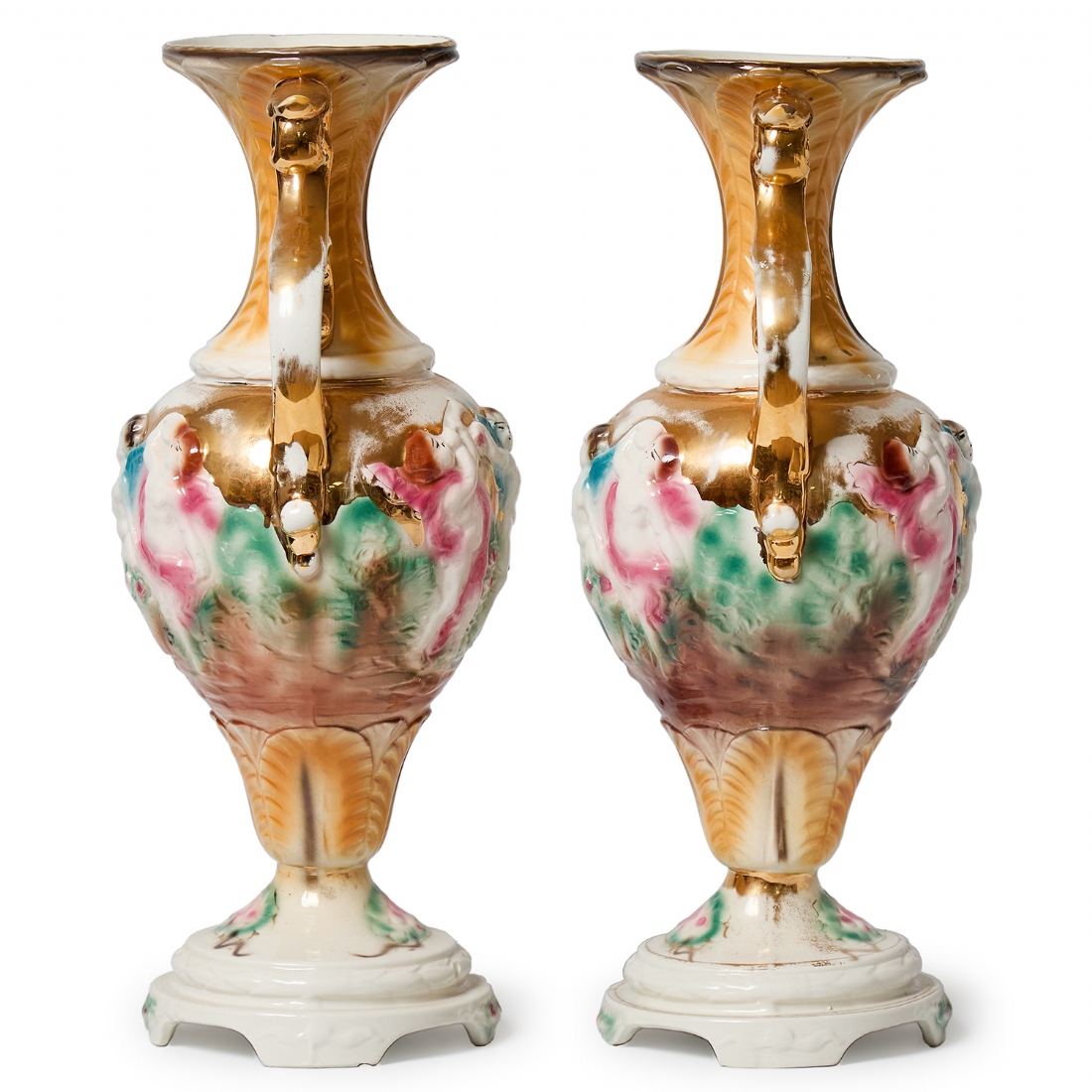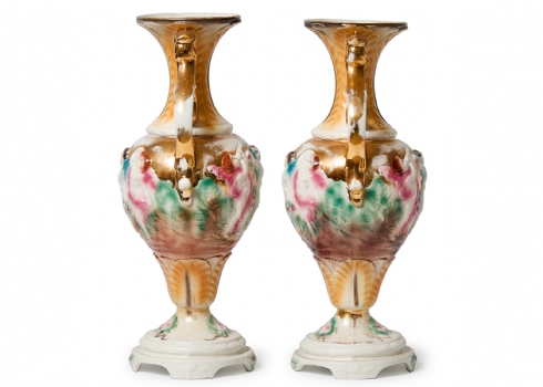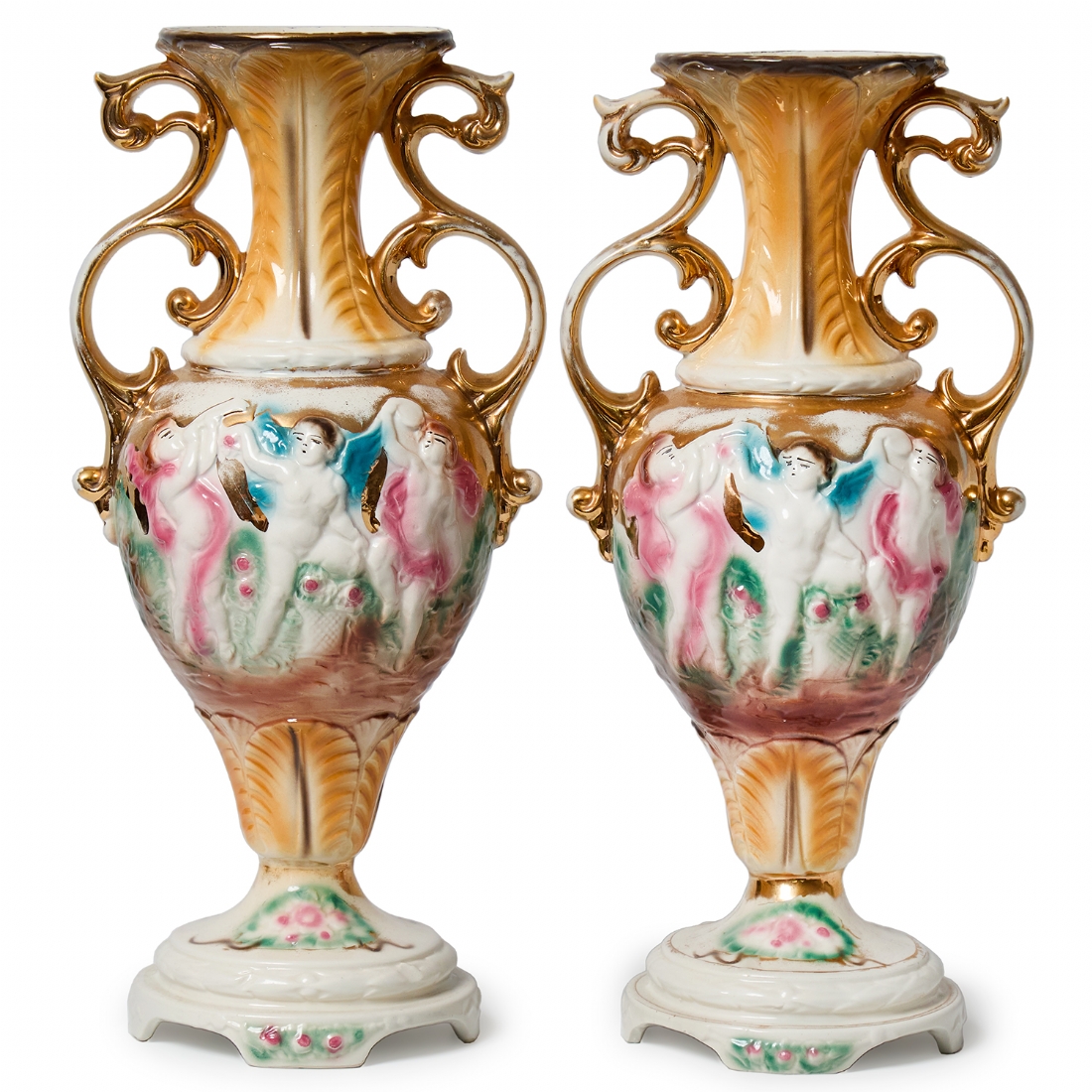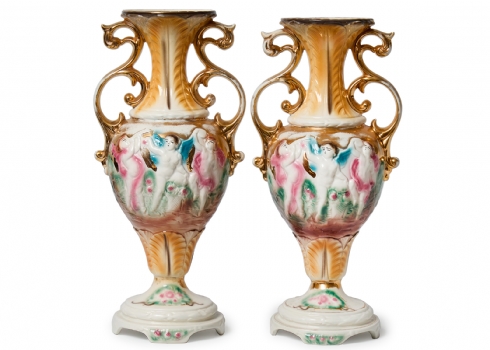 זוג אגרטלים איטלקיים עשויים חרס, מעורים בצביעת יד באמייל ובזהב חתומים