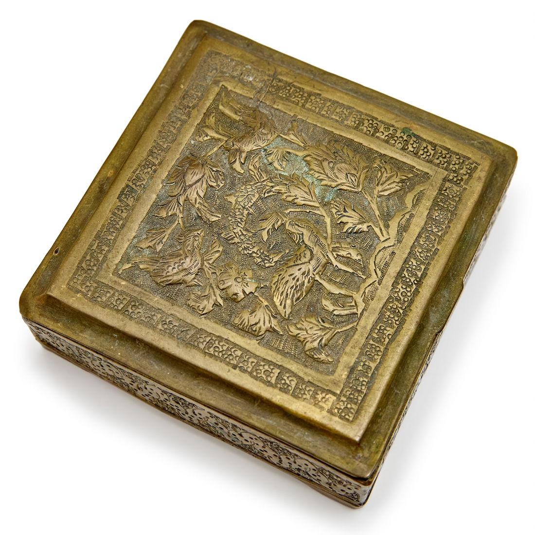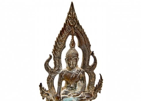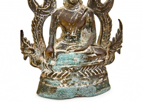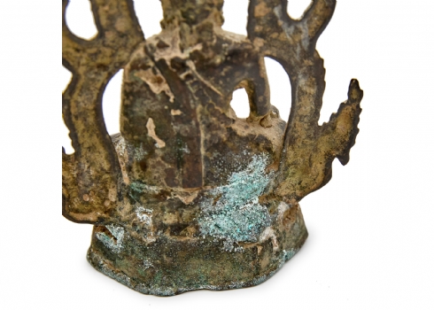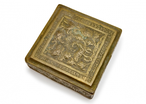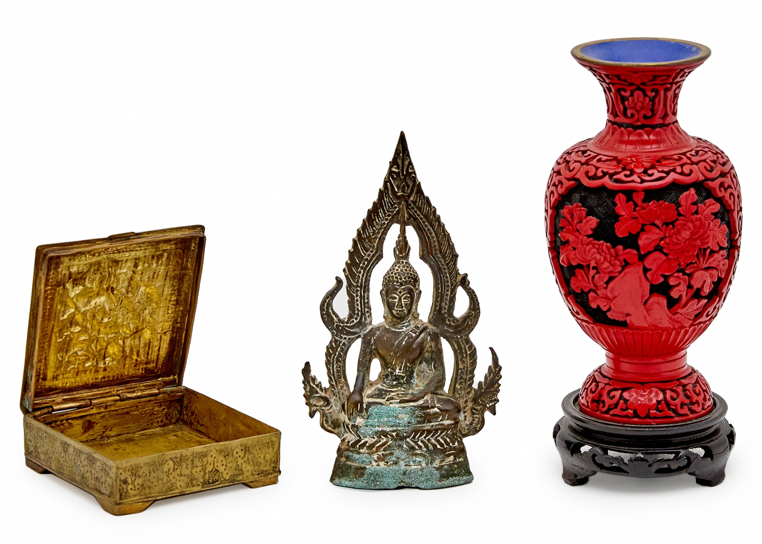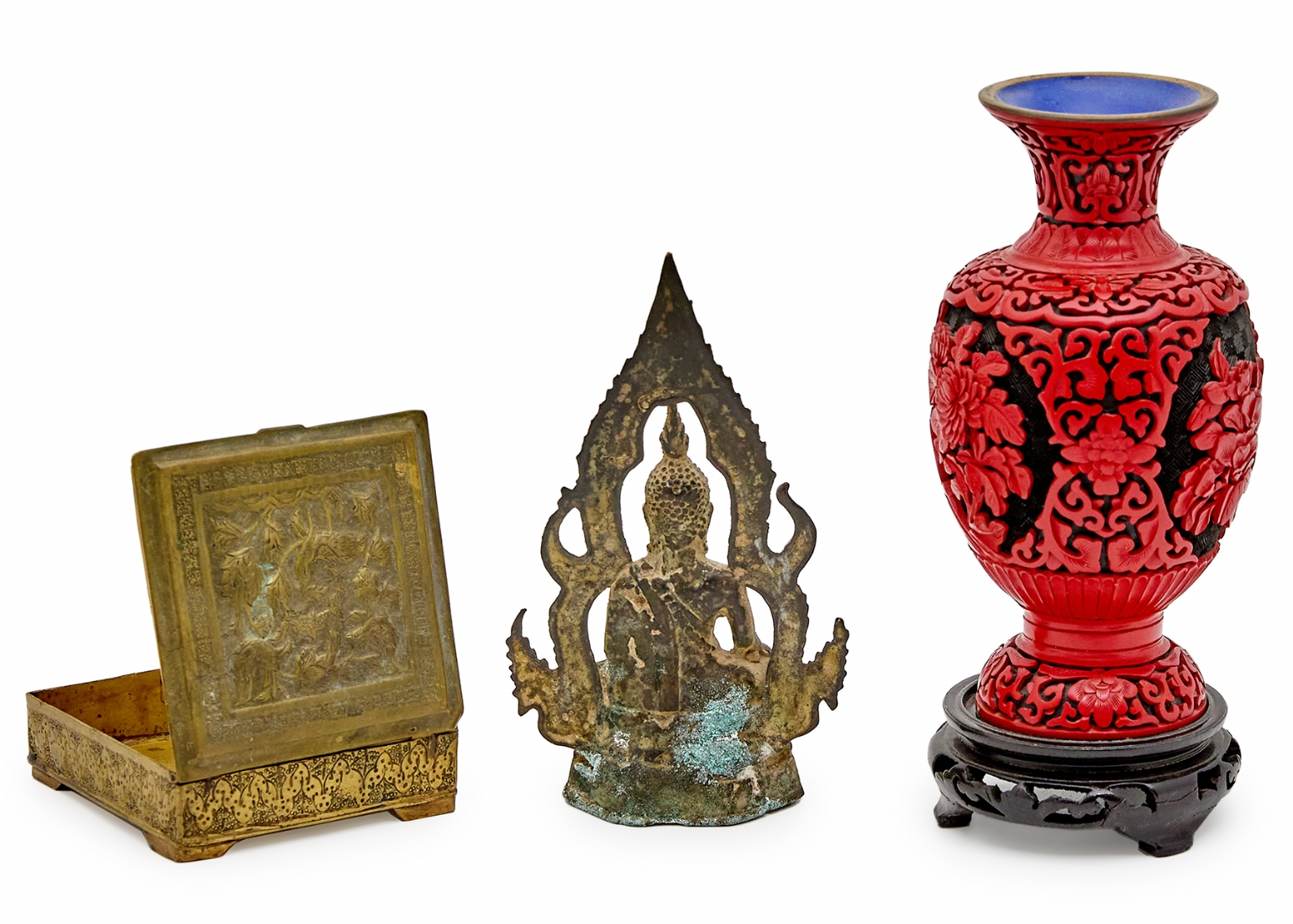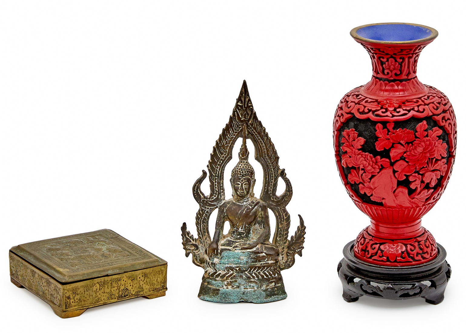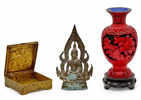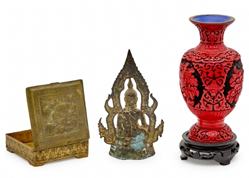הכוללים כד סינבר סיני עם בסיס עץ, פסל מתכת תאילנדי וקופסת נחושת פרסית עתיקה עבודת איספהאן גובה האגרטל כולל הביב 22 ס"מ גובה הפסל הבודהיסטי 17.5 ס"מ רוחב הקופסה 9.5 ס"מ