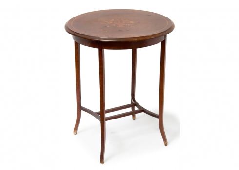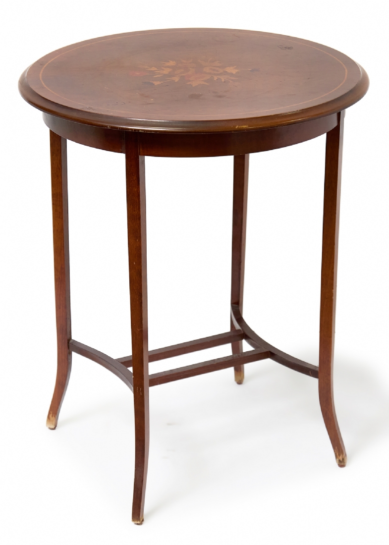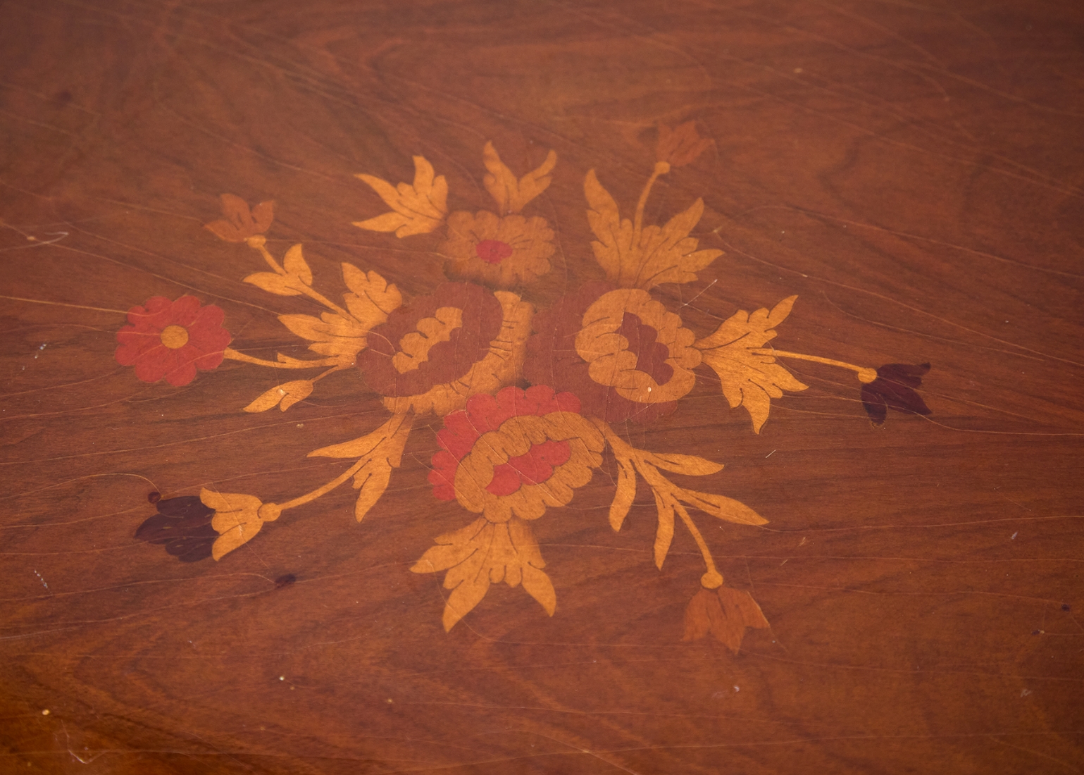 שולחן קפה עשוי עץ בסגנון עתיק, המשטח העליון מעוטר בסגנון מרקטרי