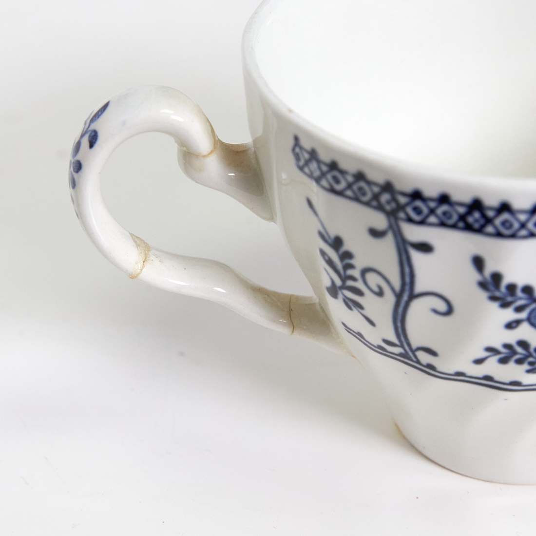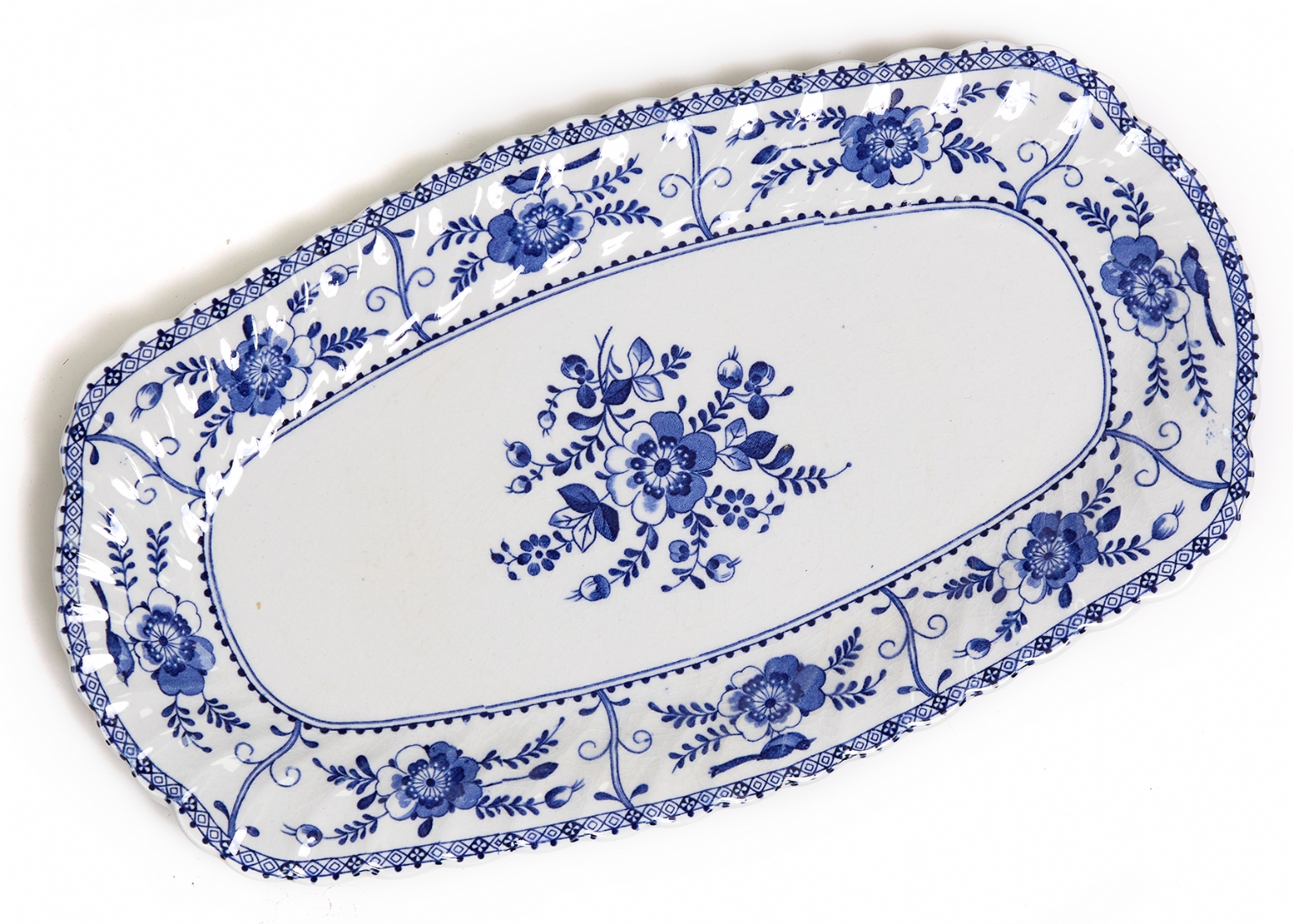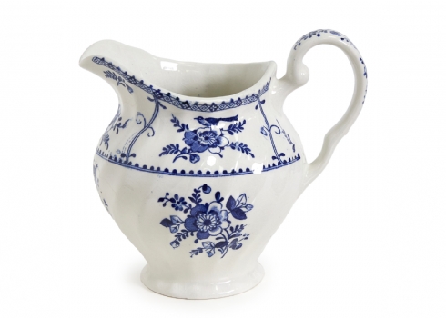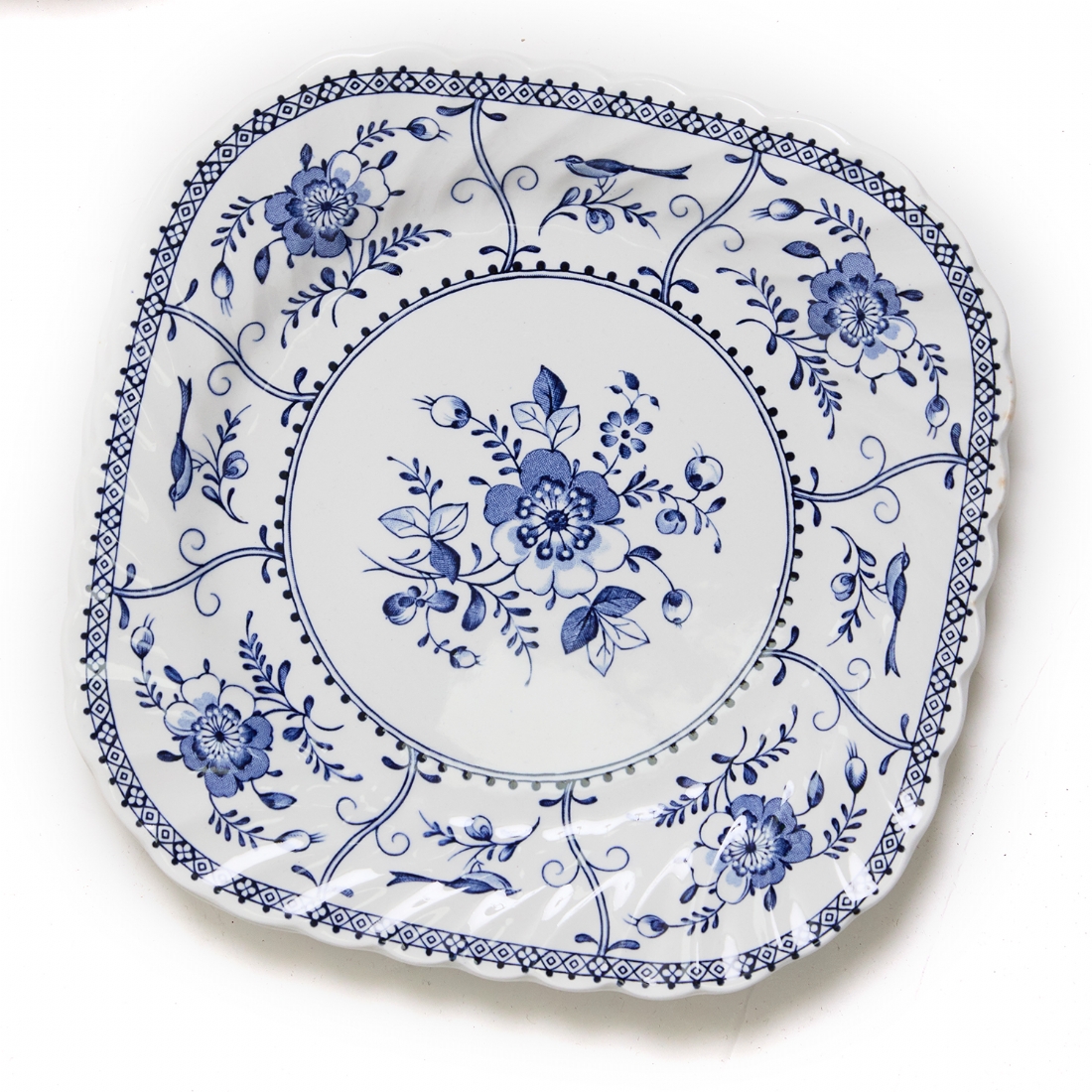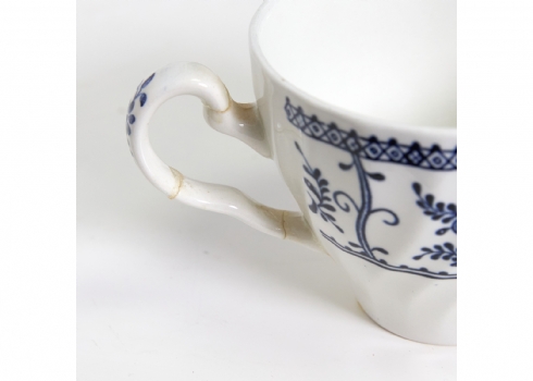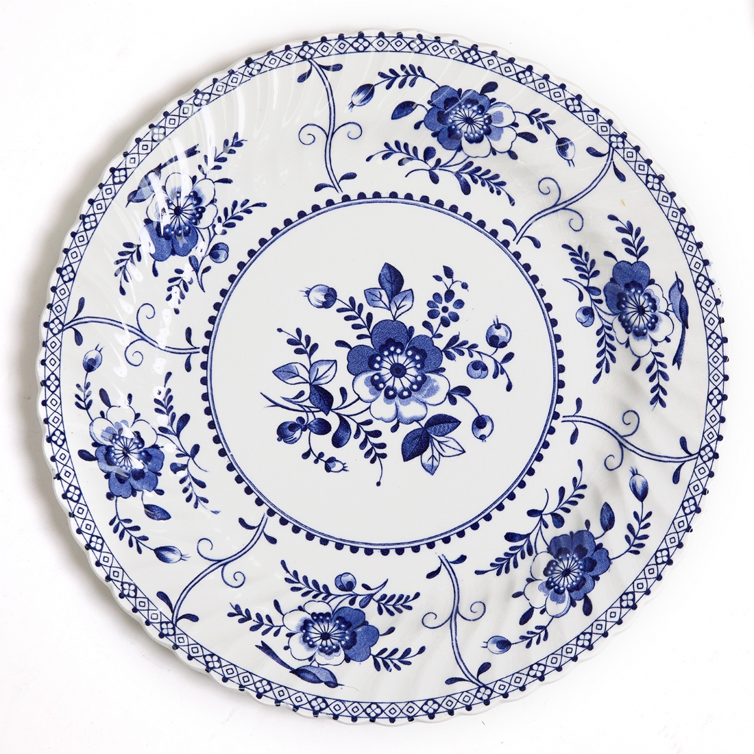 דגם Indies מעוטר בעיטורי פרחים כחולים עדינים על רקע לבן, הכולל: