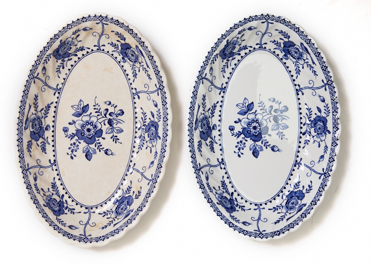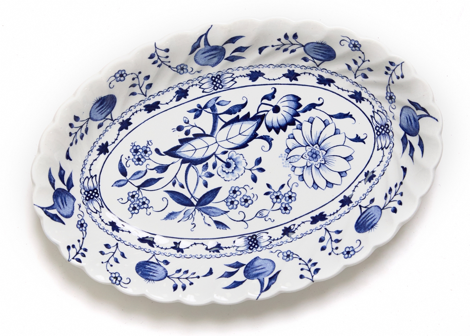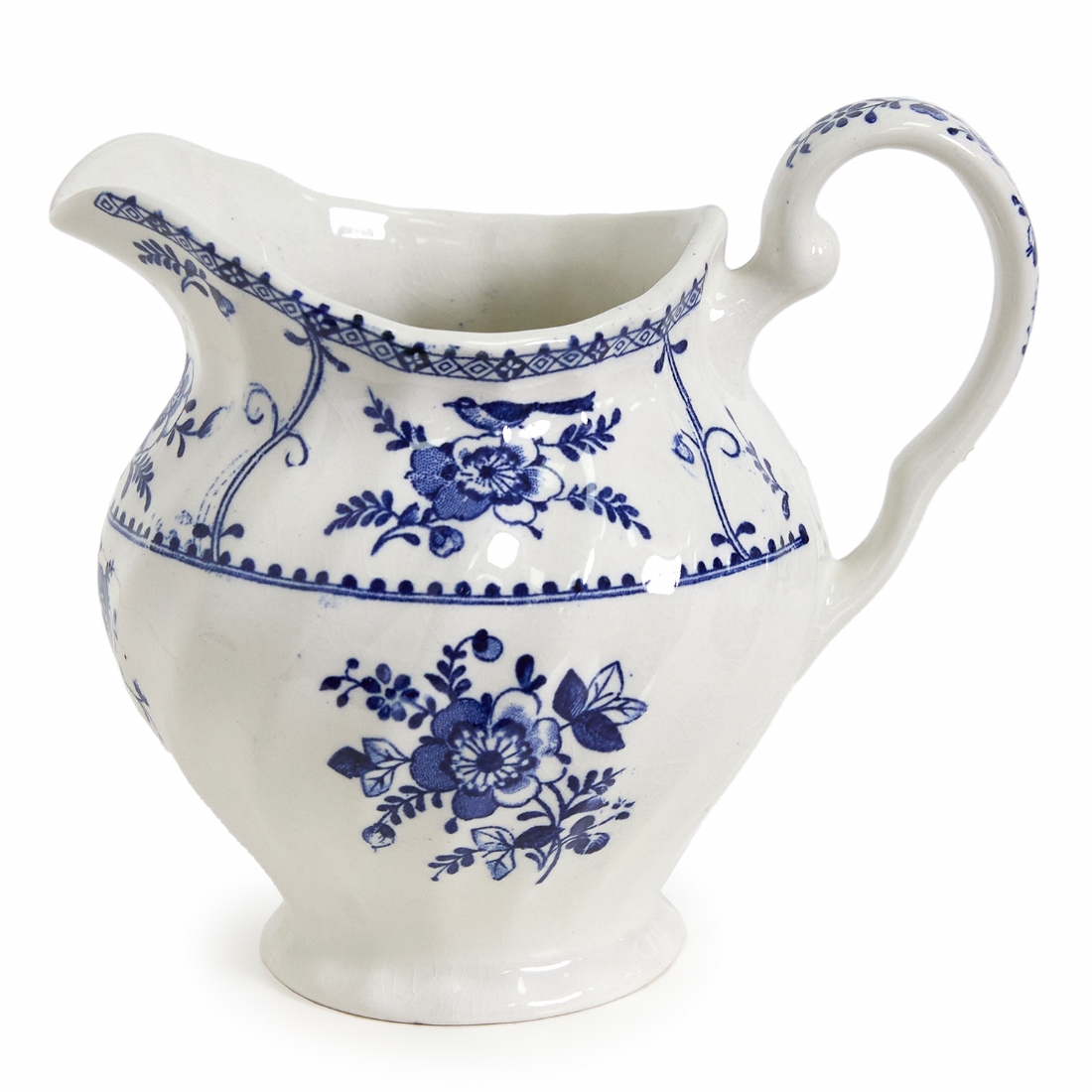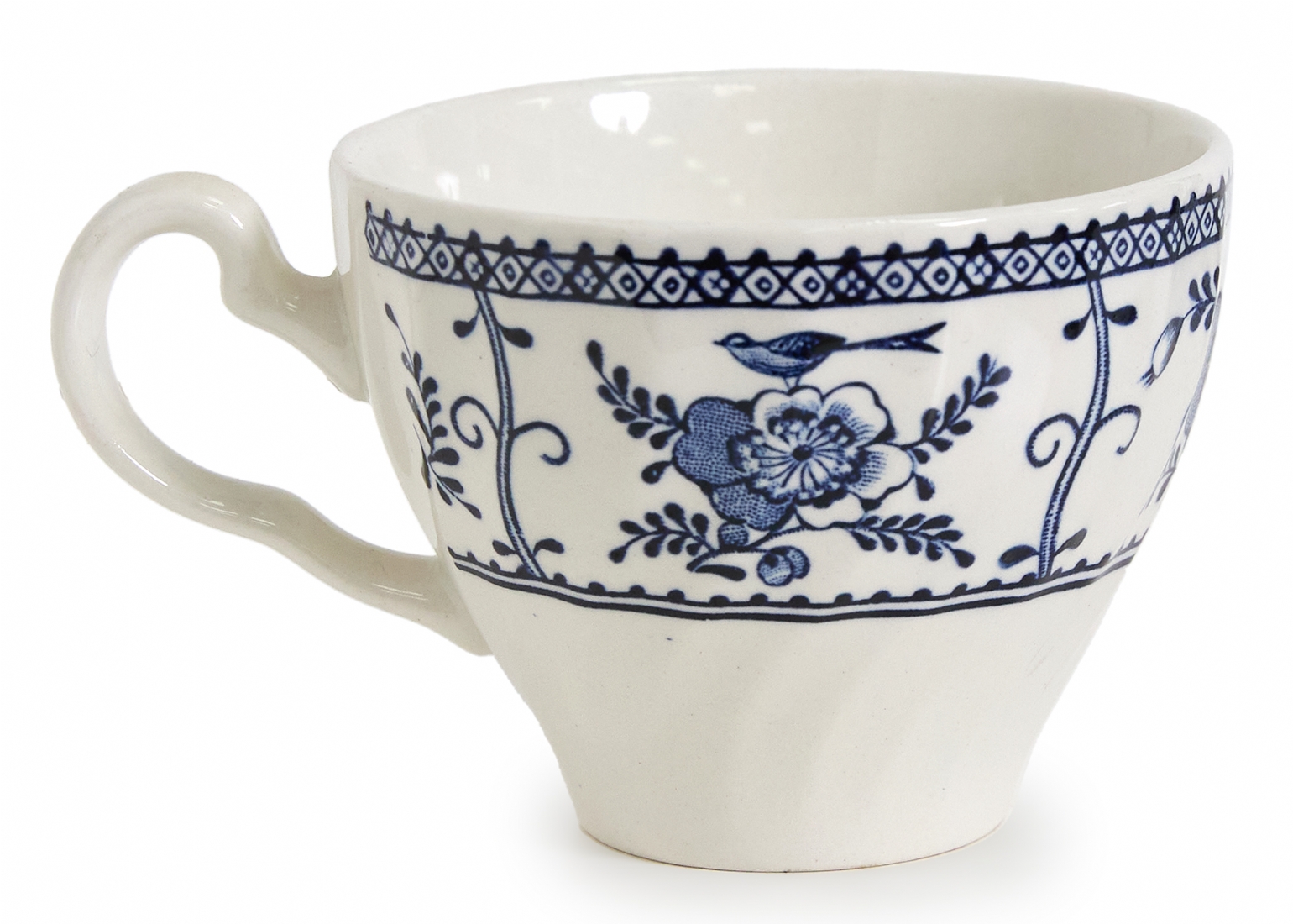 דגם Indies מעוטר בעיטורי פרחים כחולים עדינים על רקע לבן, הכולל: