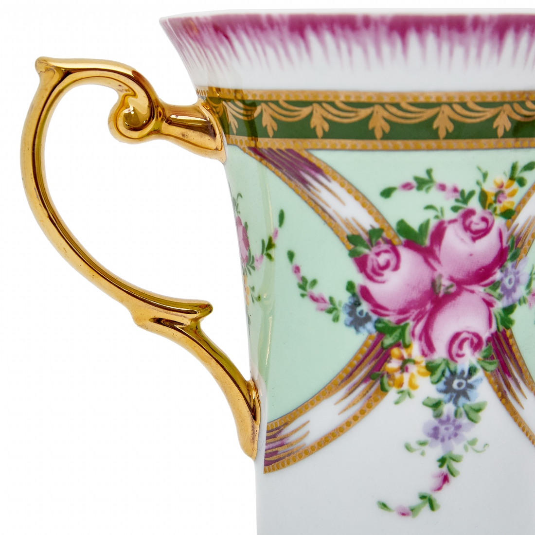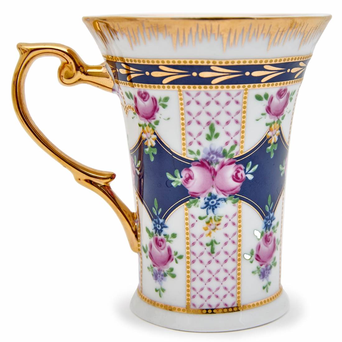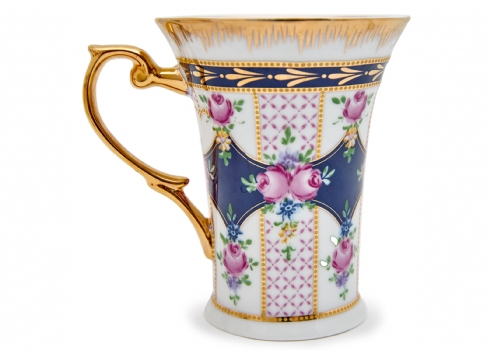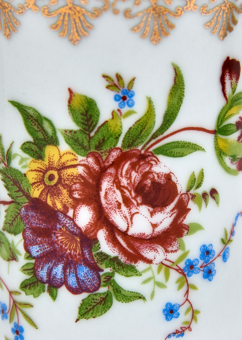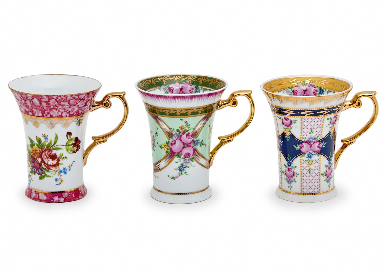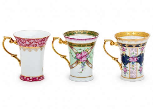 הספלים מעוטרים בפרחים צבעוניים ובפסי זהב