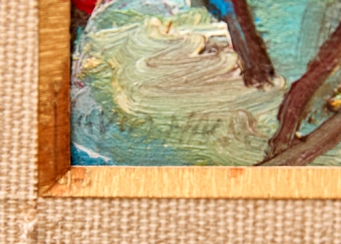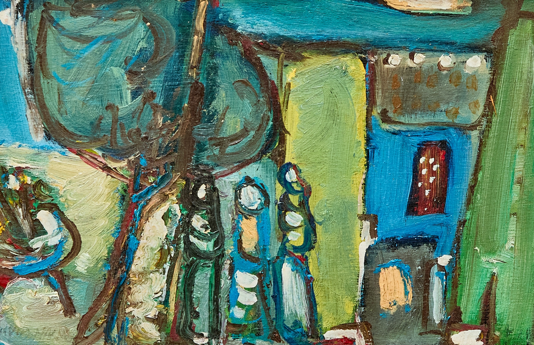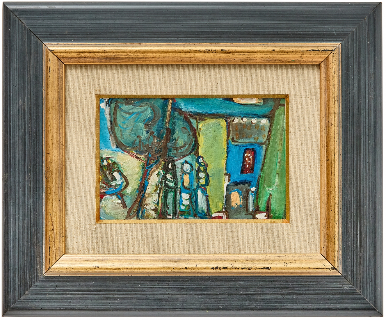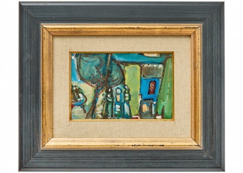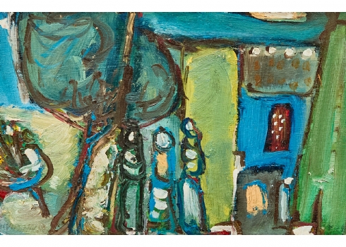 משה רוזנטליס (Moshe Rosenthalis) - 'דמויות בנוף כחול', שמן על לוח חתום