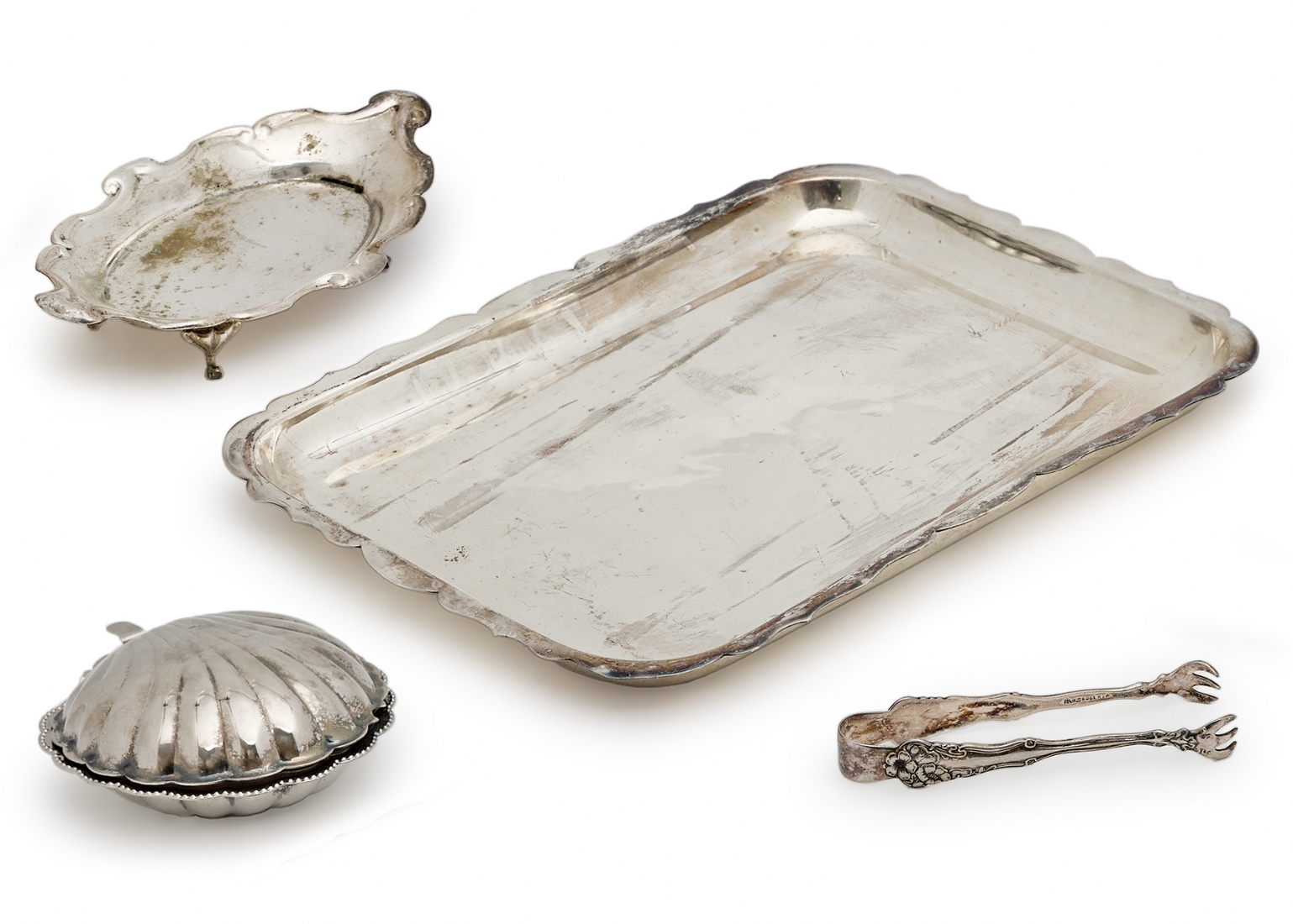 4 כלים עשויים מתכת מצופים כסף, חלקם חתומים