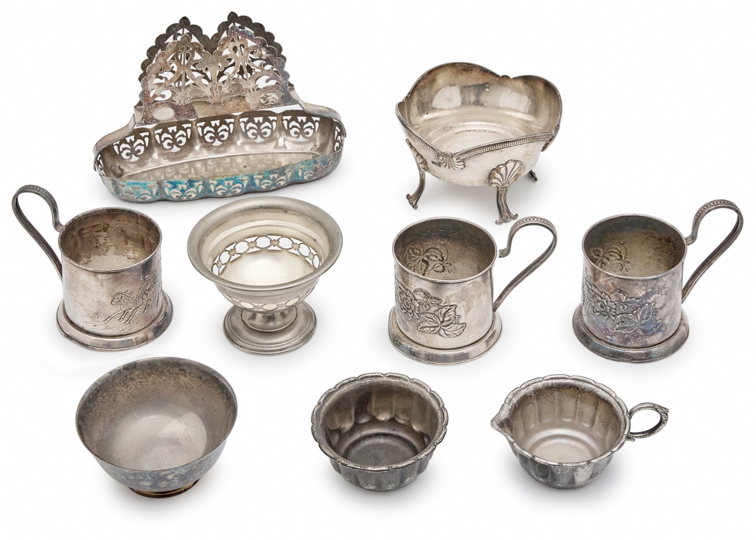 9 כלים שונים, עשוים מתכת ומצופים כסף, חלקם חתומים