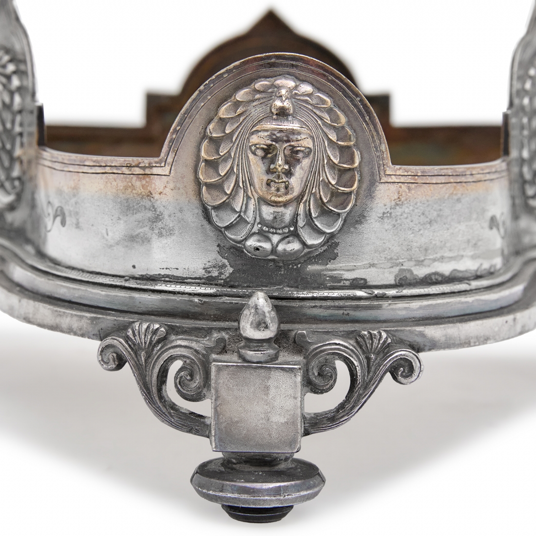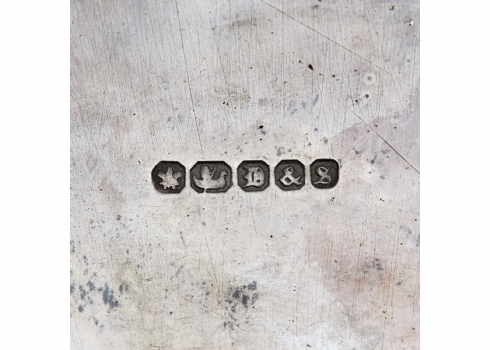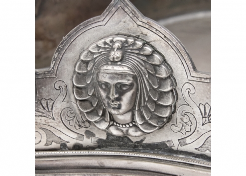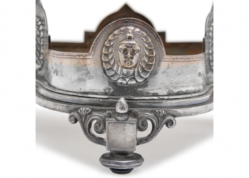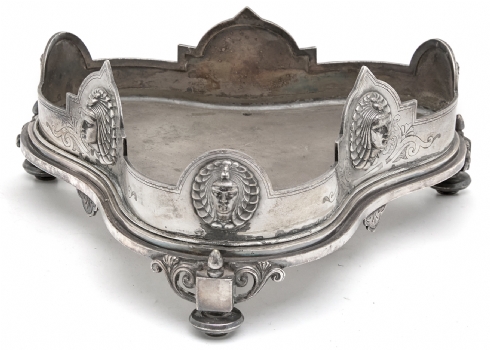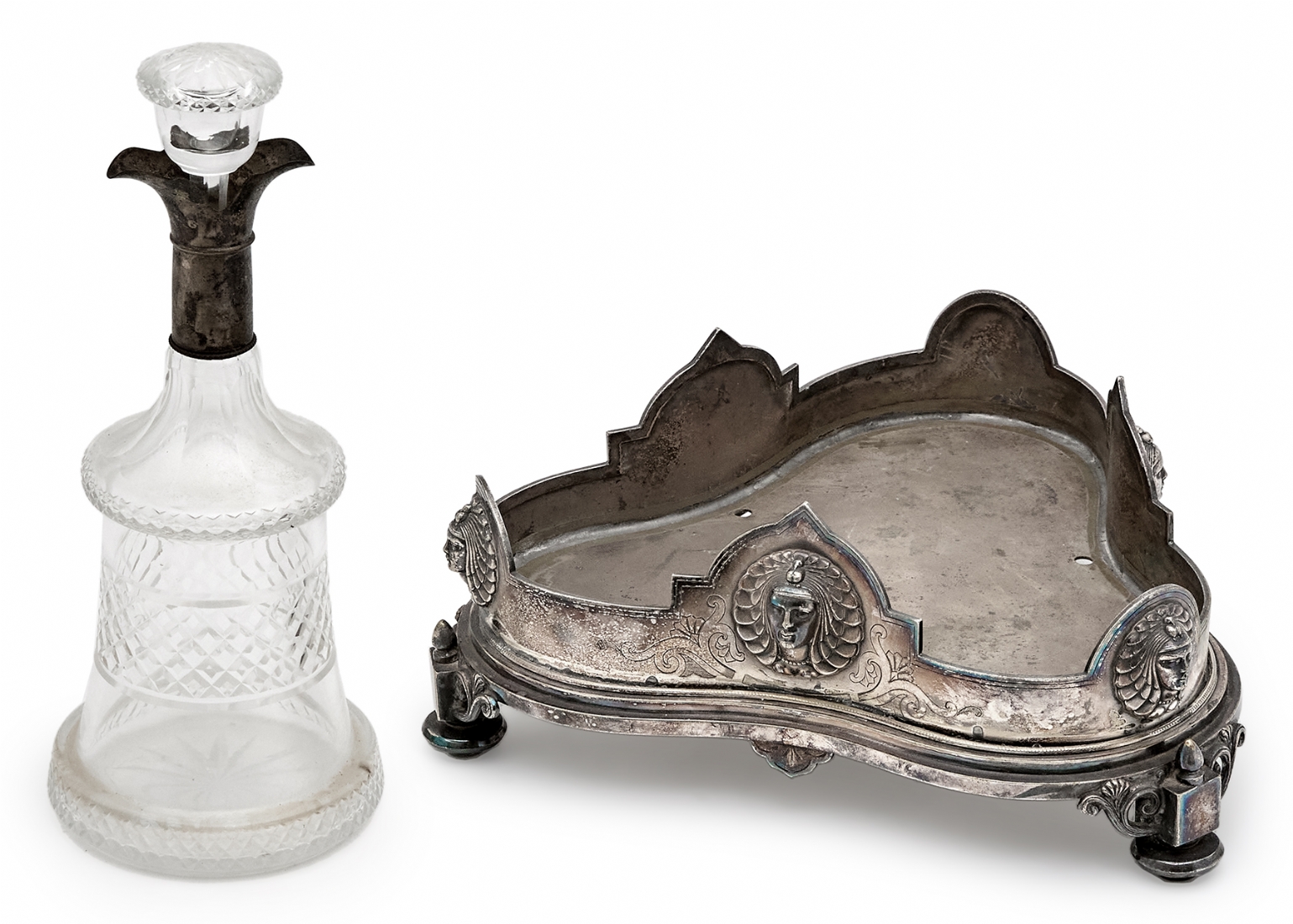 שני כלים עתיקים - מעמד (בסיס) אנגלי ויקטוריאני, לכלי זכוכית (רק הבסיס) מתוצרת: 'Deykin & Harrison' עשוי פליז מצופה כסף, חתום: Deykin & sons גובה: 10 ס"מ, רוחב: 25 ס"מ