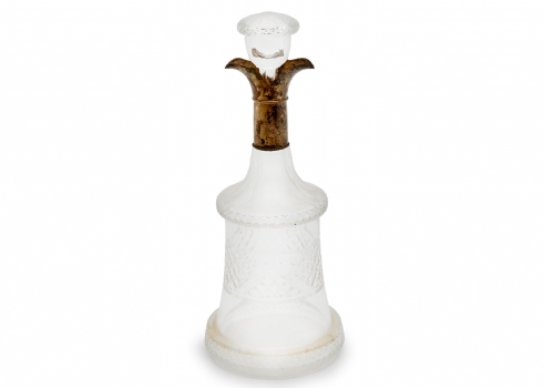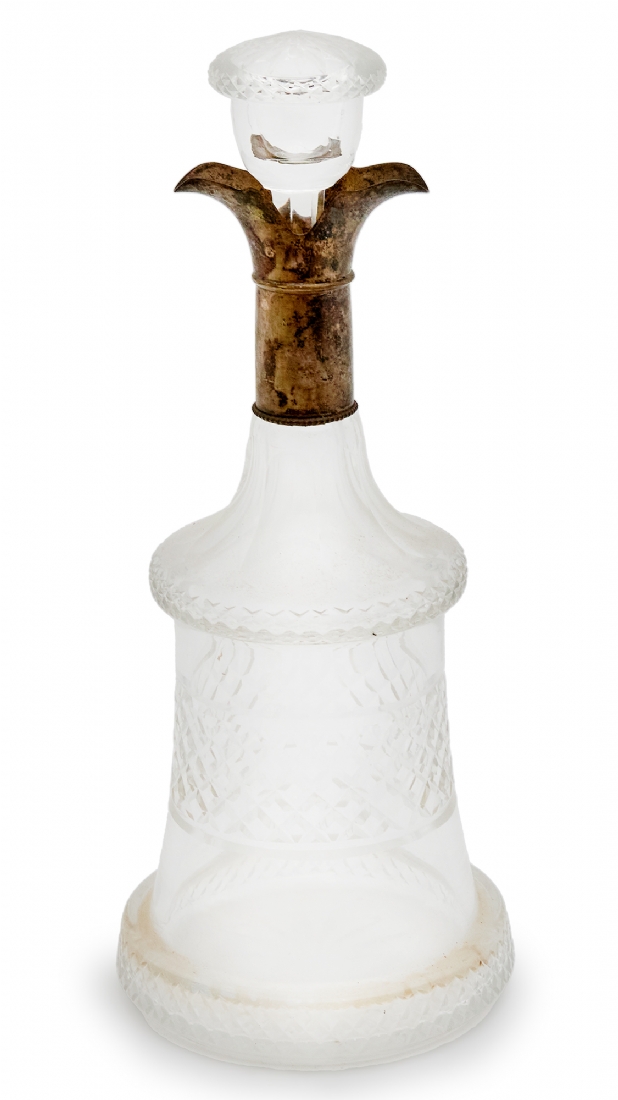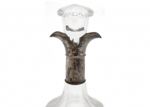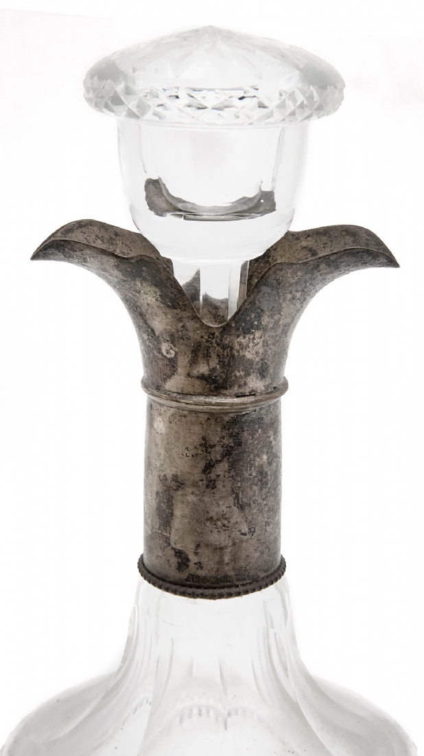 ודקנטר עתיק עשוי זכוכית ונחושת מצופה כסף, גובה כולל הפקק: 25.5 ס"מ