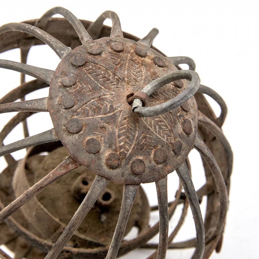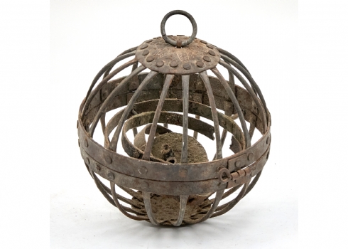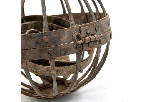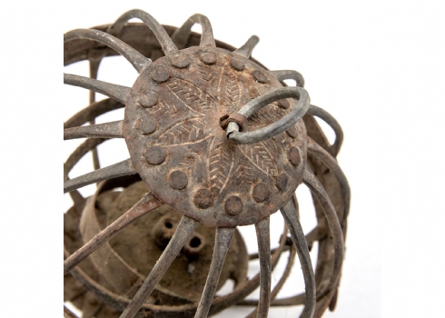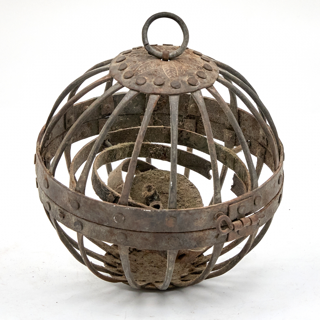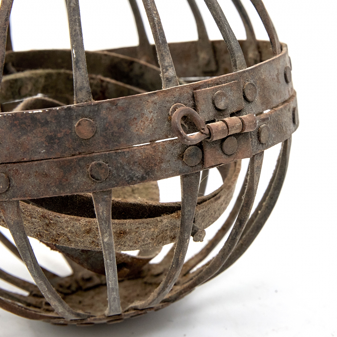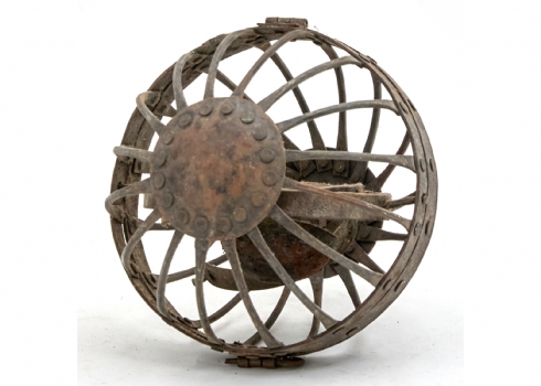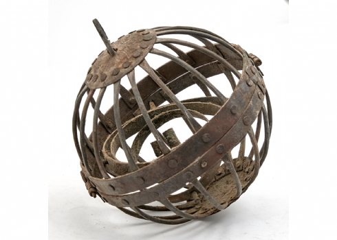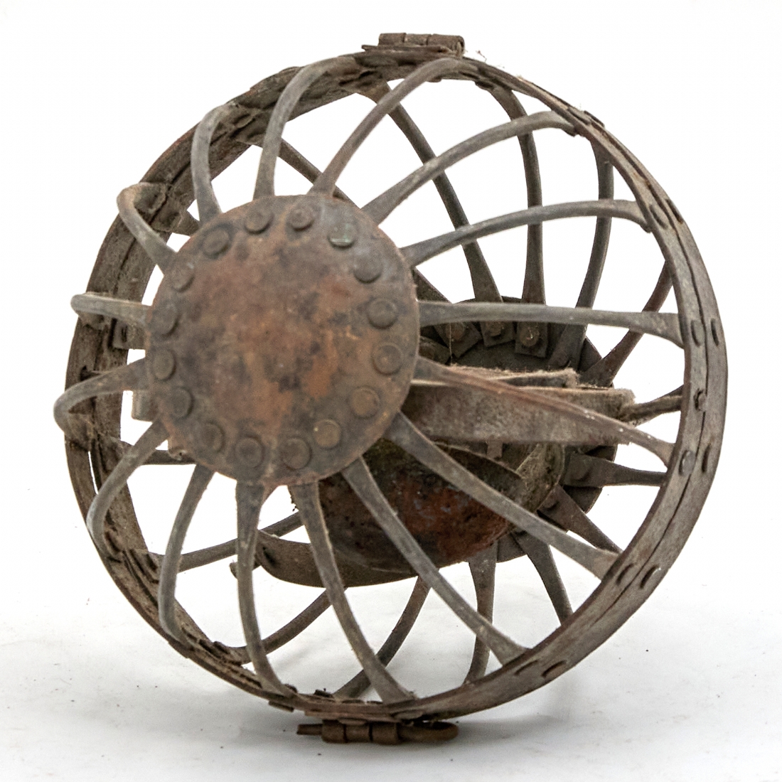 פנס ספינה גירוסקופי (gyroscopic triple gimbaled ship lantern) מהמאה ה-19 לשמן לווייתן, עשוי ברזל, סגירת פינים וצירים תקינים, בלאי התואם את הגיל והשימוש כולל חלודה על פני השטח