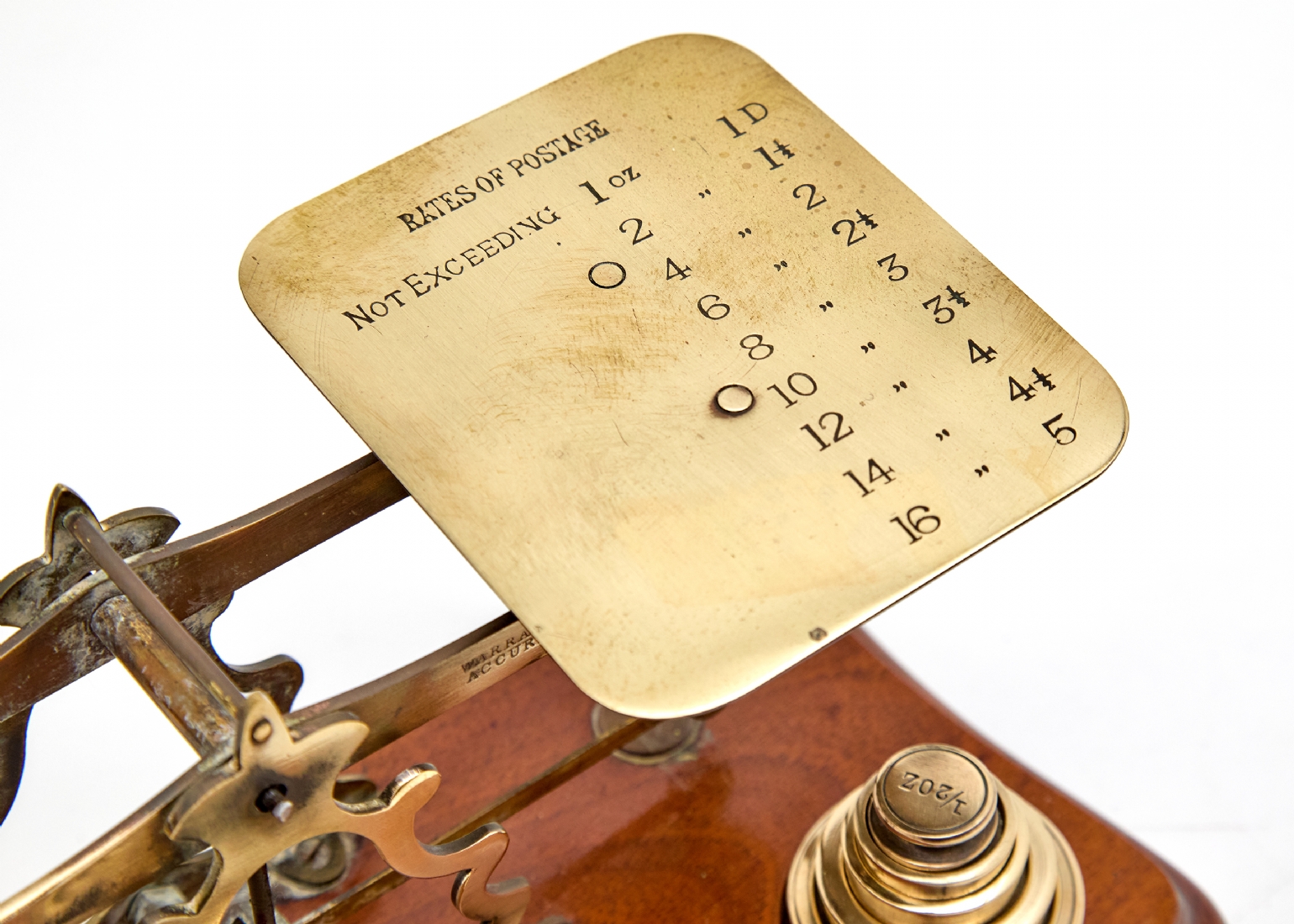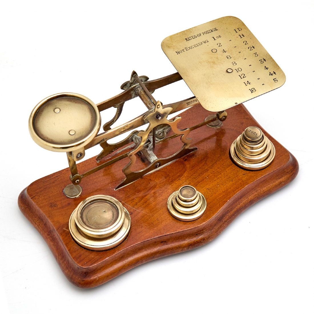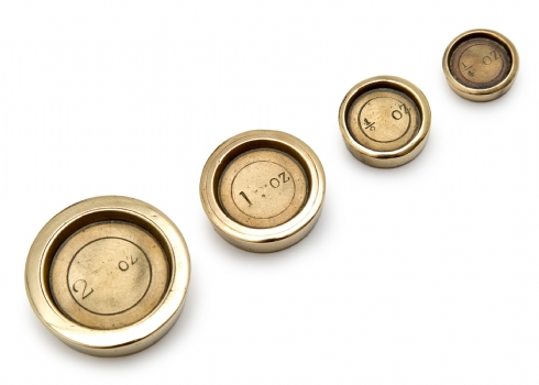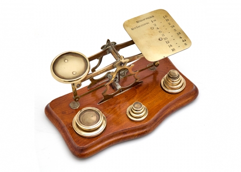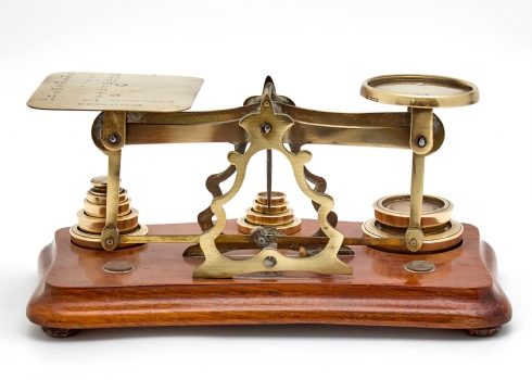 משקל מאזניים עתיק עשוי עץ ופליז, בעל 11 משקולות