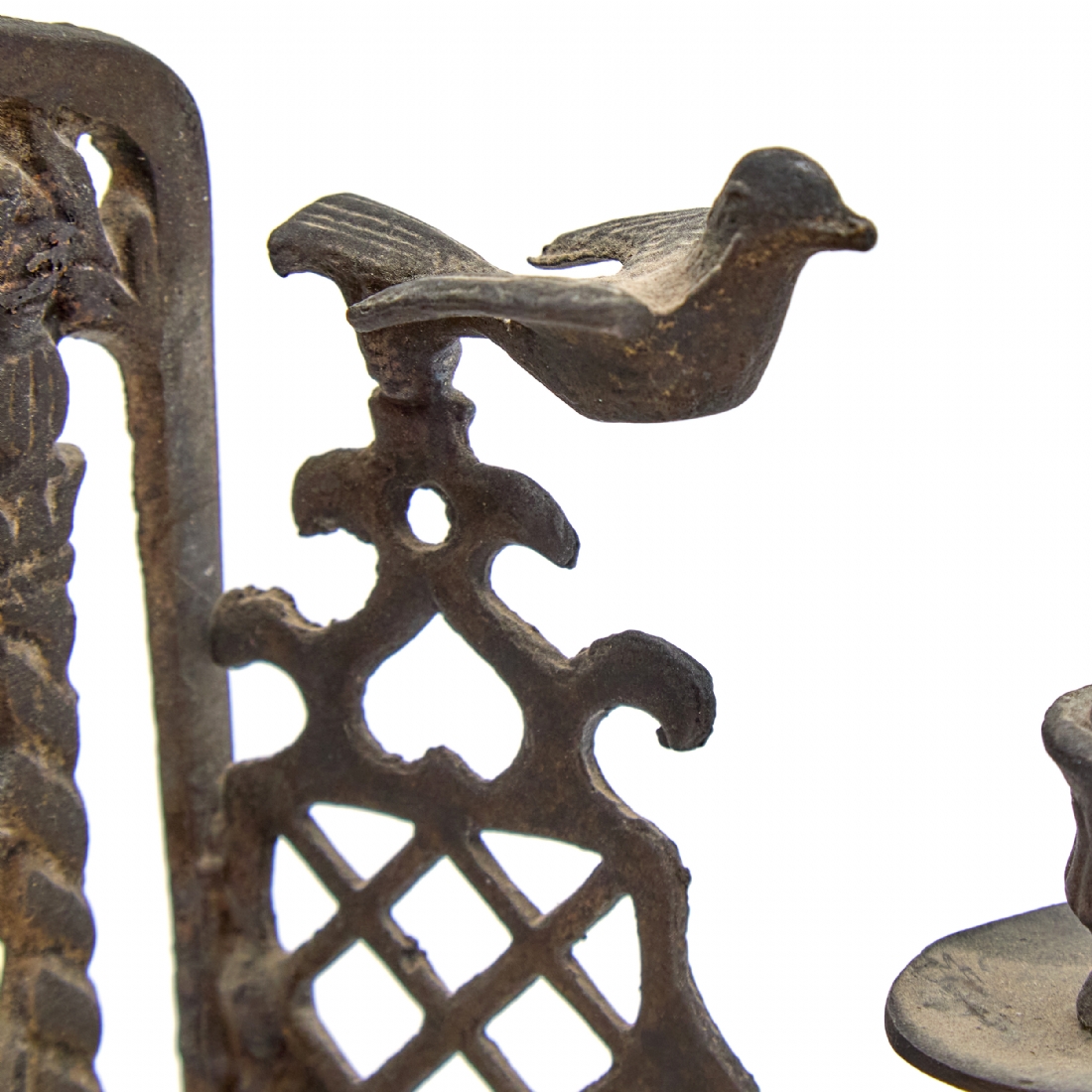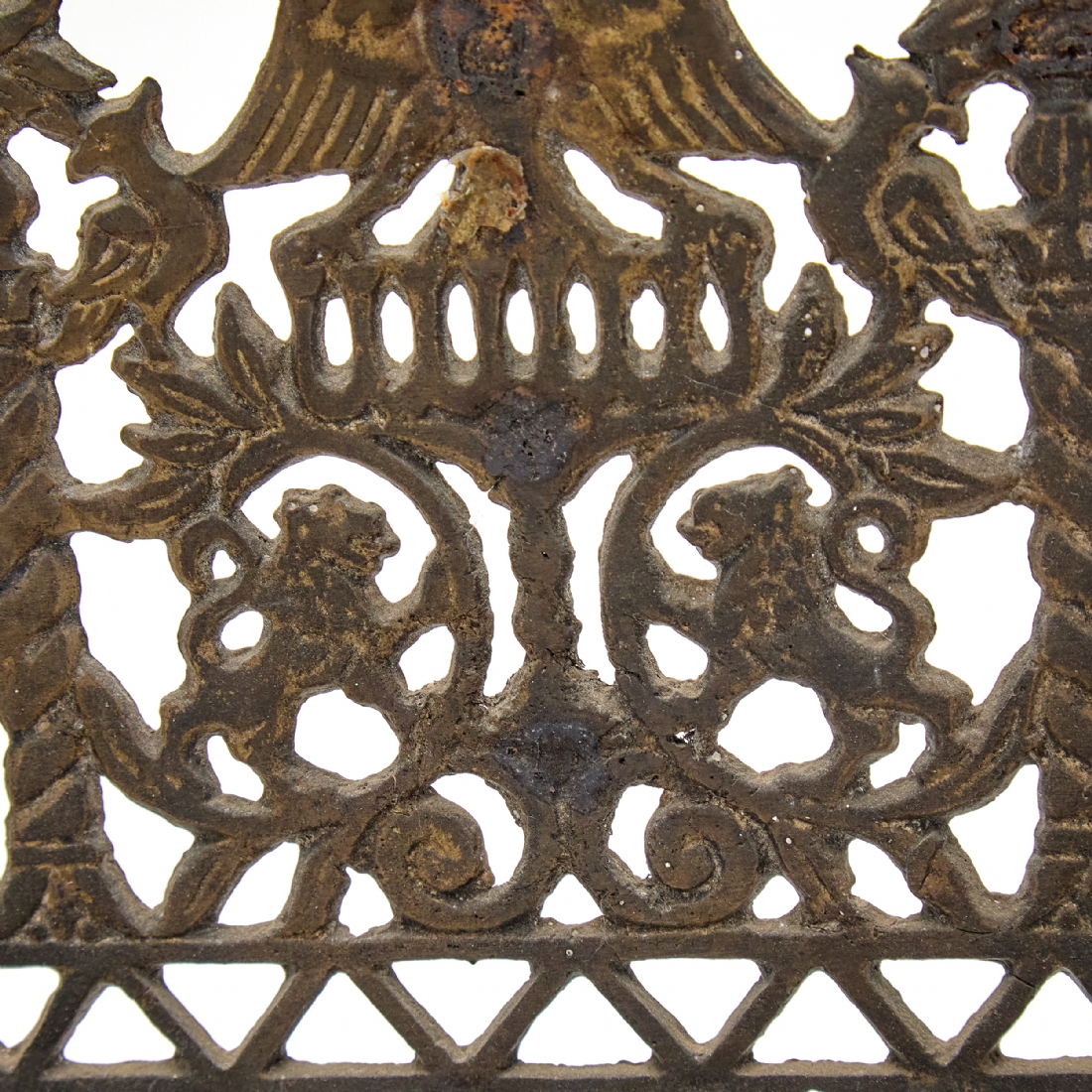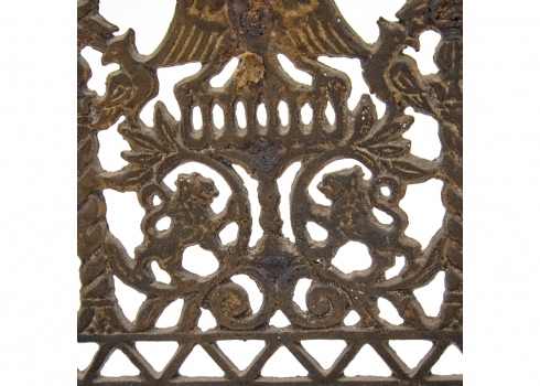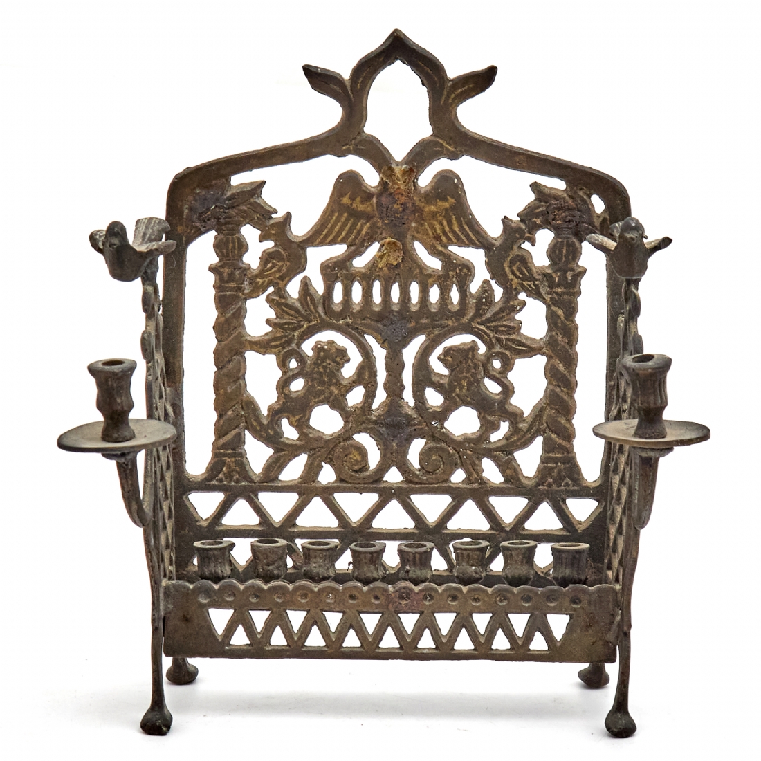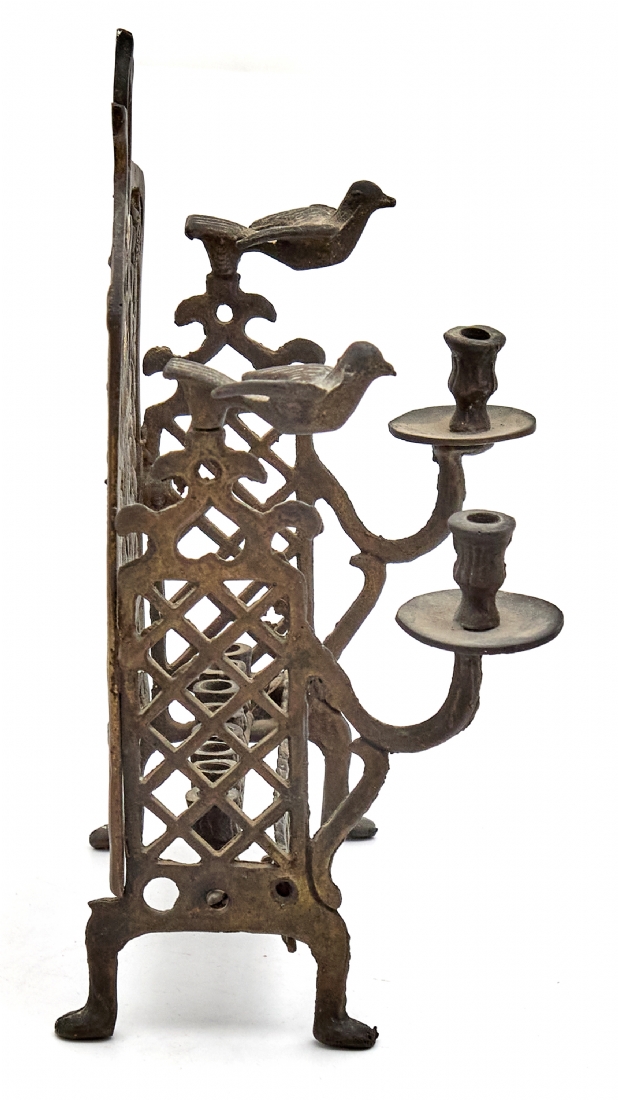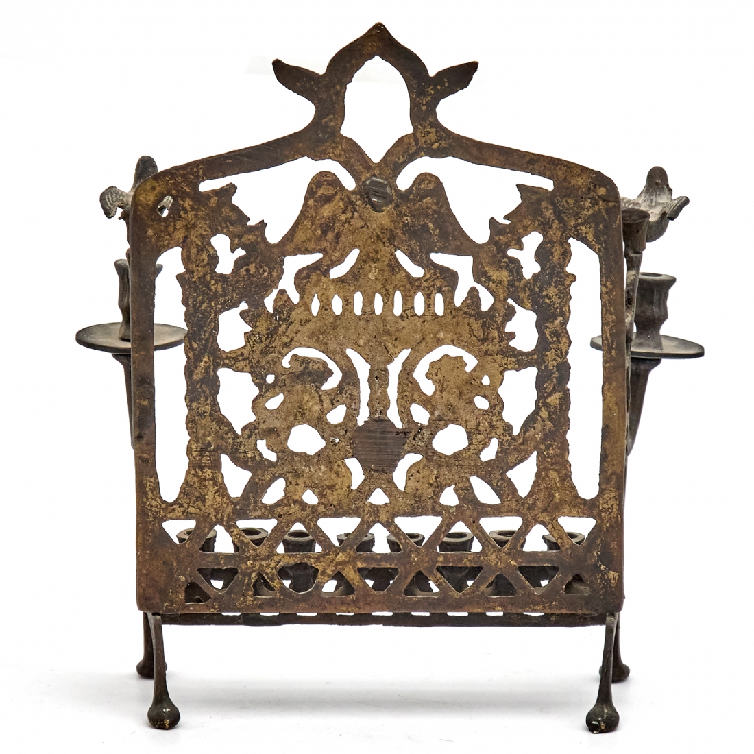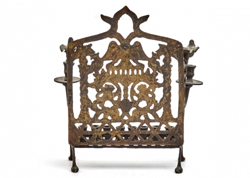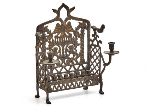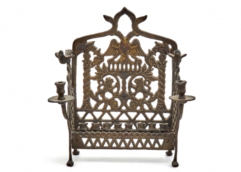 חנוכיה גדולה בסגנון עתיק ממזרח אירופה, הכוללת פמוטי שבת, עשויה מקשת פליז