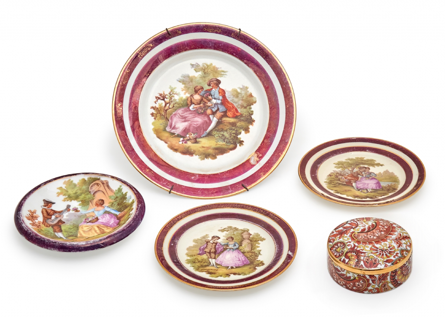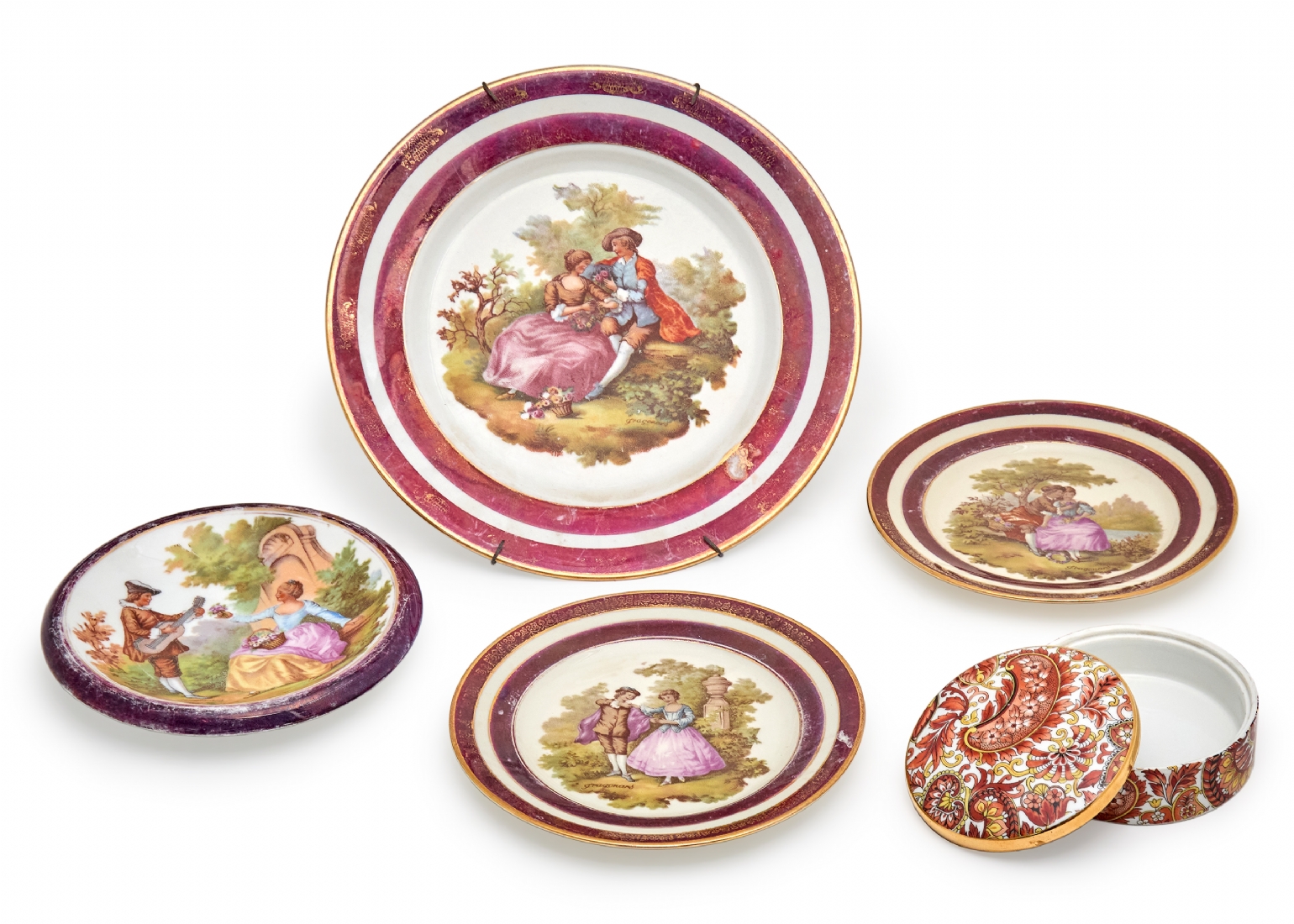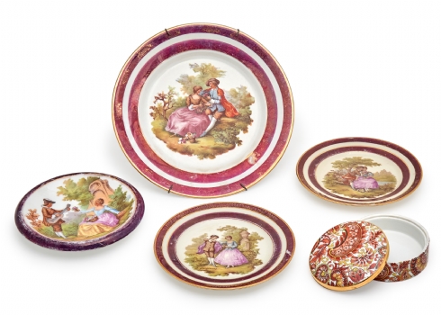 חמישה כלי קרמיקה ופורצלן שונים, בעיטורי סצינות חיזור, חתומים