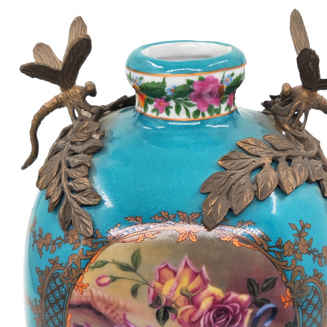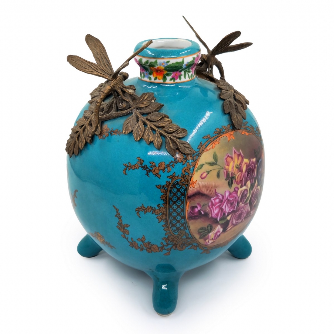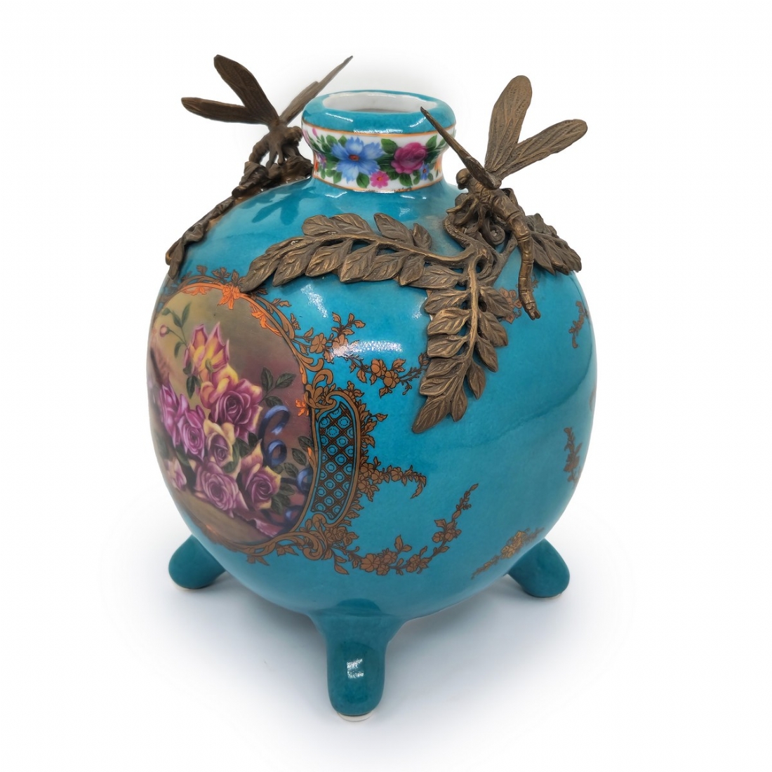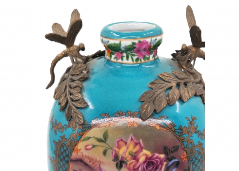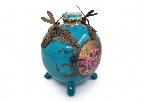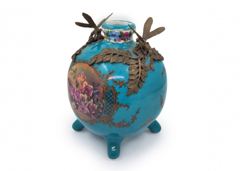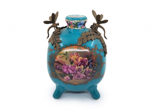 כד (בצורת בקבוק נפוח) עשוי חרס מעוטר בהדפס שושנים על רקע בגוון טורקיז, לא חתום