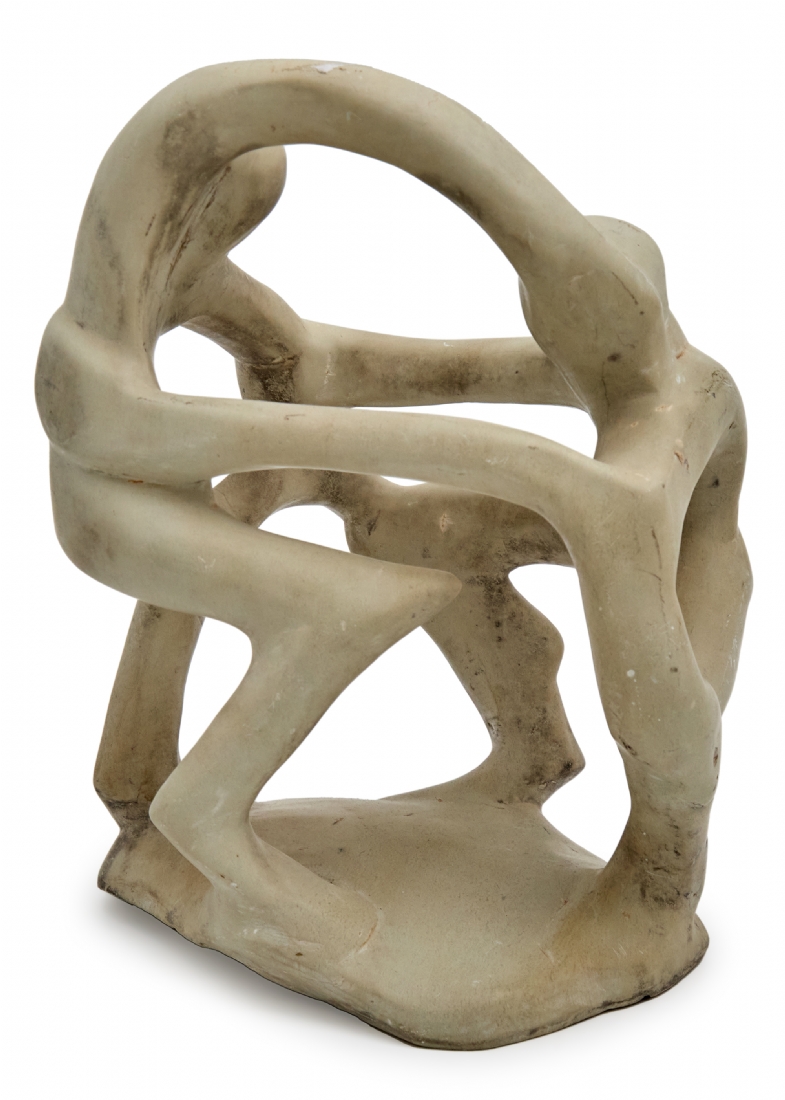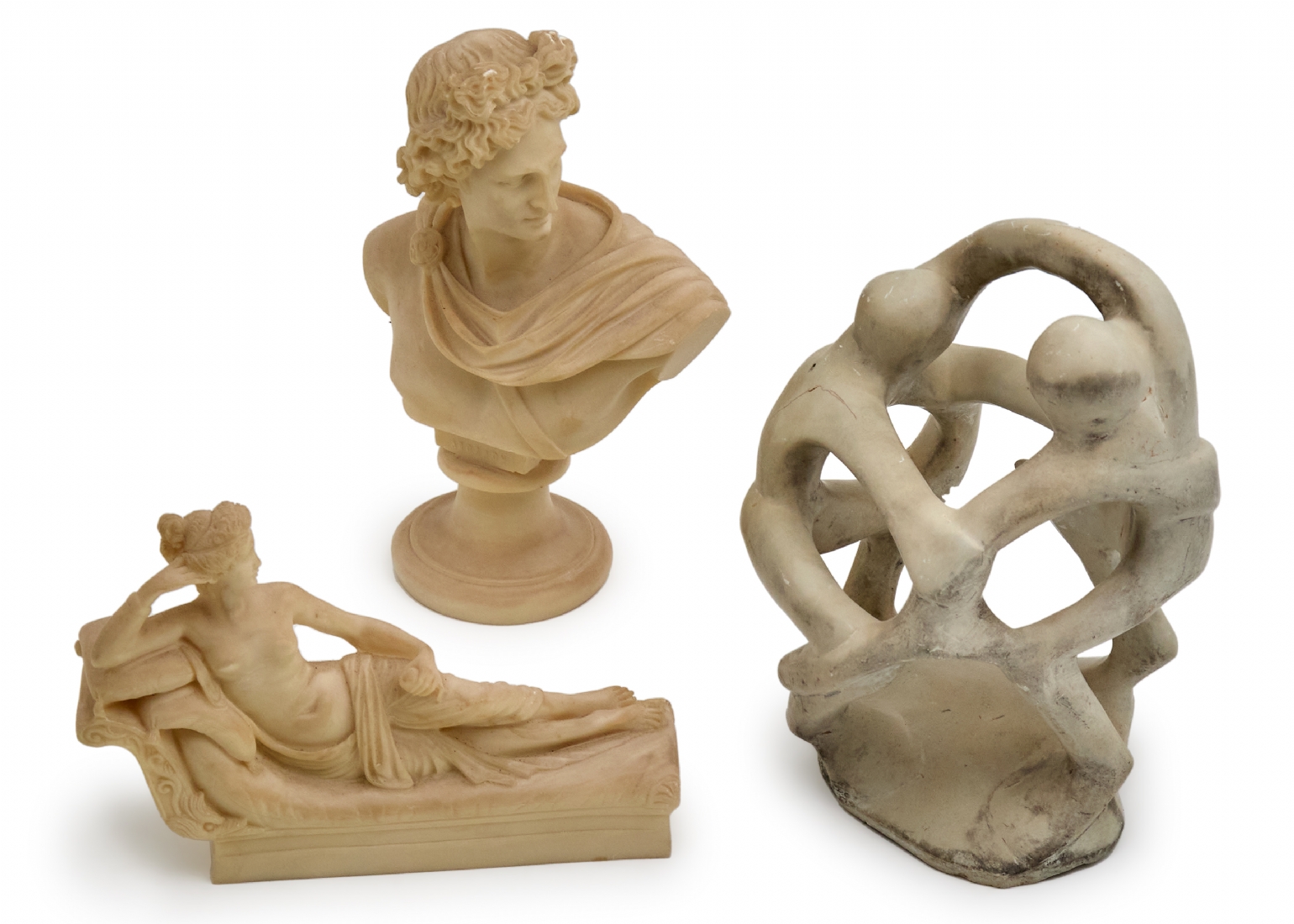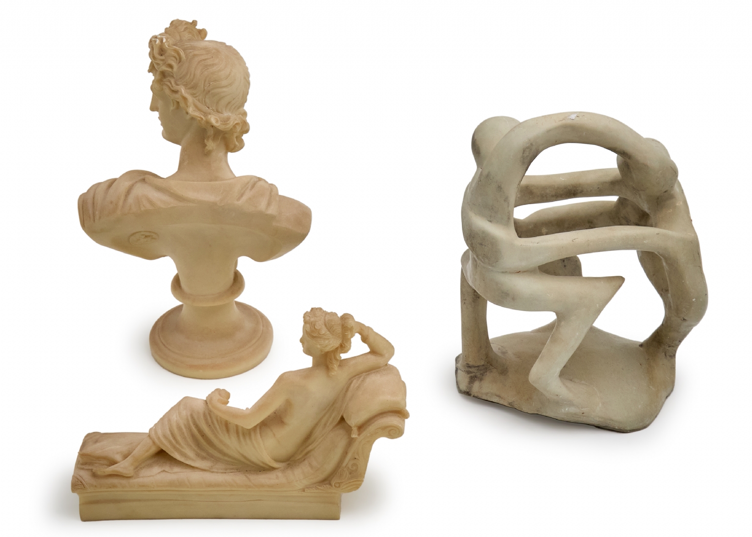 שלושה פסלים שונים, עשויים חומר יצוק ואבן