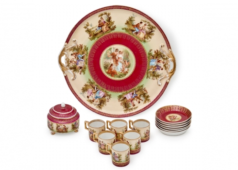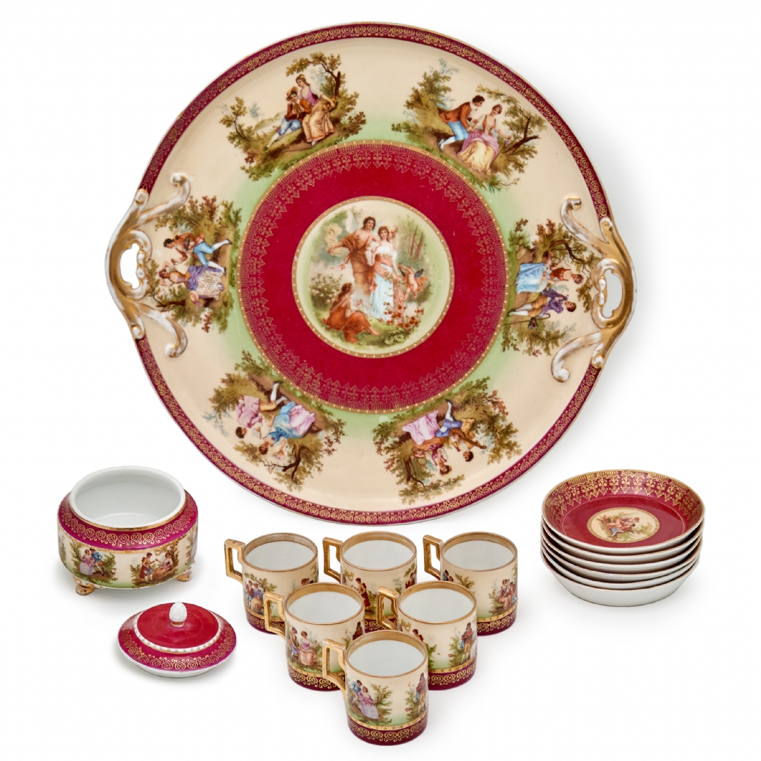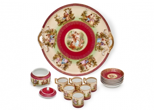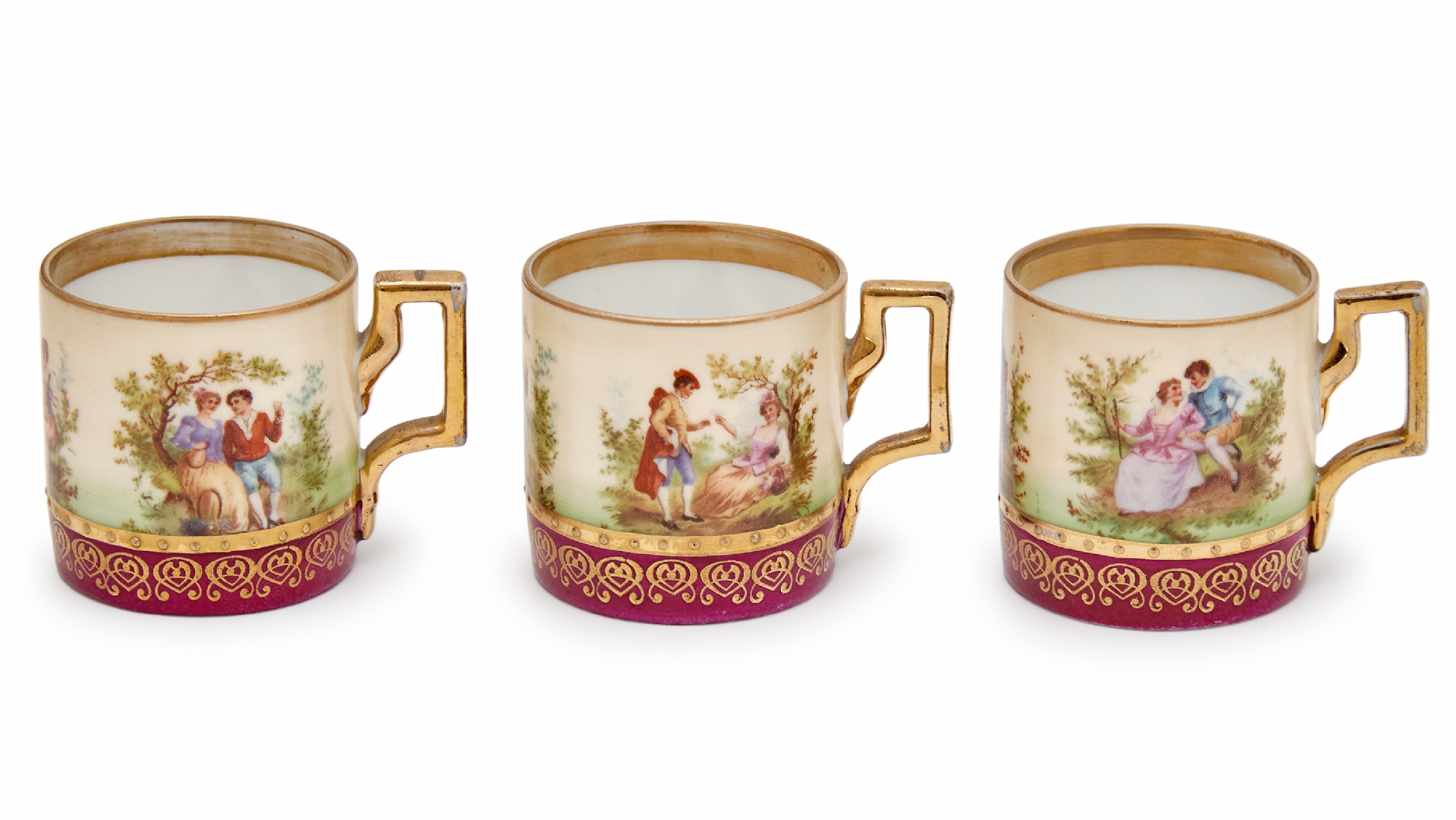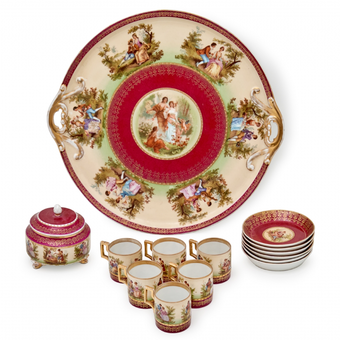סט מוקה עתיק בסגנון וינה הישן, מעוטר בהדפסים של סצינות חיזור גלנטיות