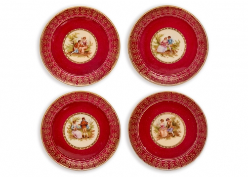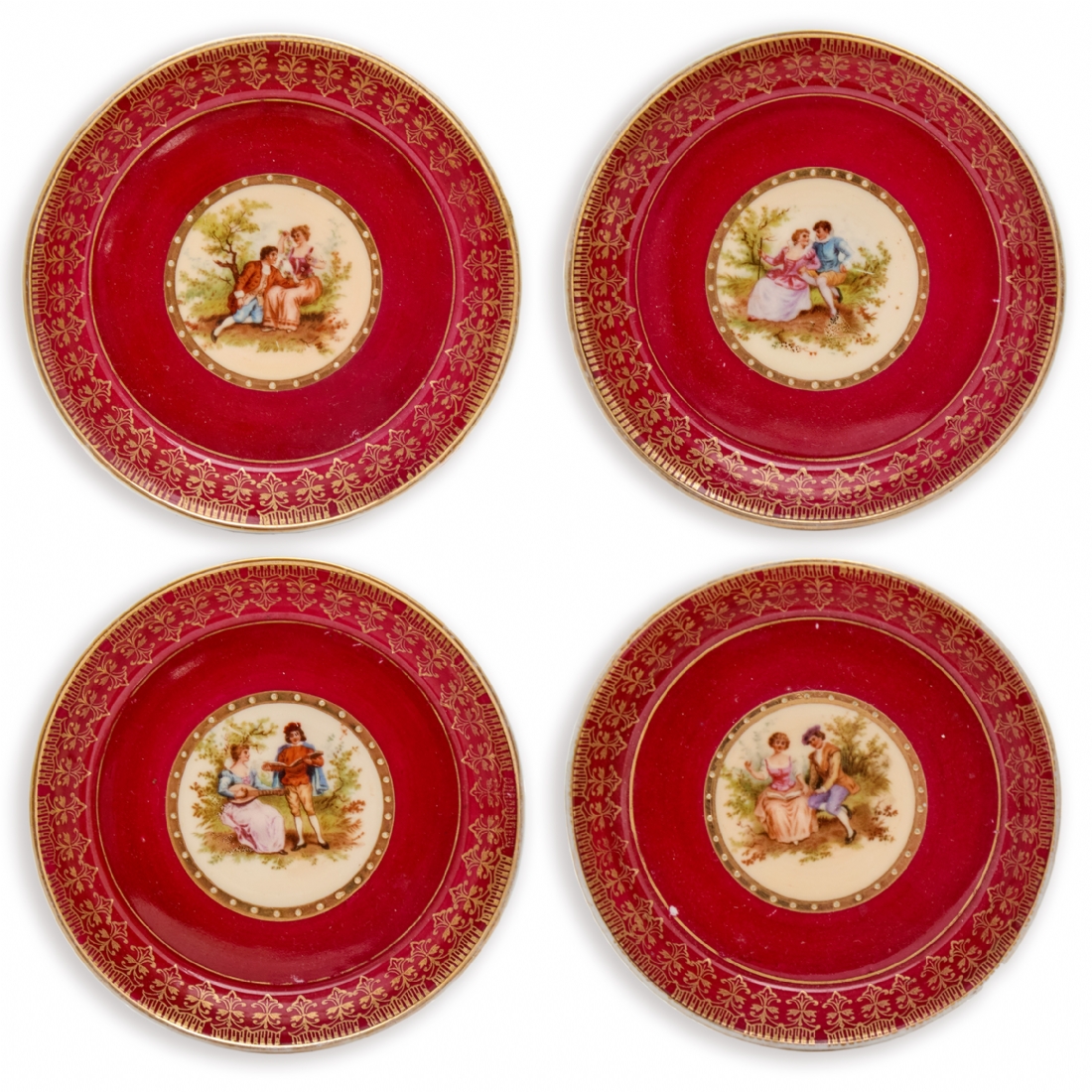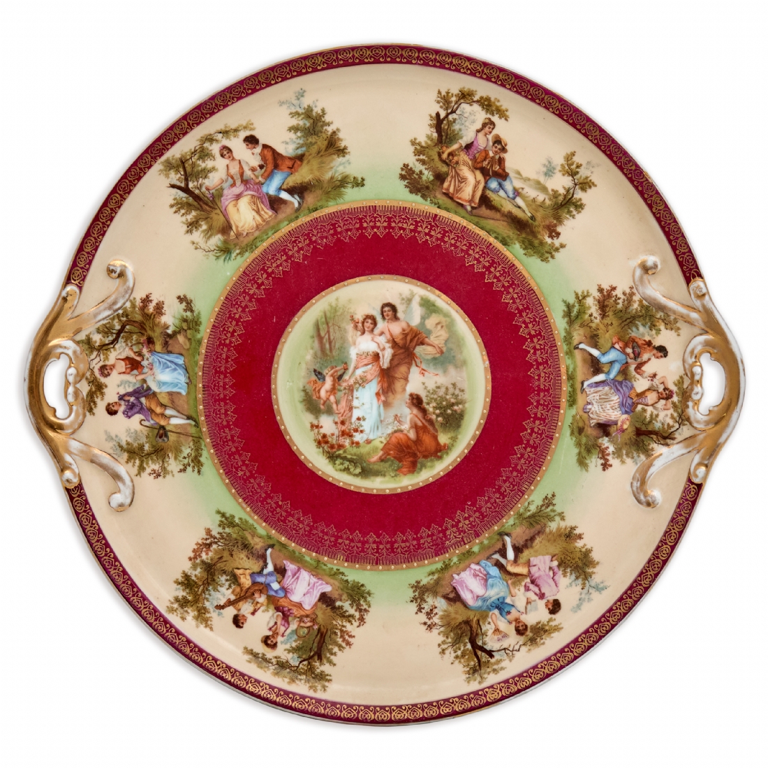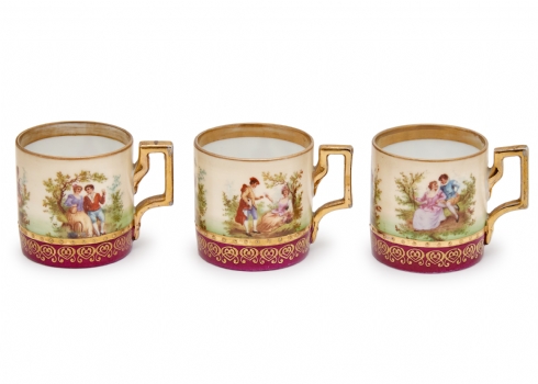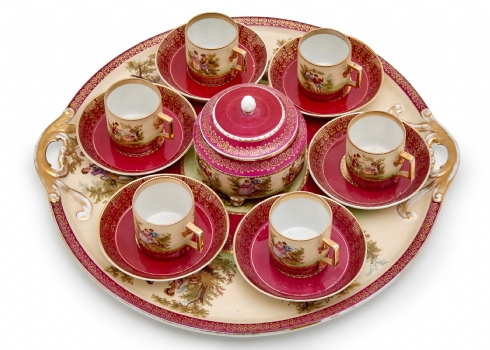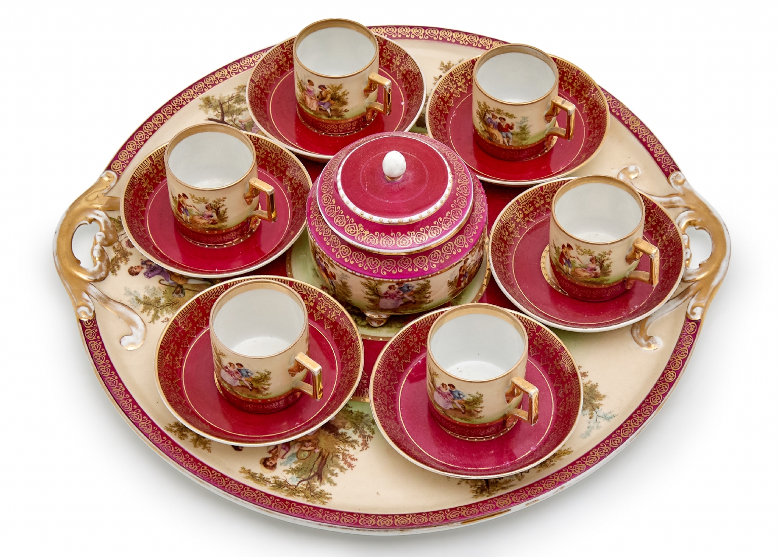 סט מוקה עתיק בסגנון וינה הישן, מעוטר בהדפסים של סצינות חיזור גלנטיות