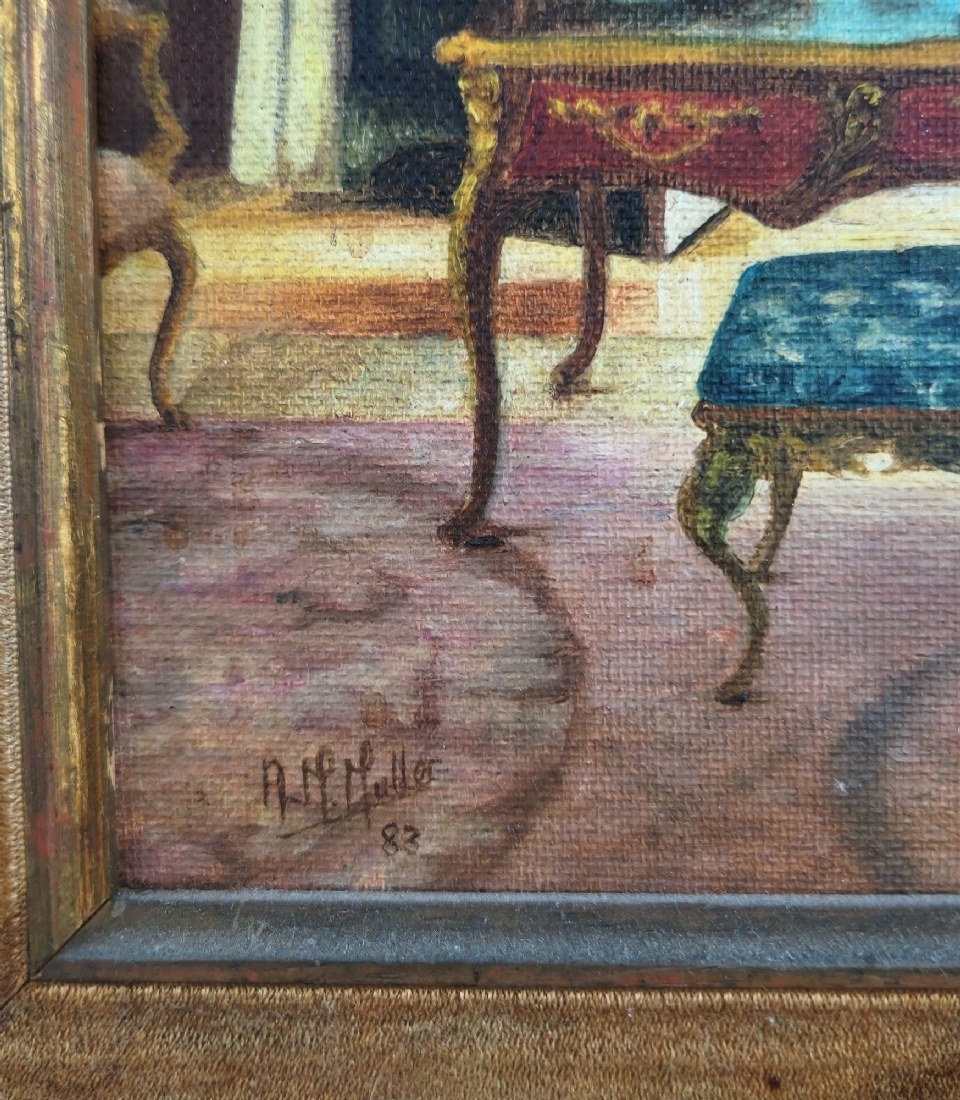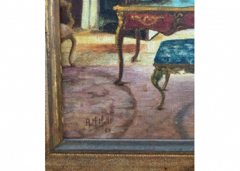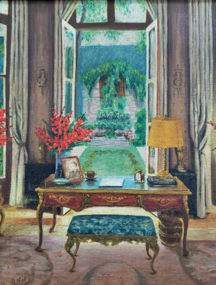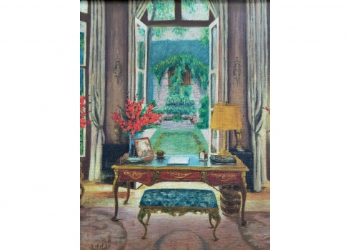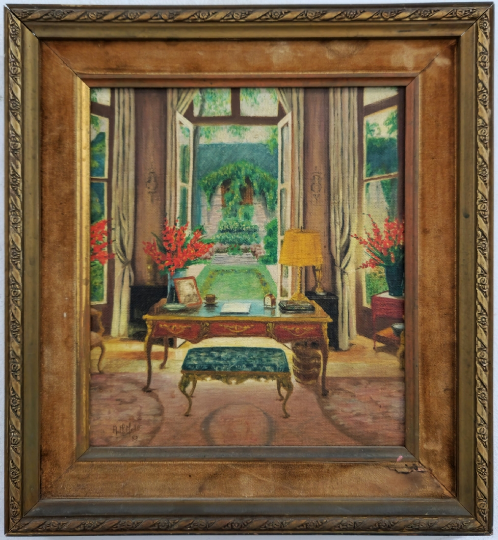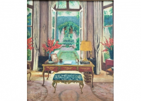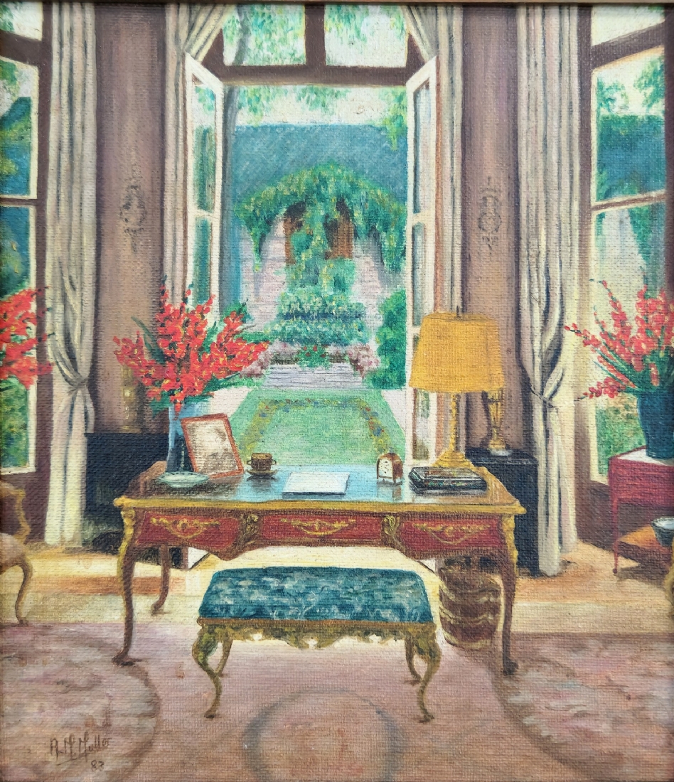 'פנים חדר עם שולחן כתיבה' - שמן על בד צרפתי, חתום ומתוארך 1983