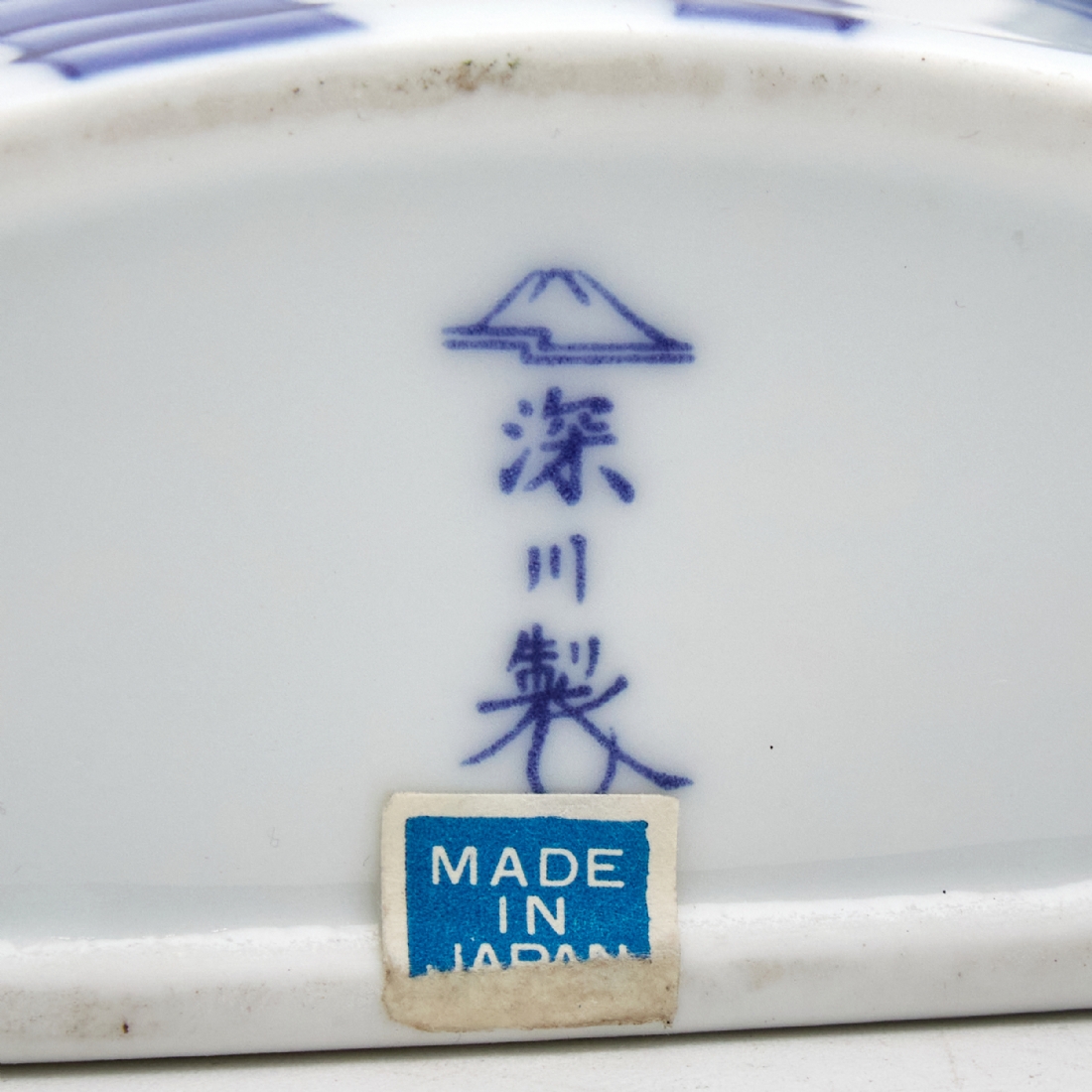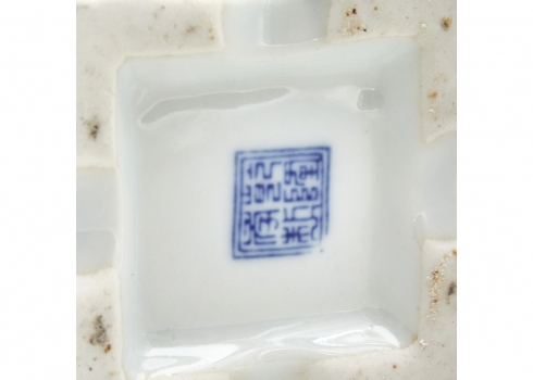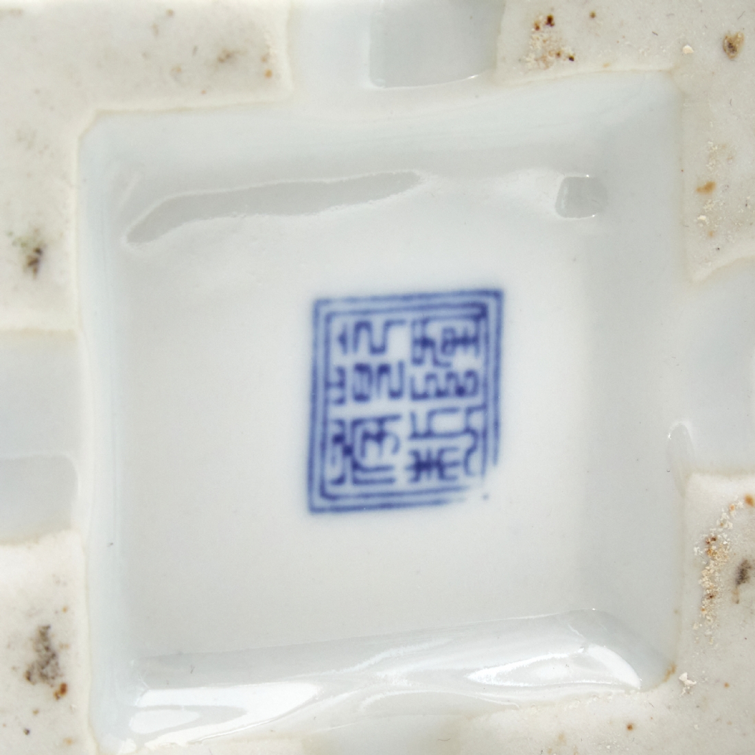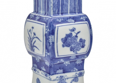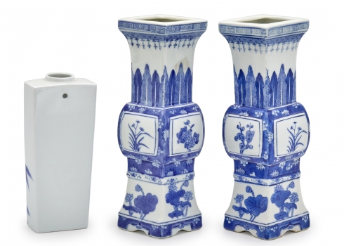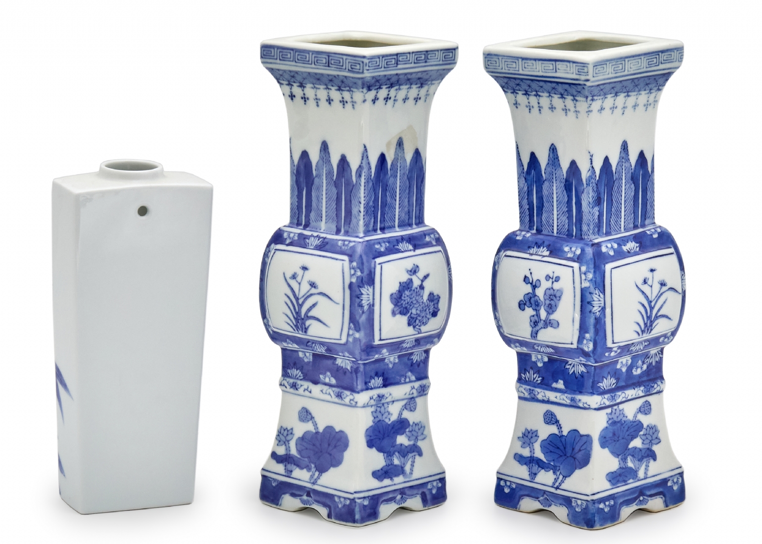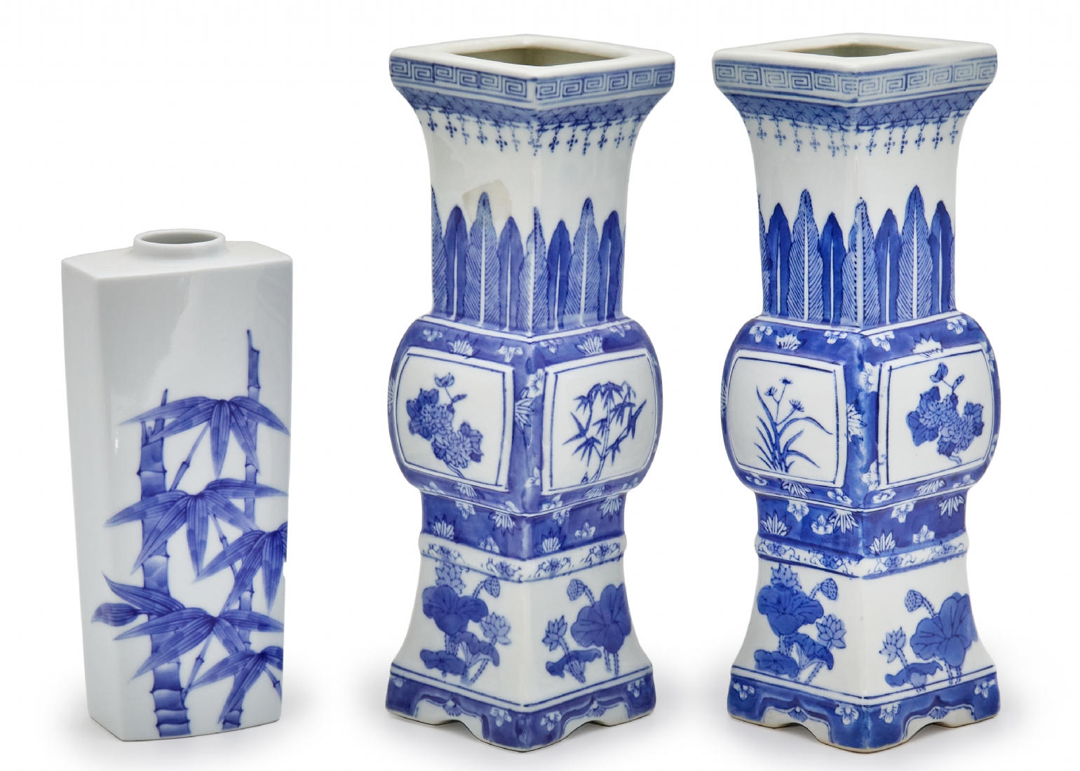 שלושה כדים סינים שונים מעוטרים בצבעי כחול לבן חתומים