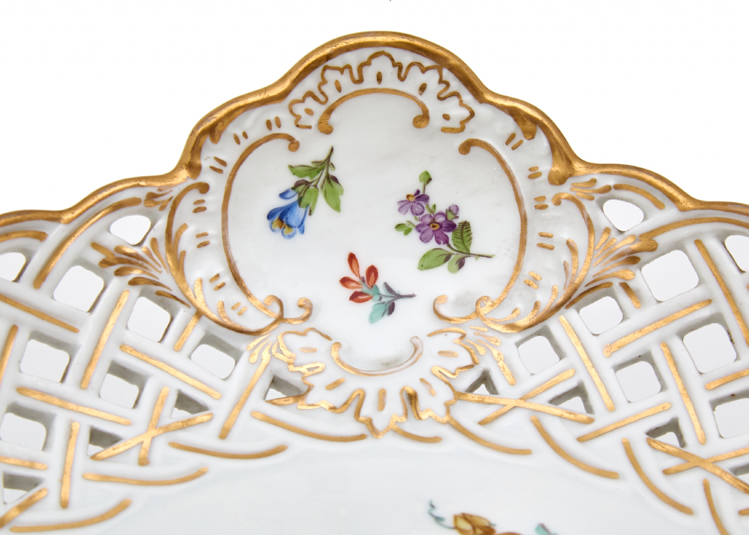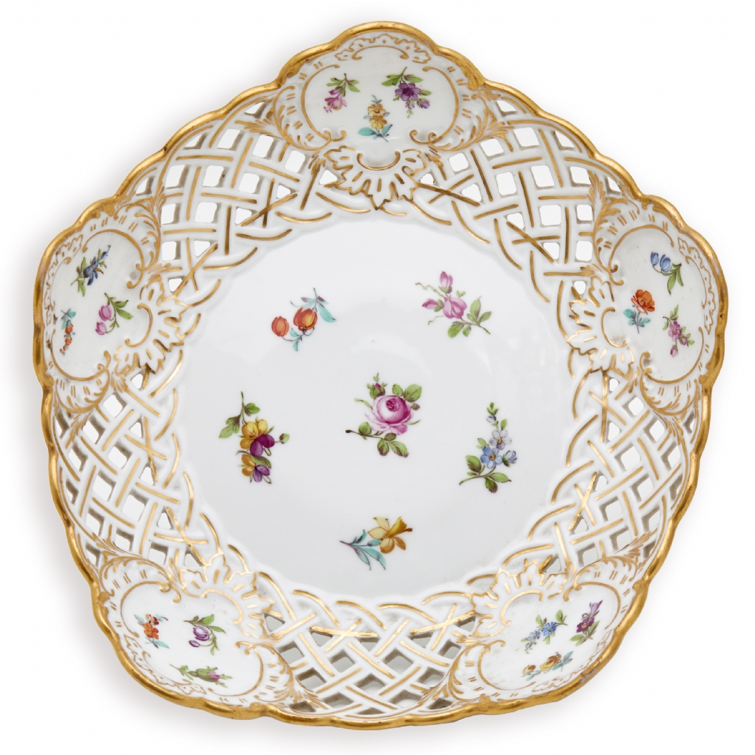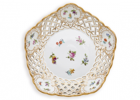 מעוטרים ציורי יד של פרחי גינה גרמנים באמייל ובזהב, חתומים (הקערה היא בעצם חלק עליון של טזה שאיבדה את רגלה)