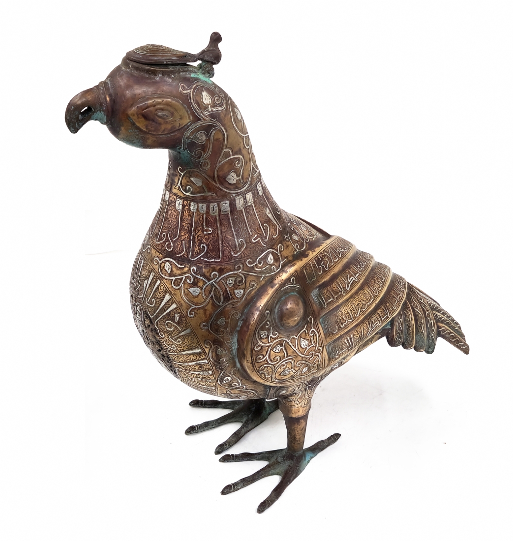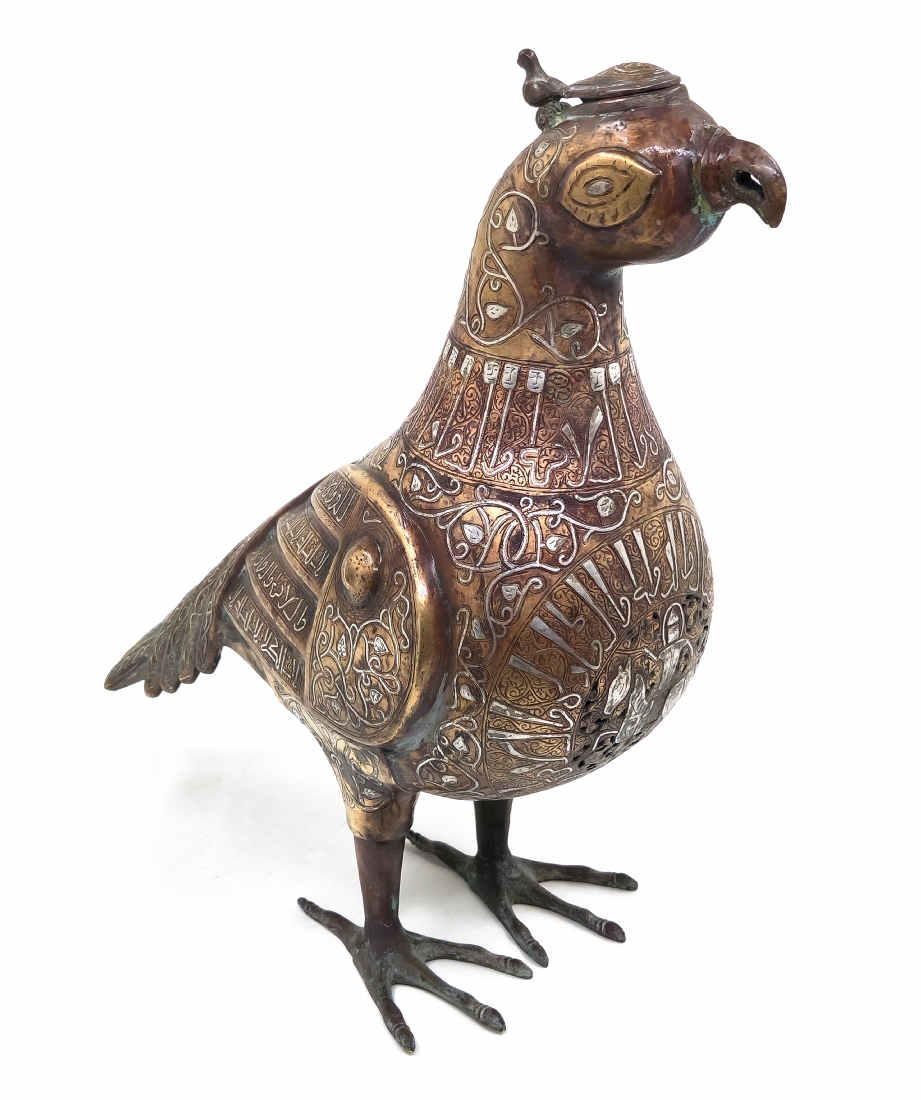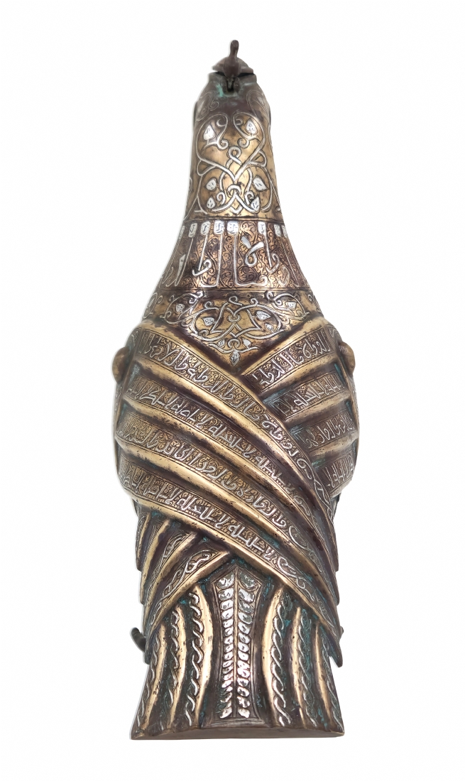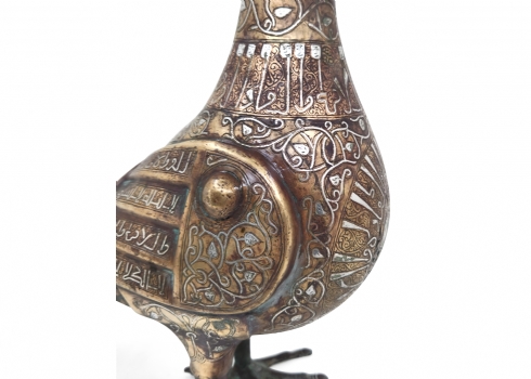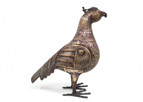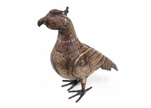 כלי איסלמי בדמות ציפור עשוי בעבודת דמשק (שיבוץ של נחושת וכסף במיקשת פליז)