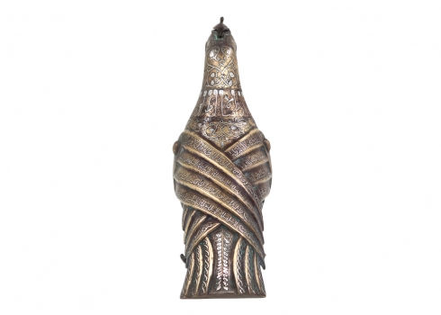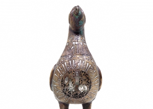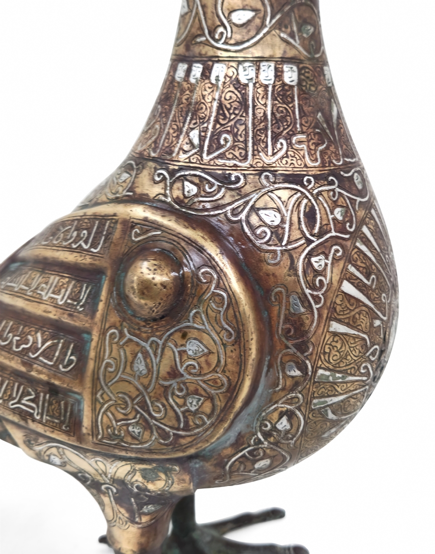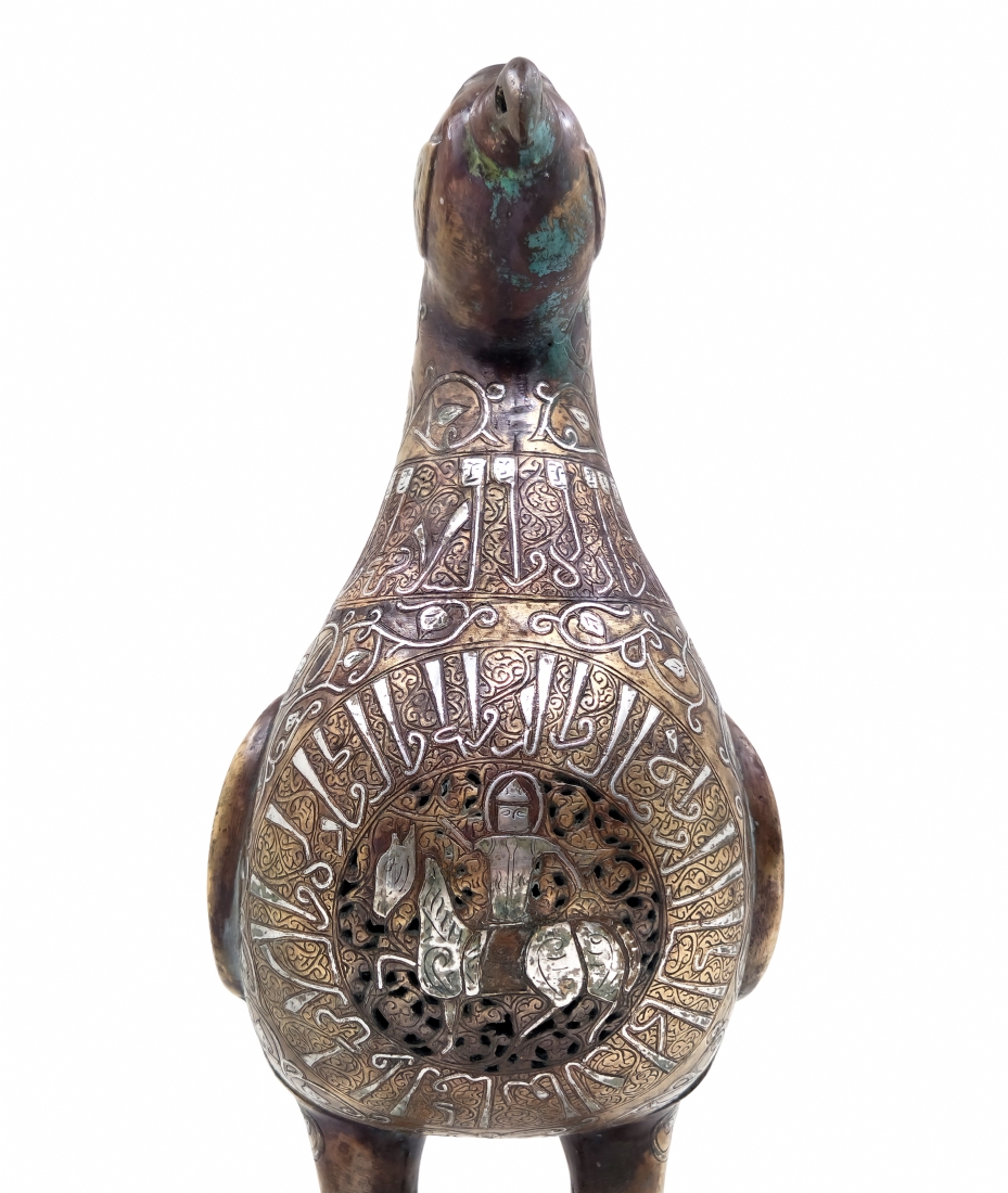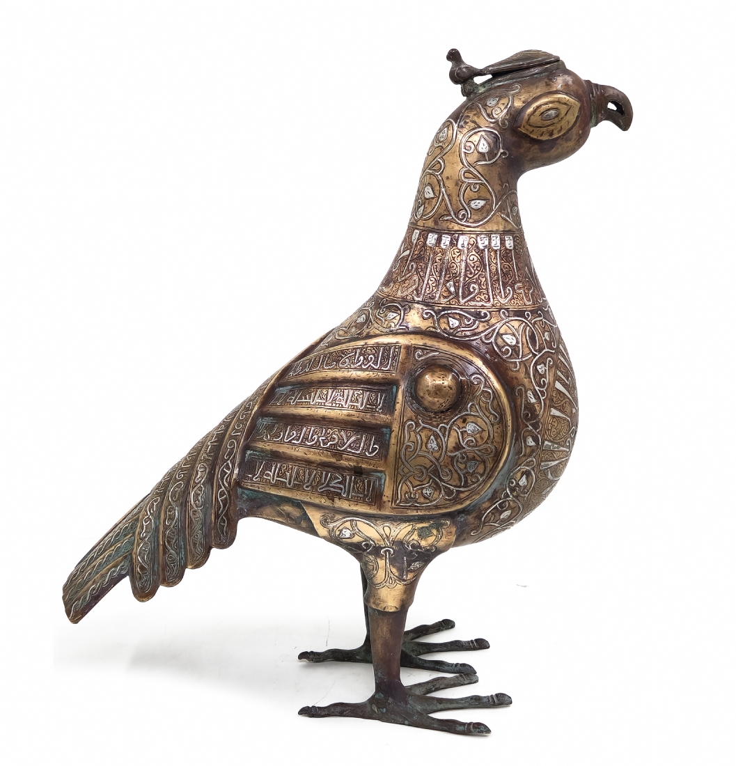 כלי איסלמי בדמות ציפור עשוי בעבודת דמשק (שיבוץ של נחושת וכסף במיקשת פליז)