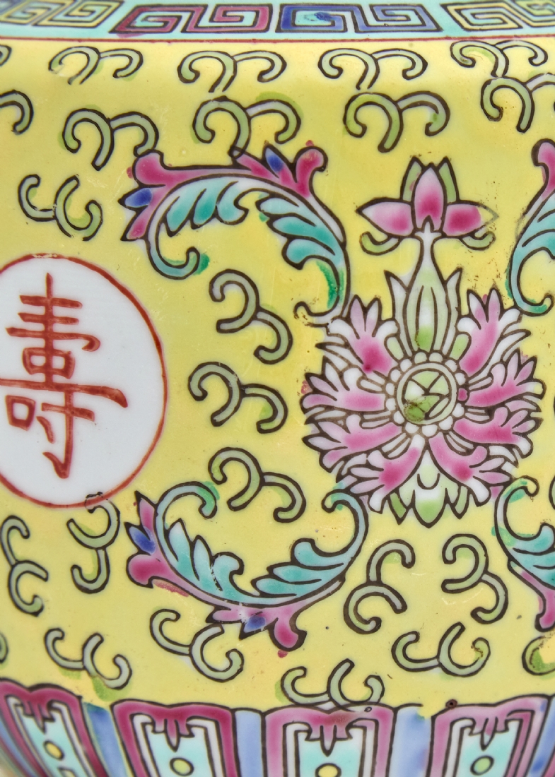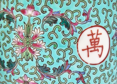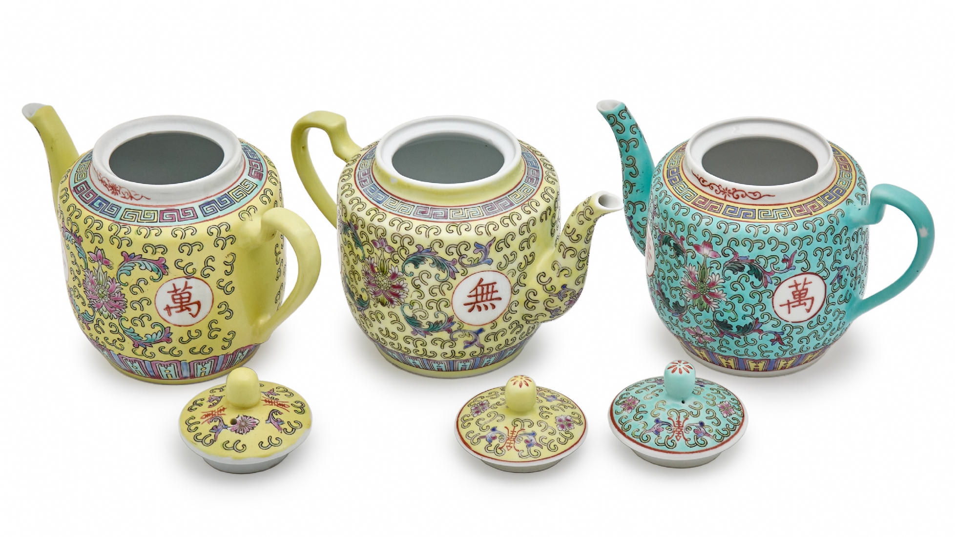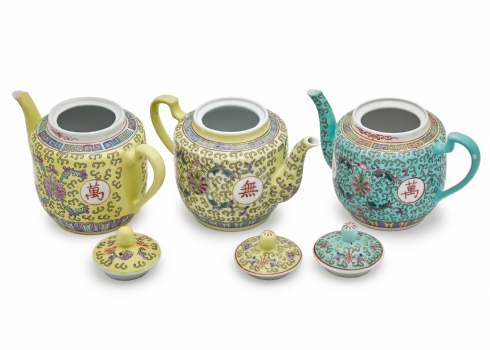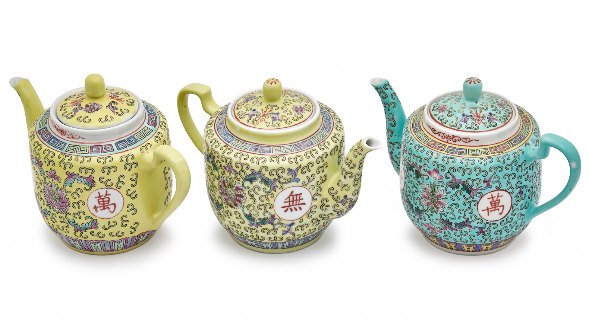 שלושה קומקומי תה סינים עשויים חרסינה מעוטרת באמייל