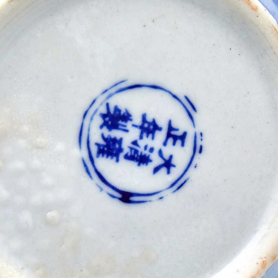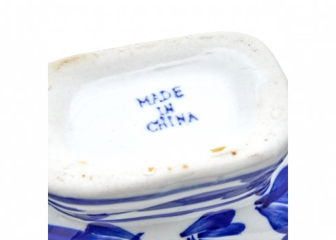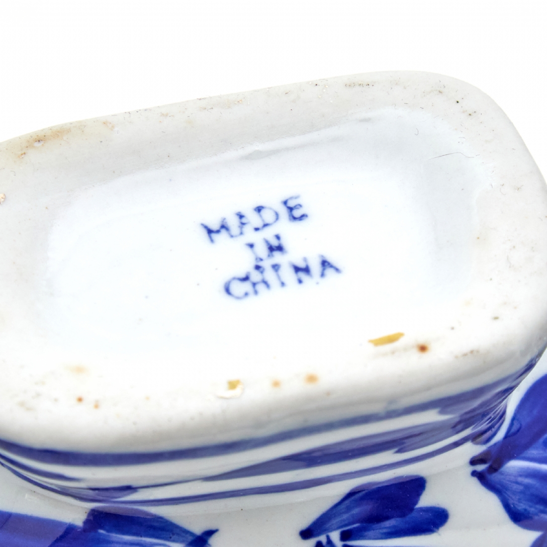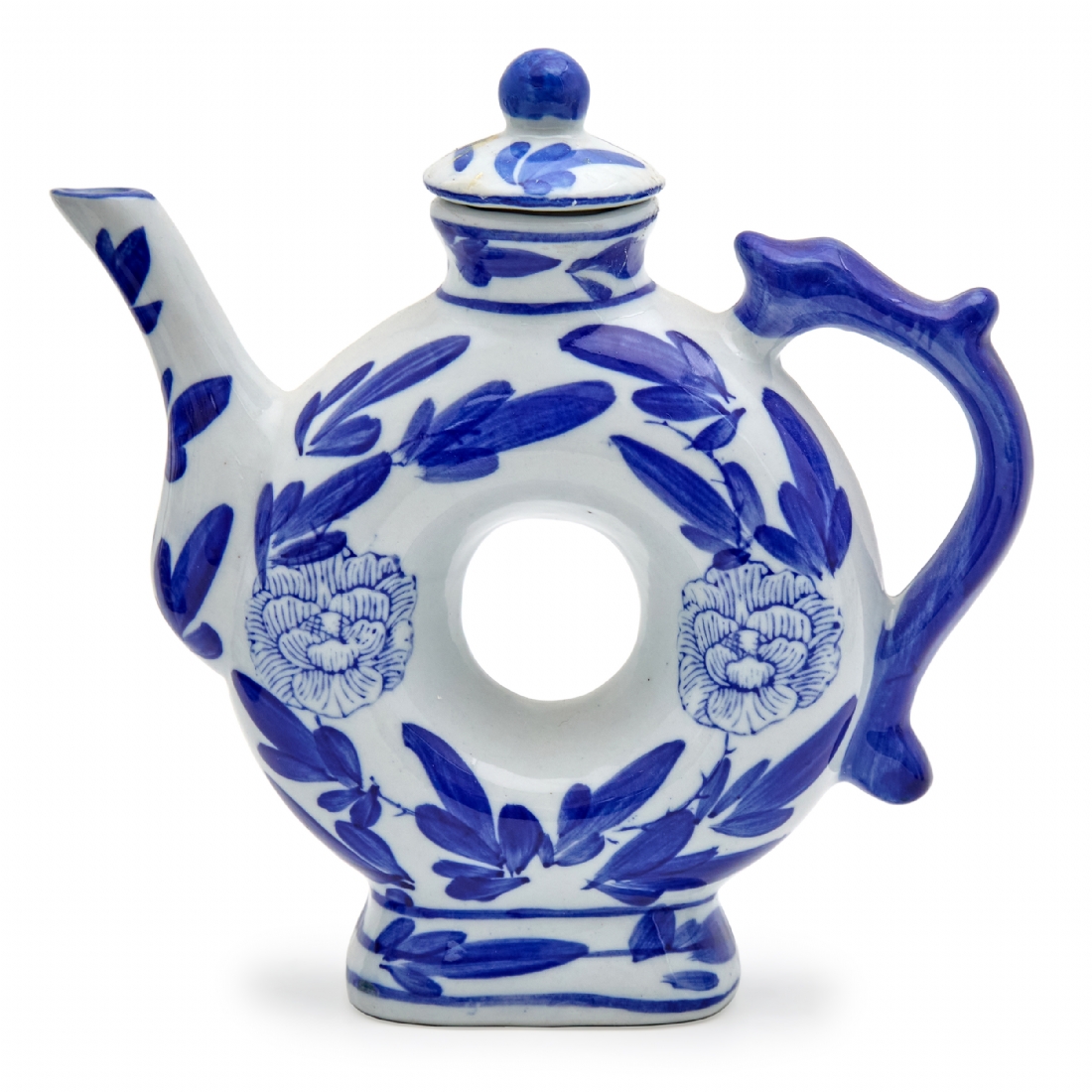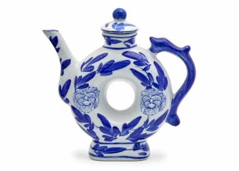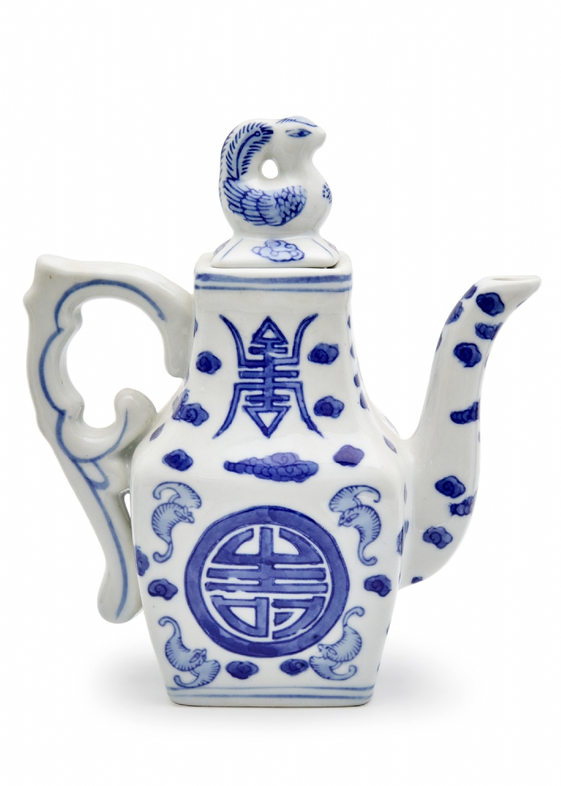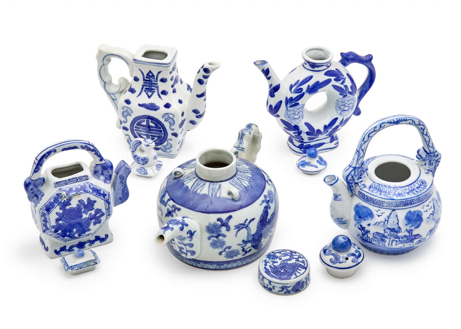 חמישה קומקומי קרמיקה סיניים, יצרנים שונים ודגמים שונים, מעוטרים בכחול לבן