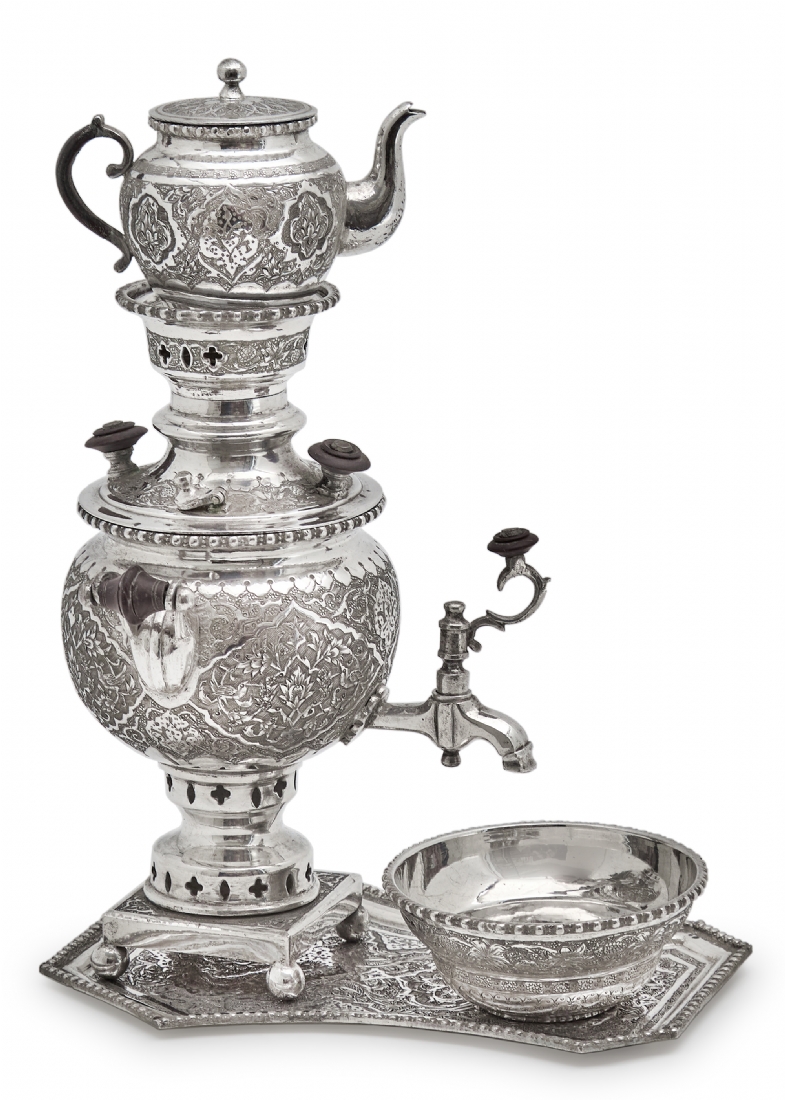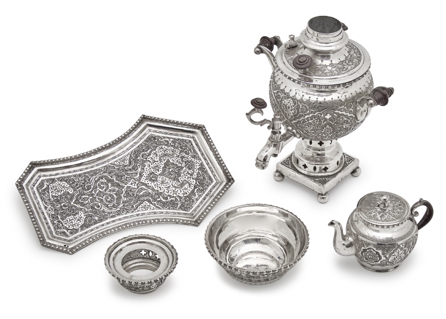 לאספני כלי כסף פרסים עתיקים - סט פרסי עתיק הכולל סמובר, קומקום תה