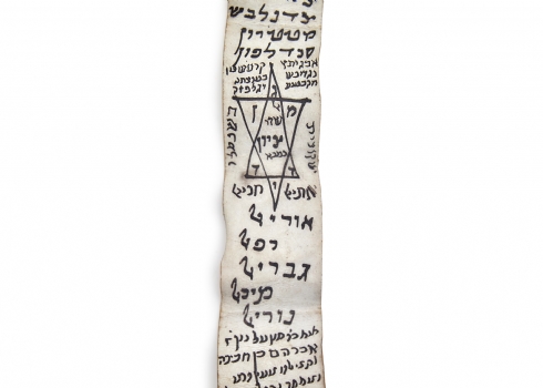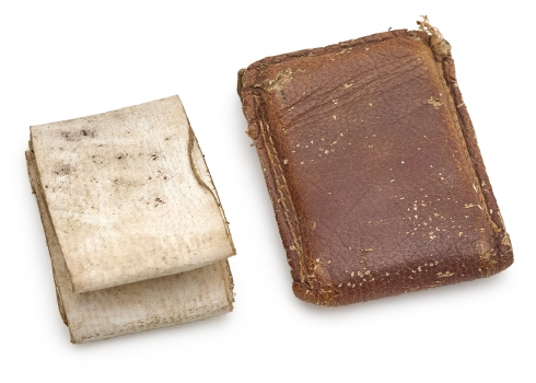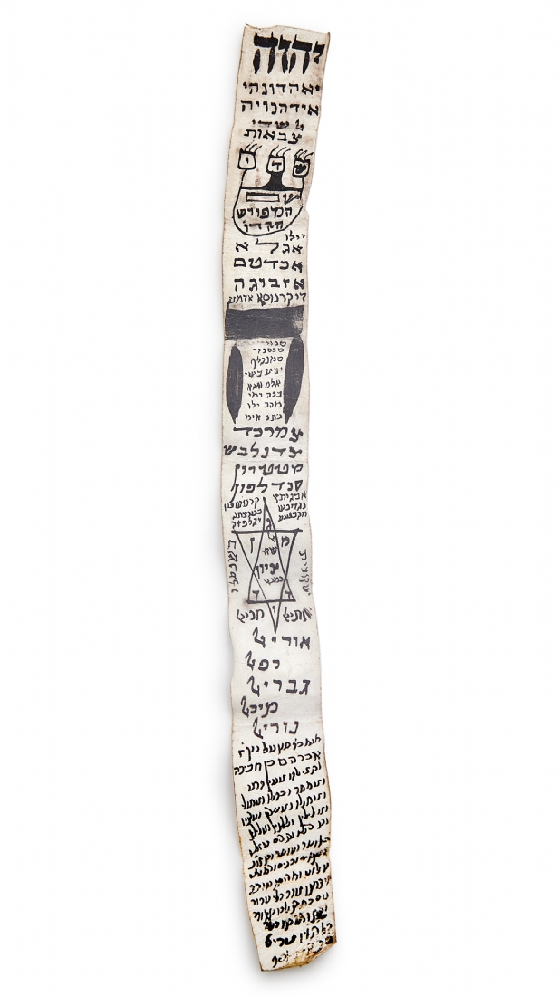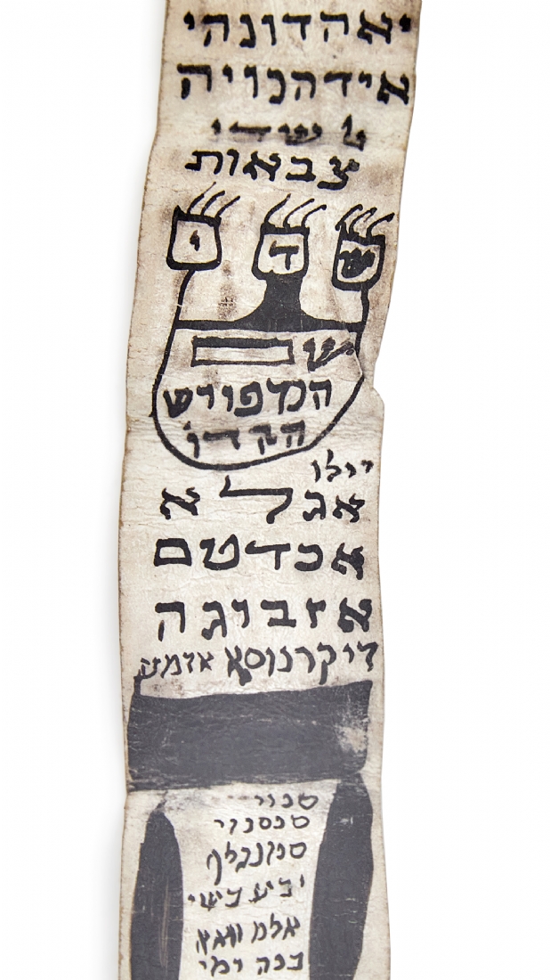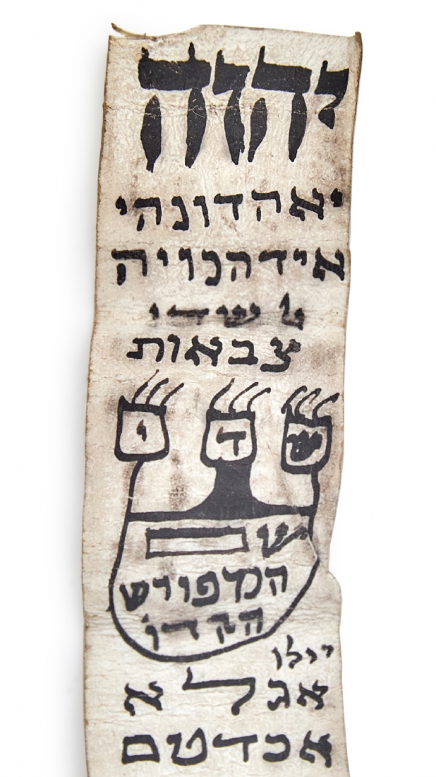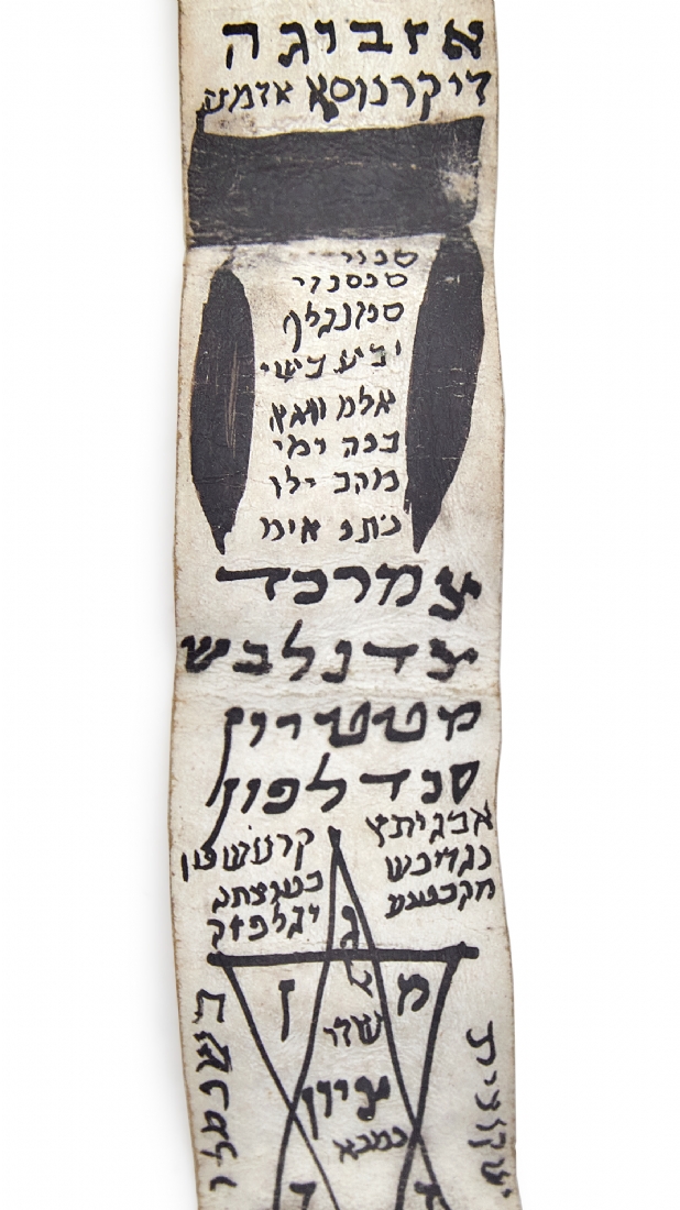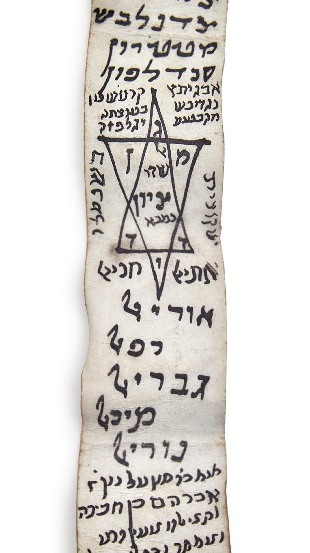 קמע יהודי קבליסטי עתיק על קלף נתון בכיס עור כולל שמות המלאכים וסימנים קבליסטים