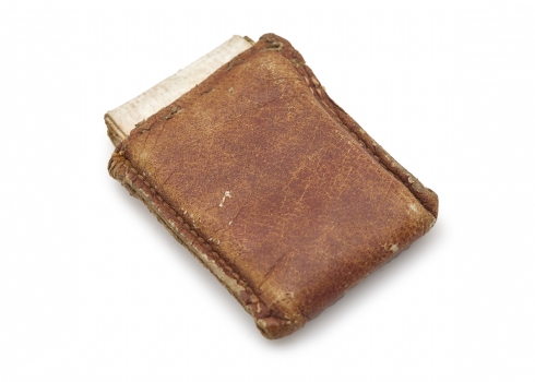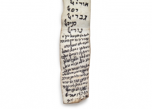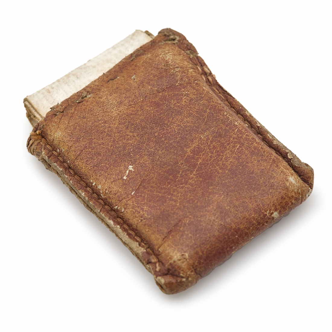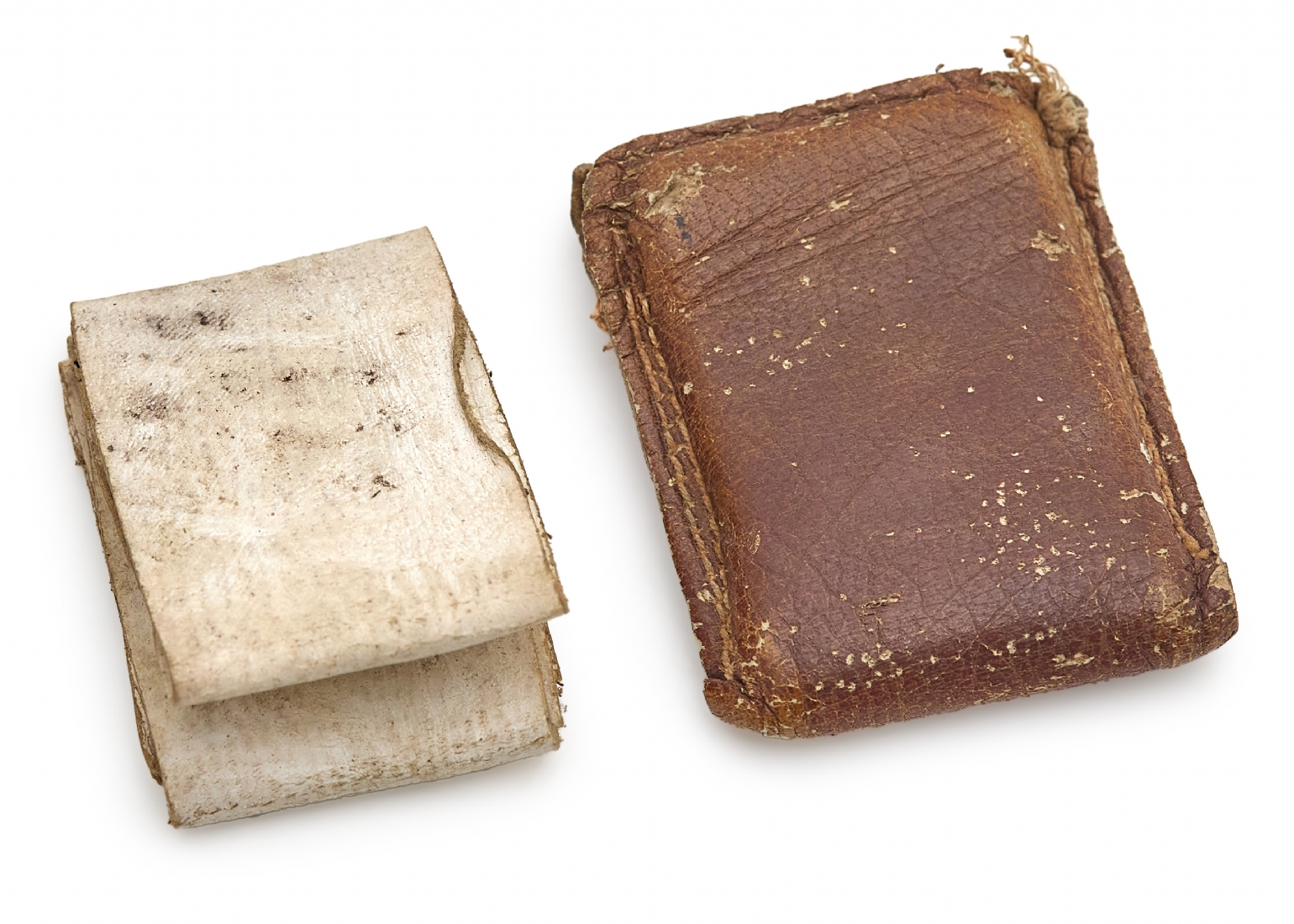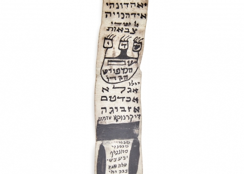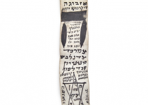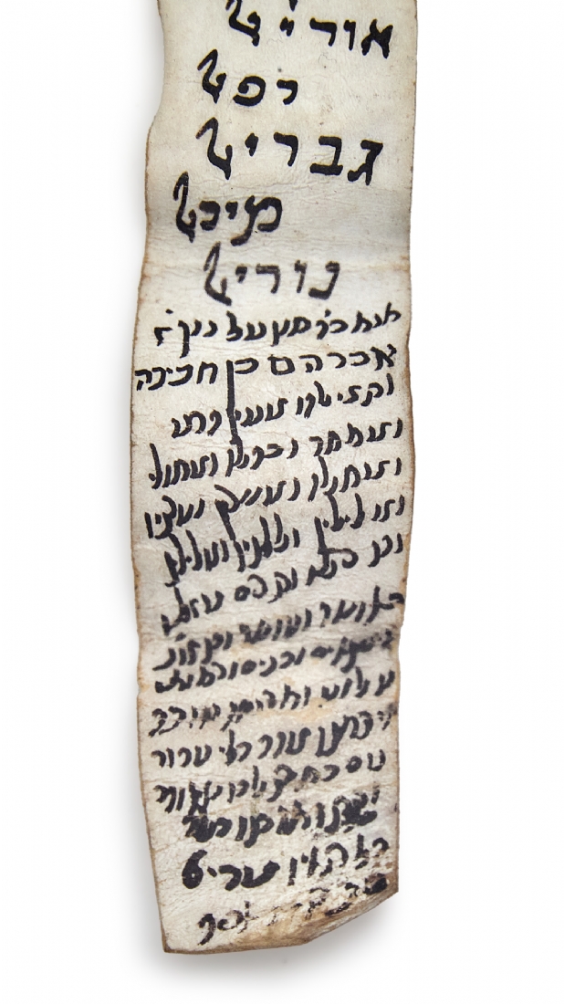 קמע יהודי קבליסטי עתיק על קלף נתון בכיס עור כולל שמות המלאכים וסימנים קבליסטים
