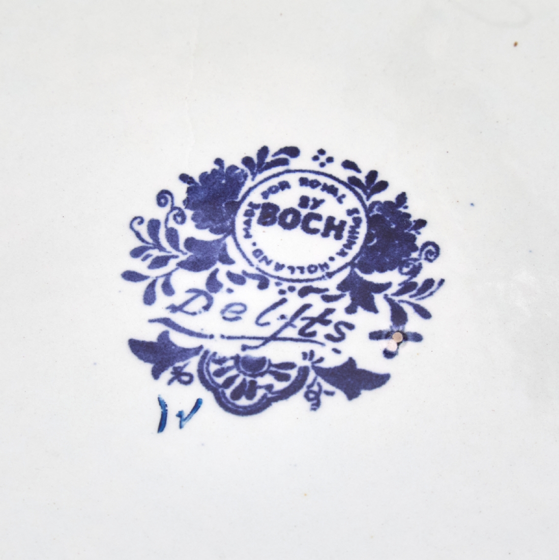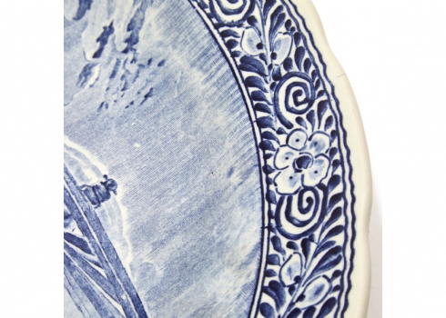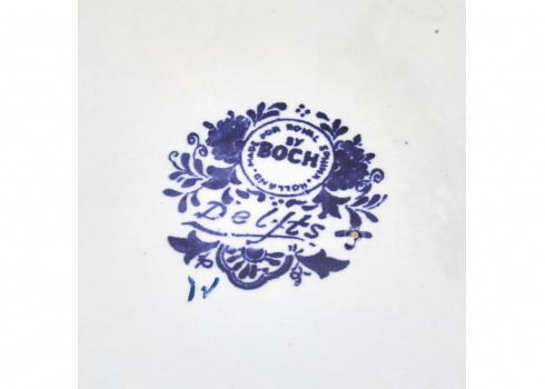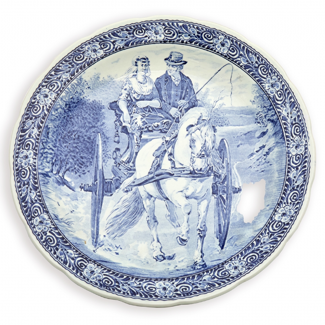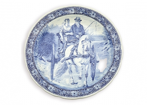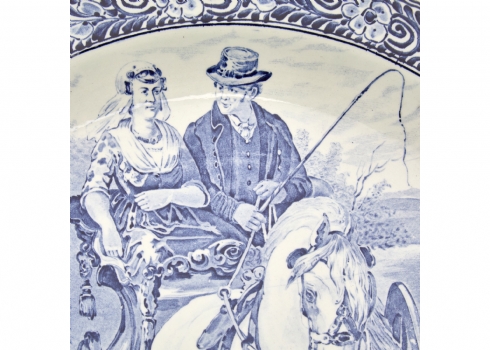 צלחת בלגית תוצרת בוך (BOCH) בסגנון דלפט המתאר זוג בכרכרה