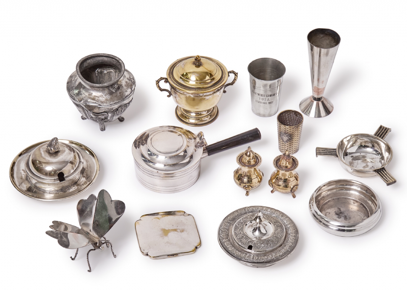 13 כלים שונים, עשוים מתכות שונות, חלקם מצופים כסף, חלקם חתומים