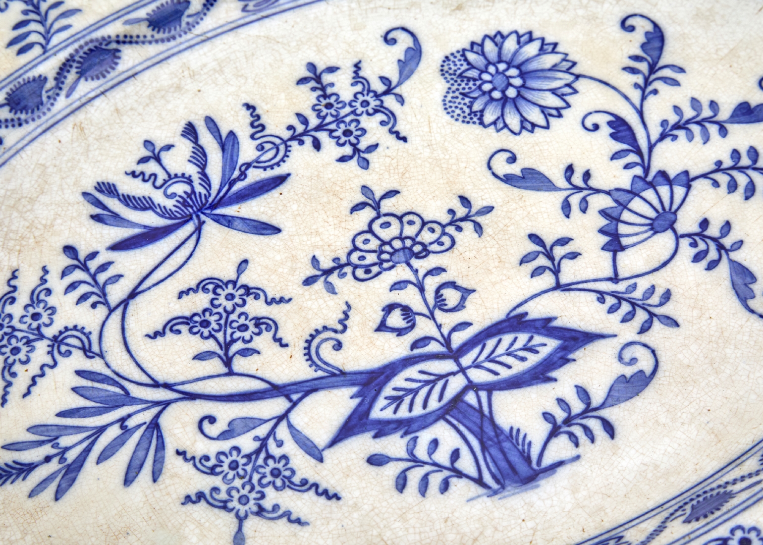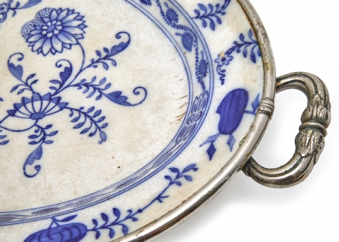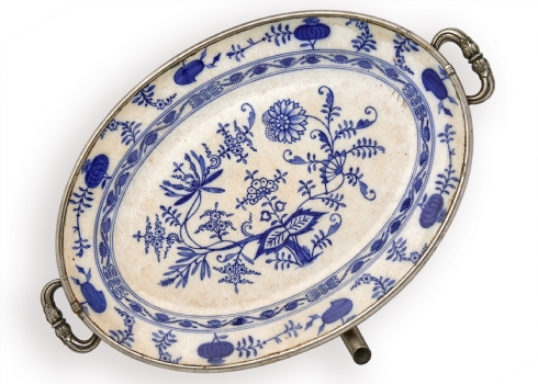 צלחת חימום פורצלן עתיקה – מעוטרת דגם בצל כחול: רוחב כולל ידיות: 48 ס"מ