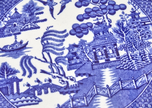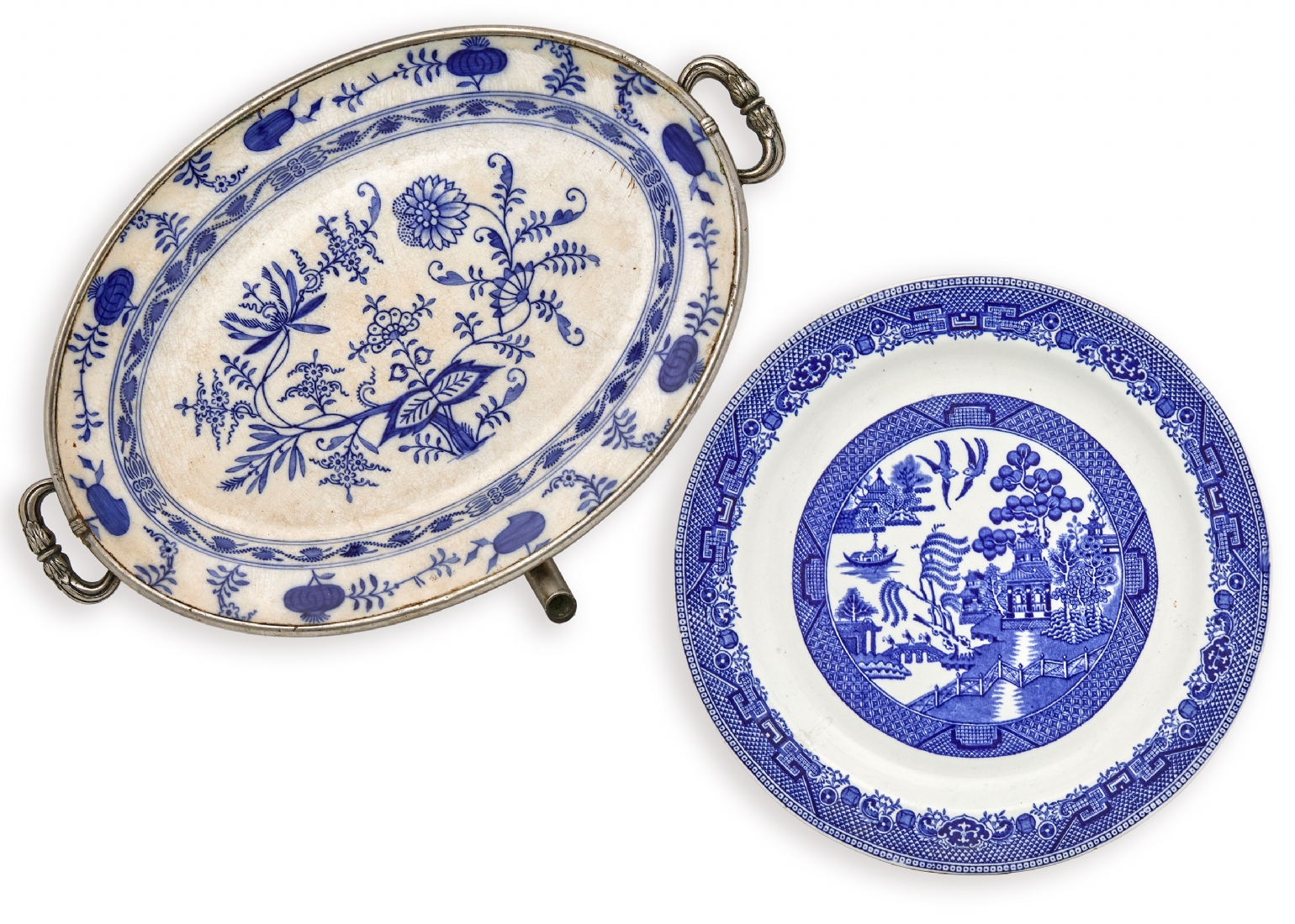 שתי צלחות פורצלן וינטג' - צלחת חימום בצבעי כחול מועבר וצלחת דקורטיבית