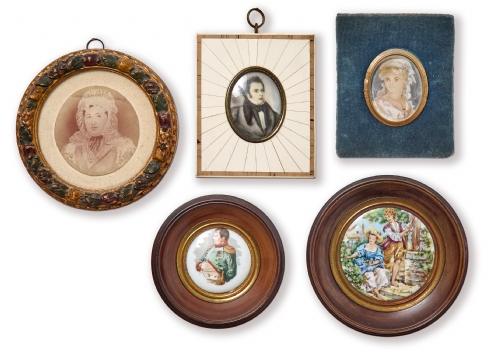 חמש מיניאטורות שונות עשויות חומרים שונים חלקן מודפסות וחלקן מצוירות