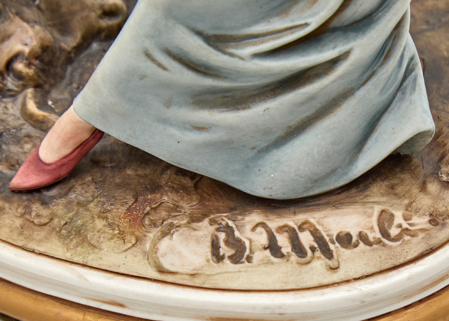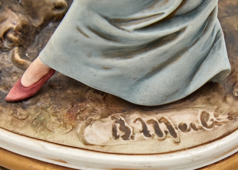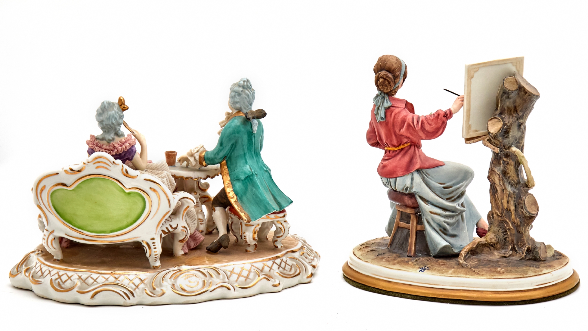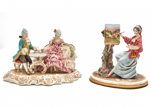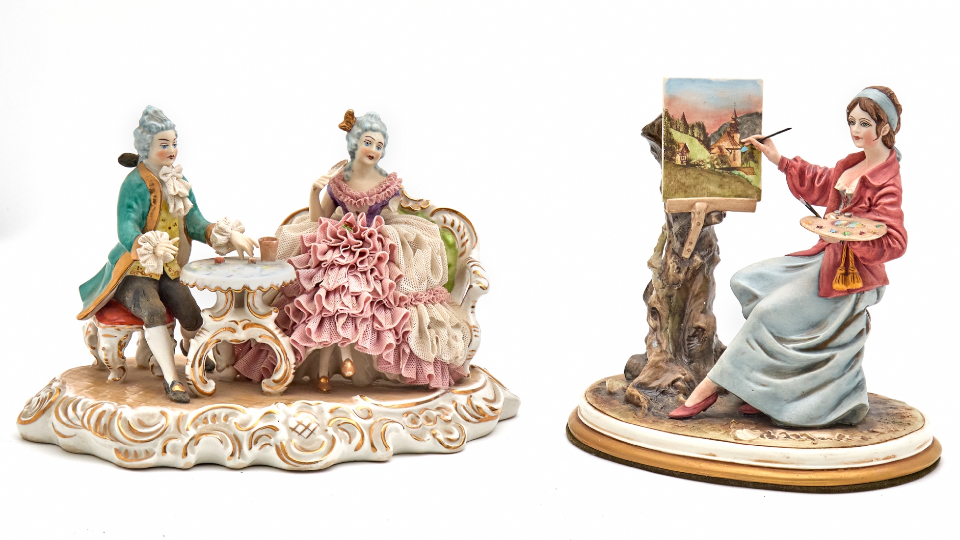 שני פסלי פורצלן: זוג בארוקי ופסל ציירת, חתום